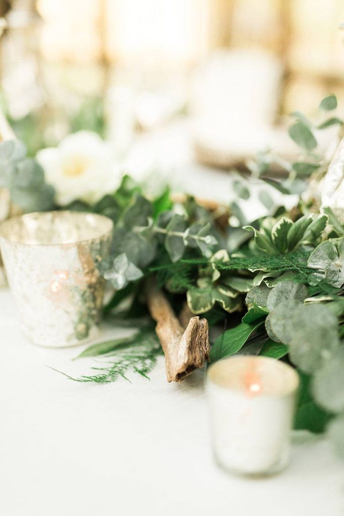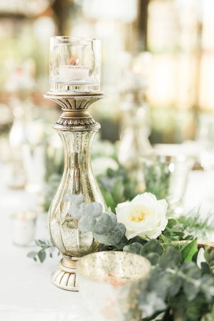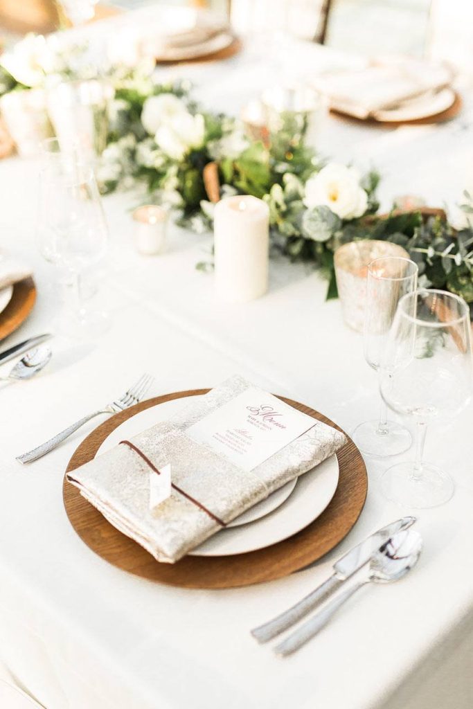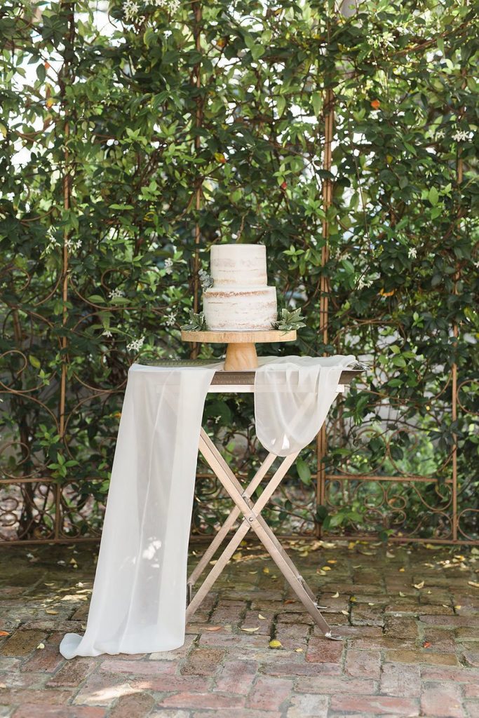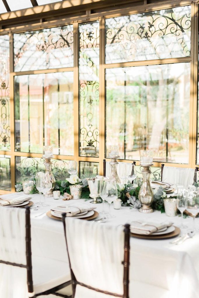 Upon arrival to the property, I was drawn to the lush tropical landscaping, immaculate grounds, European-inspired conservatory and storied past of this landmark. The design of the photo shoot merged the museum’s rich heritage with elements of the seaside nearby. The ethereal white tablescape stood gracefully against the intricate metalwork and emerald glass of the conservatory. Driftwood and mercury glass details mimicked coastal textures while a custom leather invitation suite and wooden subtleties paid respect to the museum’s western influences. Eucalyptus, plumosus and variegated pittosporum were woven into a fragrant garland of greenery punctuated by white garden roses. An organic, wooden pedestal featured a rustic semi-naked wedding cake.