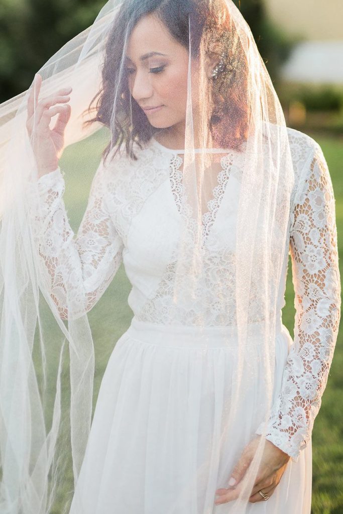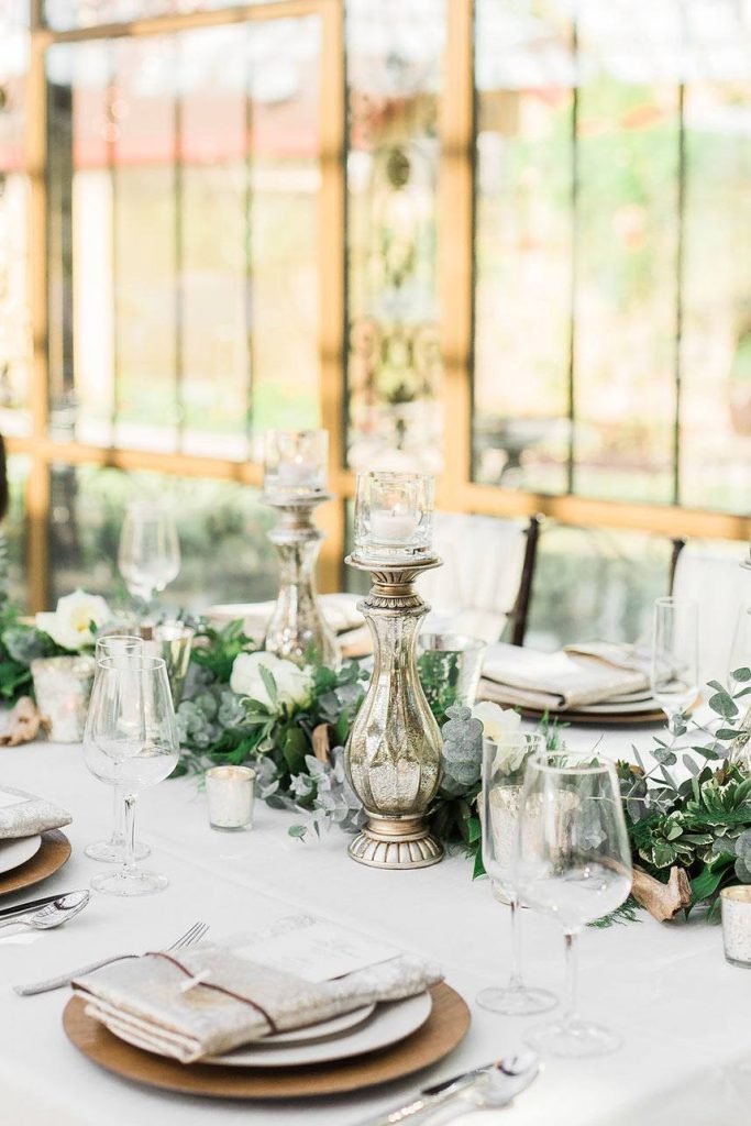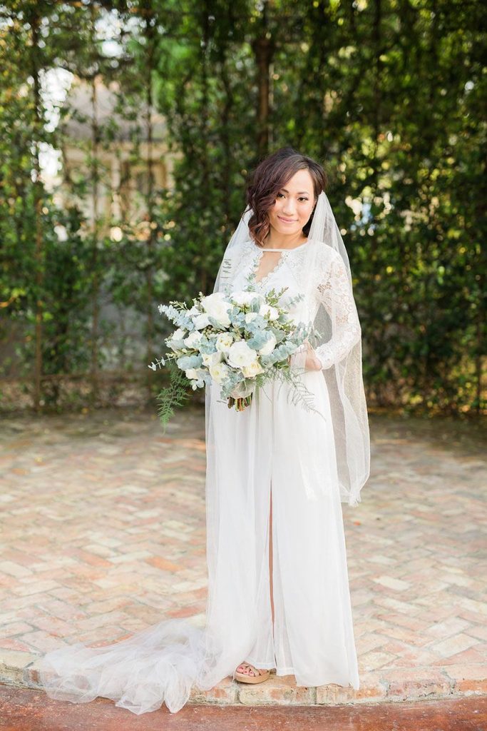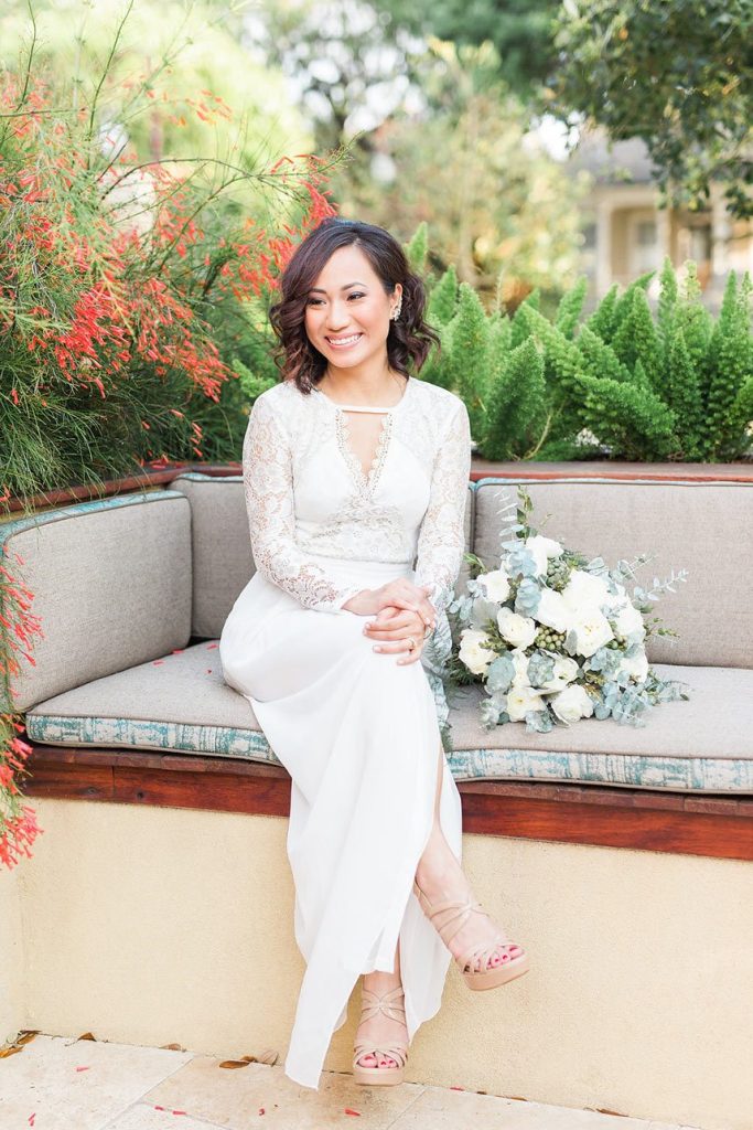 Set against a backdrop of rich architecture framed by lush, tropical foliage, we’re taking notes on how to do a sophisticated seaside-inspired fete, courtesy of this styled shoot filled with coastal wedding inspiration from Jacquelyn Nicole Photography. The Bryan Museum’s storied history around the American West lends elements of style and heritage to the shoot. Scrolling iron work, giant chandeliers and stone arches set the scene perfectly for the airy, glass atrium-like dining setting. The elegant dark wood table from What’s the Occasion donned with breezy white linens, a garland arrangement of eucalyptus and white garden roses, and beachy decor of mercury glass and wood elements drew attention in the golden evening light of the all-windowed space. Keeping with the natural elements, the model bride’s long-sleeve lace and chiffon gown was accessorized by a cathedral-length veil made to catch every breeze in its sheer, floating fabric. From overall ambiance to minuscule details, we’ve fallen for every bit of this tasteful take on elevated coastal wedding design! Enjoy!