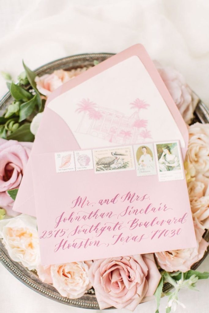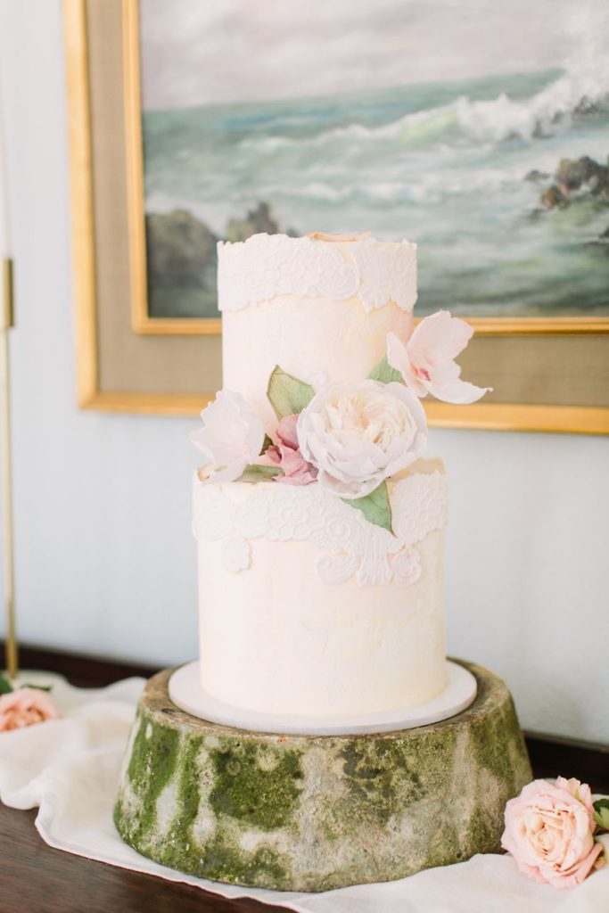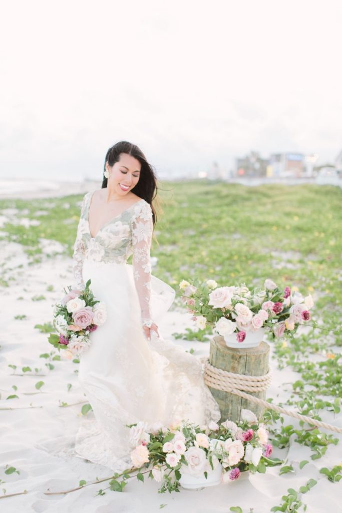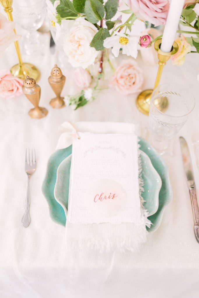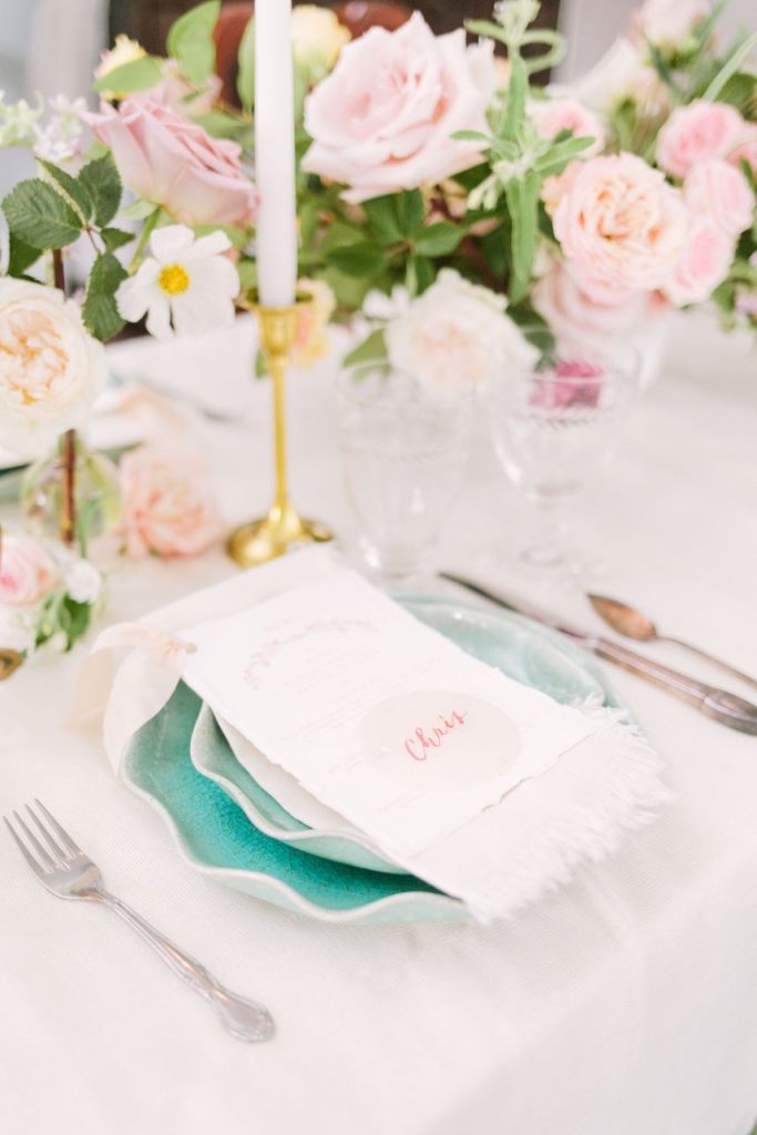 This elegant coastal wedding inspiration is here just in time for summer, and no matter where you live, your wedding doesn’t have to be confined to the themes of land. With a soft palette of blush, seafoam and ivory, this styled shoot captured by Mustard Seed Photography gives a nod to vintage detail alongside the modern floral design of lush, pastel blooms. The model bride is absolutely gorgeous with hair and makeup styled by Crown of Glory Beauty. We love her natural but eye-catching shadow and full lashes, as well as, her punchy pink lip. This invitation suite from Dreams & Nostalgia has us wishing this was our big day, and the calligraphy on menus and place cards are beautifully scripted to match. The two-tiered cake by Shelby Elizabeth Cakes is elegant and understated, lightly decorated with fondant lace and fresh blooms. There’s nothing about this coastal wedding inspo that we don’t SEA-riously love. Cheers!
