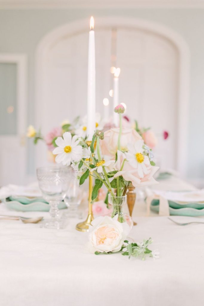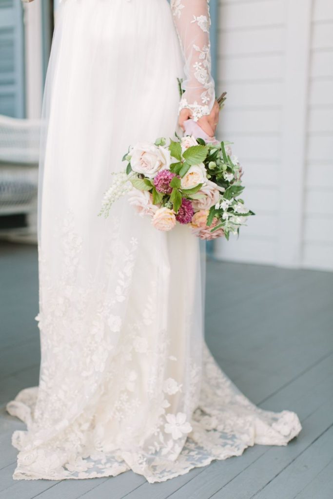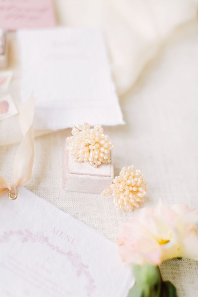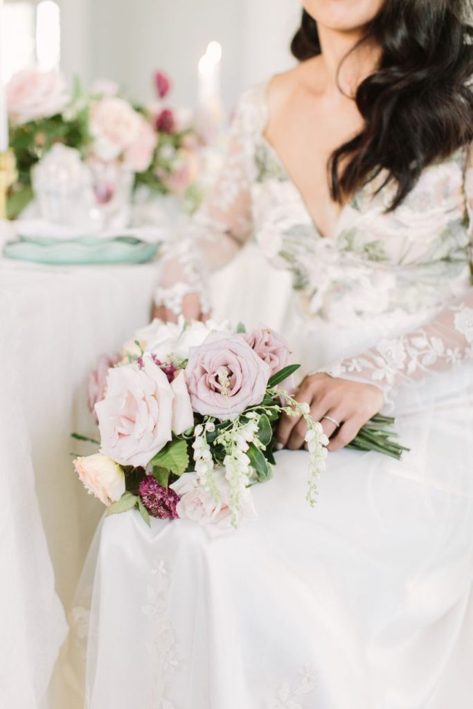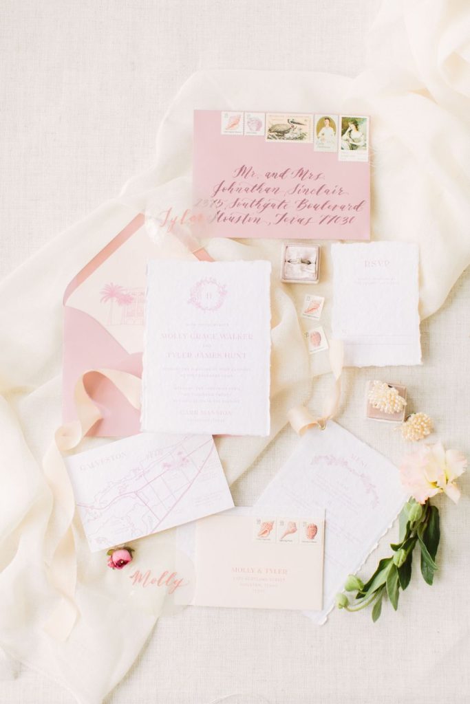 This elegant coastal wedding inspiration is here just in time for summer, and no matter where you live, your wedding doesn’t have to be confined to the themes of land. With a soft palette of blush, seafoam and ivory, this styled shoot captured by Mustard Seed Photography gives a nod to vintage detail alongside the modern floral design of lush, pastel blooms. The model bride is absolutely gorgeous with hair and makeup styled by Crown of Glory Beauty. We love her natural but eye-catching shadow and full lashes, as well as, her punchy pink lip. This invitation suite from Dreams & Nostalgia has us wishing this was our big day, and the calligraphy on menus and place cards are beautifully scripted to match. The two-tiered cake by Shelby Elizabeth Cakes is elegant and understated, lightly decorated with fondant lace and fresh blooms. There’s nothing about this coastal wedding inspo that we don’t SEA-riously love. Cheers!