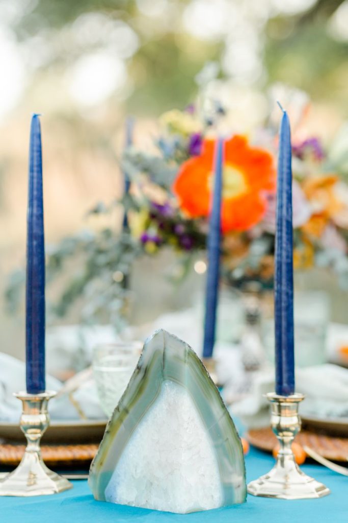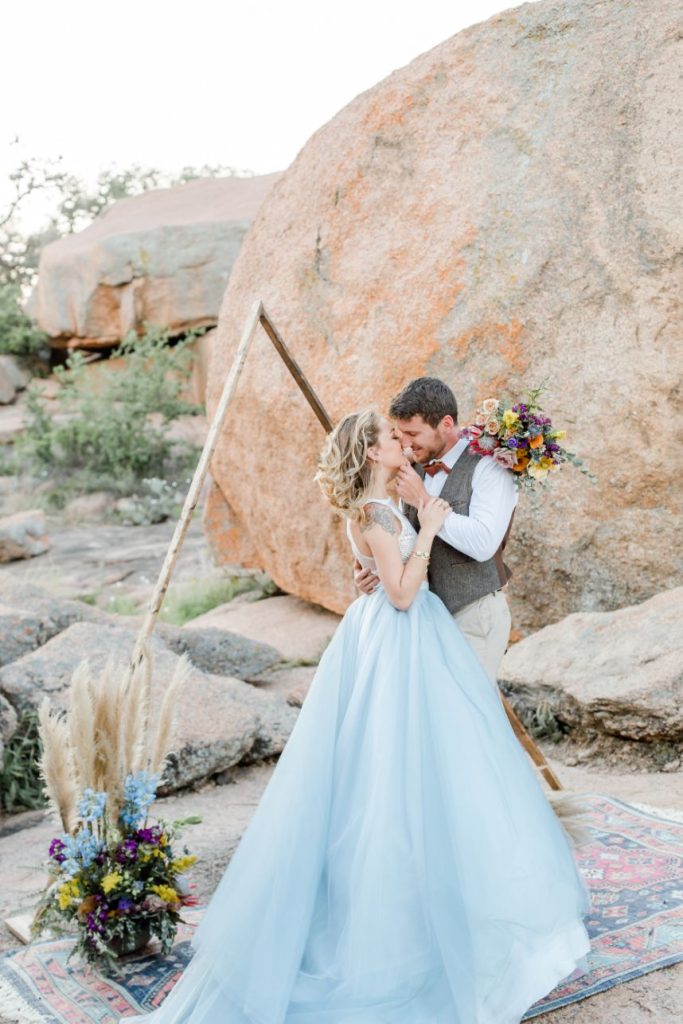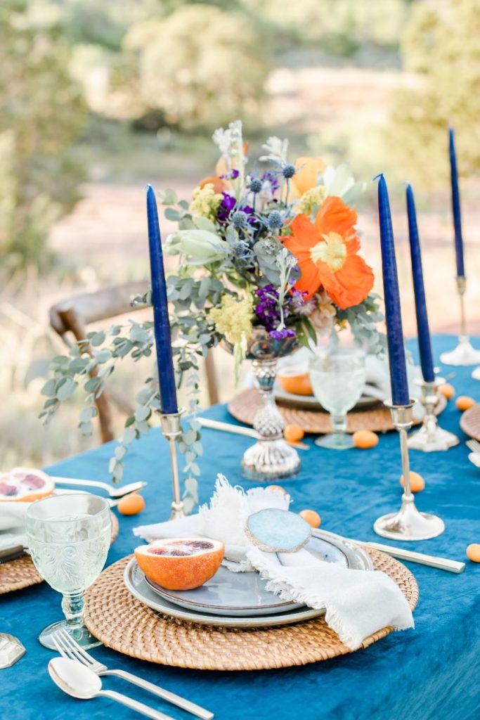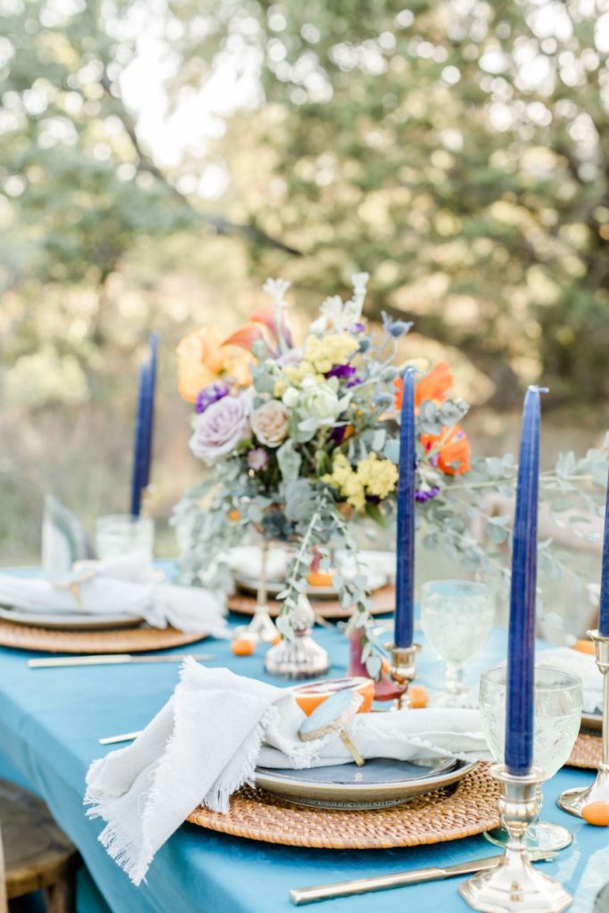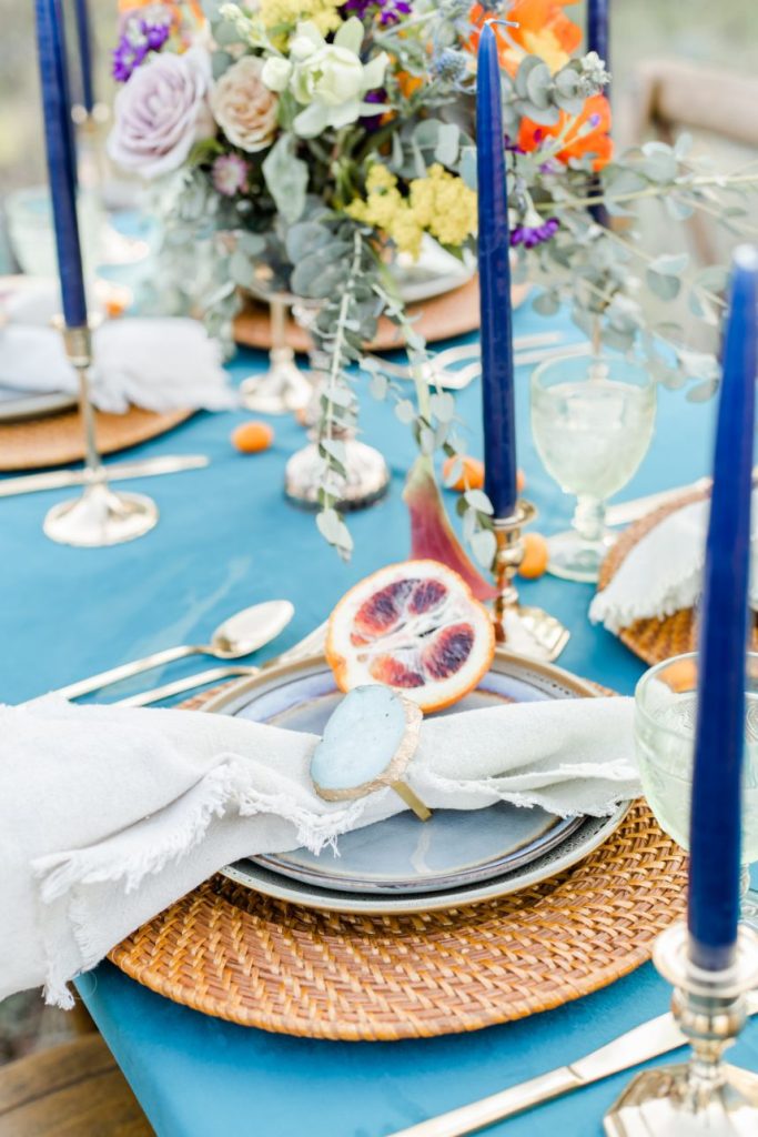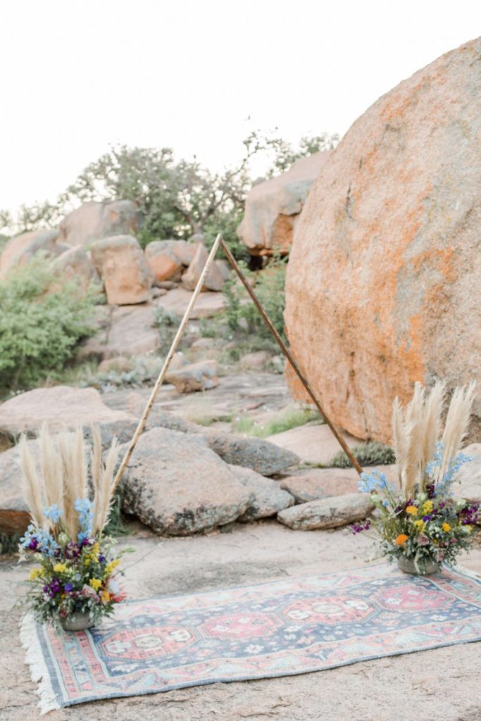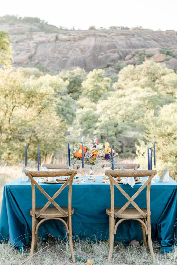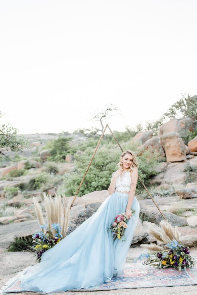 With bright, citrusy accents on a bold blue canvas beneath a Texas Hill Country sunset, this colorful boho styled shoot from Whimsical Events inspires us for a beautiful summertime celebration! The dynamic team at Whimsical Events traveled northwest to the Fredericksburg area to set up this scene at Enchanted Rock, a regal Texas landscape staple perfect for the modern, southwest vibes of this lovely al-fresco wedding scene. Textured details everywhere you turn mirror the natural surroundings, from the pampas grass to the woven chargers and boho ground-level lounge area. Wanting to bring in brightness and contrast to the aesthetic, the Whimsical Events ladies used deep teal linens, blue candlesticks, orange citrus accents and colorful boho florals to make the tabletop truly pop. We love the altar area with the geometric wooden arch – not to mention the bride’s one-of-a-kind blue skirt that flows in the breeze so beautifully! Take a cue from the work of Whimsical Events and don’t be afraid to embrace color and texture for your big day. They can complement each other perfectly! Cheers!