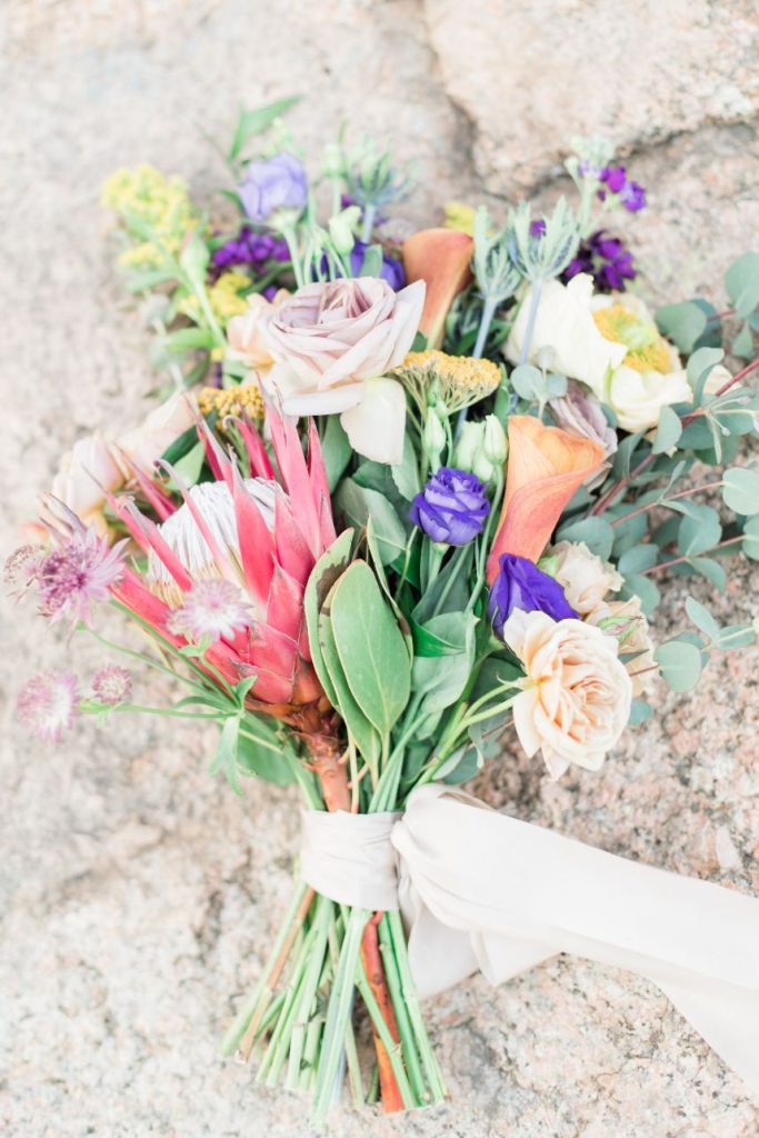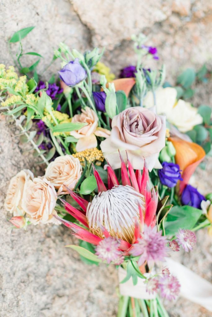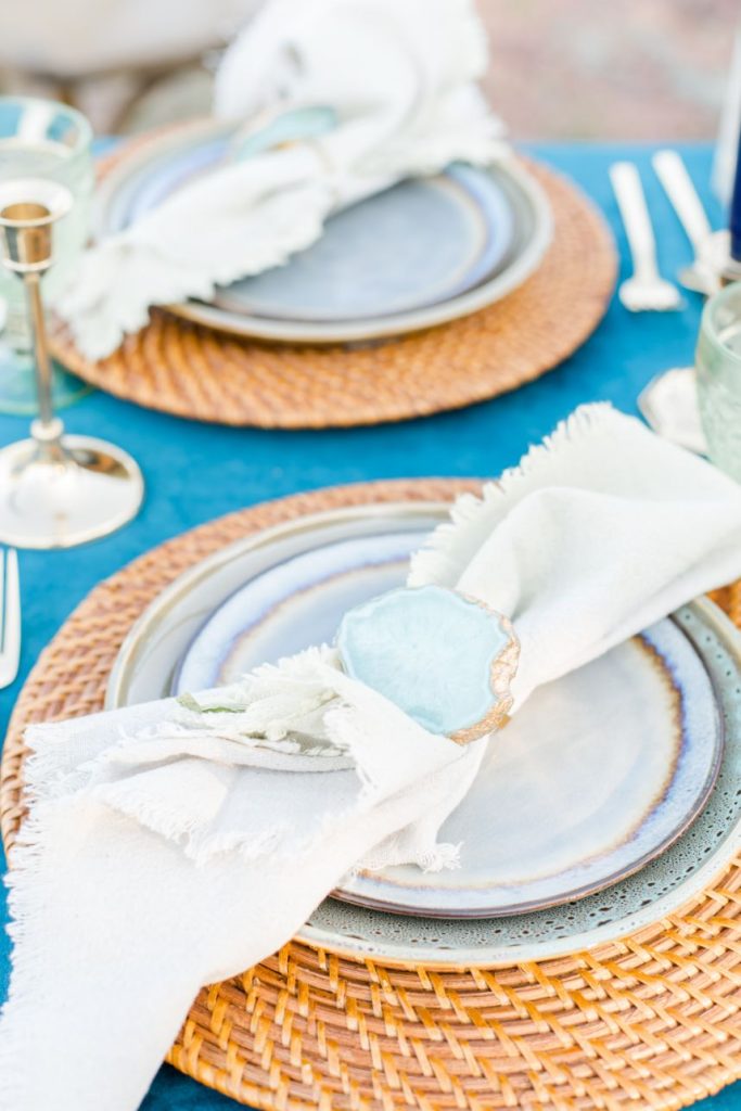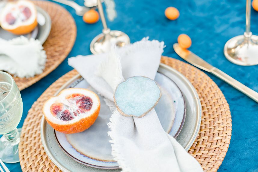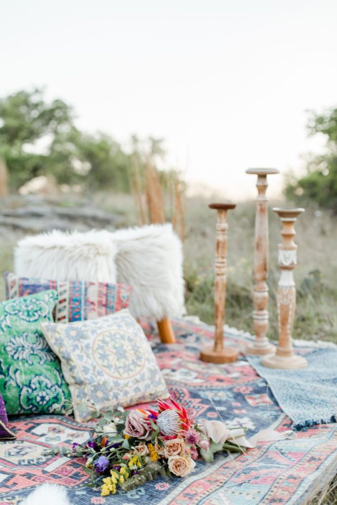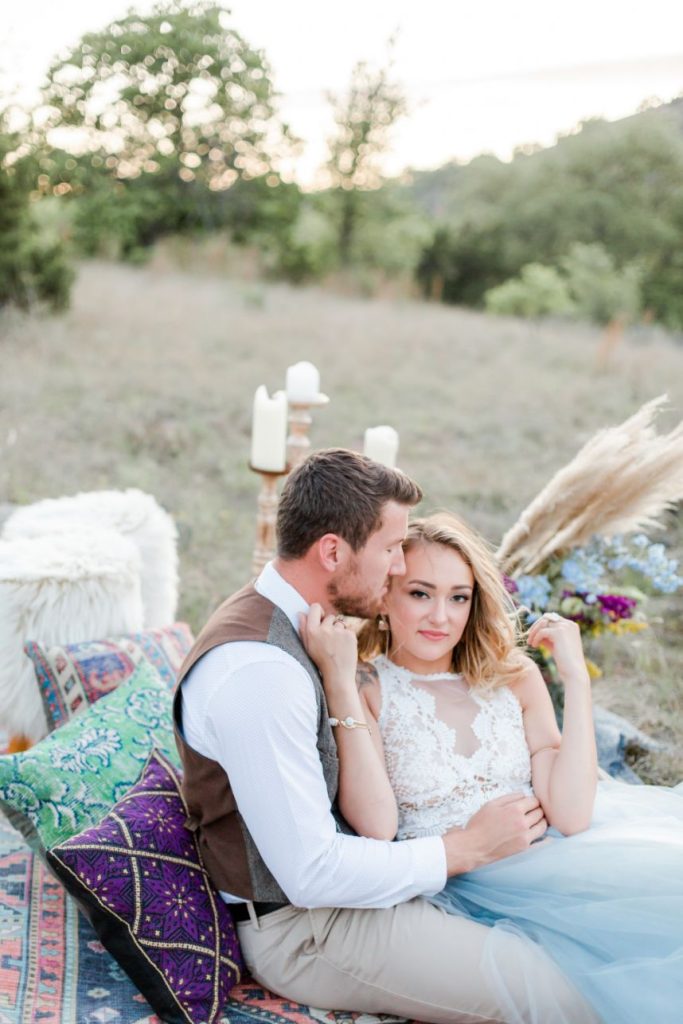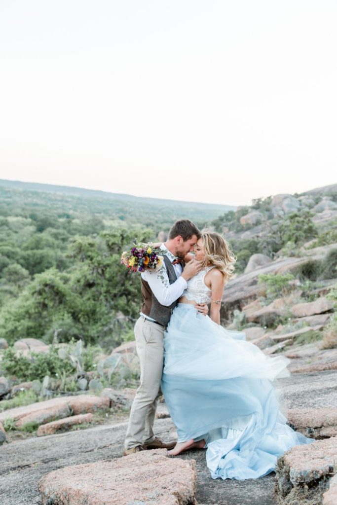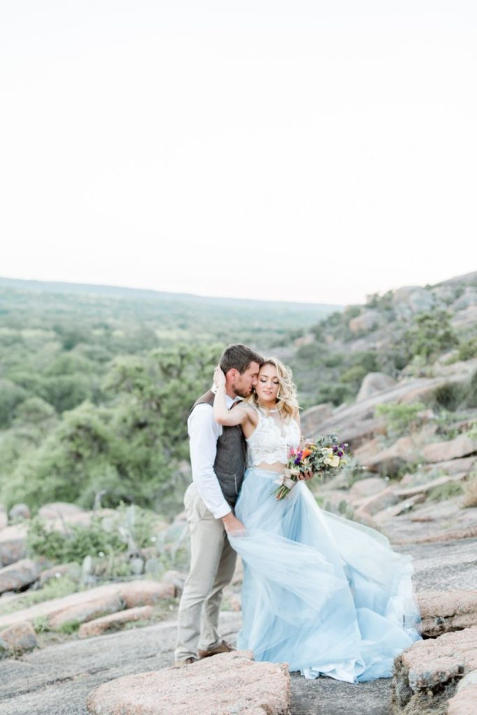 With bright, citrusy accents on a bold blue canvas beneath a Texas Hill Country sunset, this colorful boho styled shoot from Whimsical Events inspires us for a beautiful summertime celebration! The dynamic team at Whimsical Events traveled northwest to the Fredericksburg area to set up this scene at Enchanted Rock, a regal Texas landscape staple perfect for the modern, southwest vibes of this lovely al-fresco wedding scene. Textured details everywhere you turn mirror the natural surroundings, from the pampas grass to the woven chargers and boho ground-level lounge area. Wanting to bring in brightness and contrast to the aesthetic, the Whimsical Events ladies used deep teal linens, blue candlesticks, orange citrus accents and colorful boho florals to make the tabletop truly pop. We love the altar area with the geometric wooden arch – not to mention the bride’s one-of-a-kind blue skirt that flows in the breeze so beautifully! Take a cue from the work of Whimsical Events and don’t be afraid to embrace color and texture for your big day. They can complement each other perfectly! Cheers!