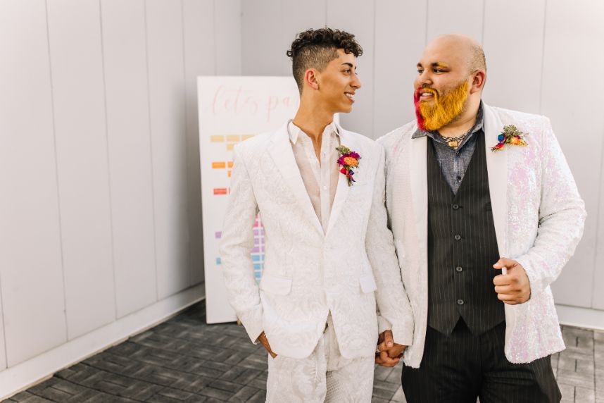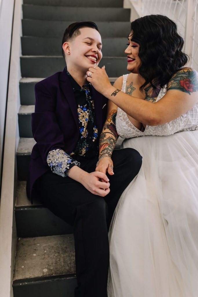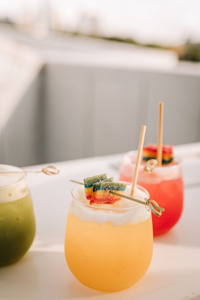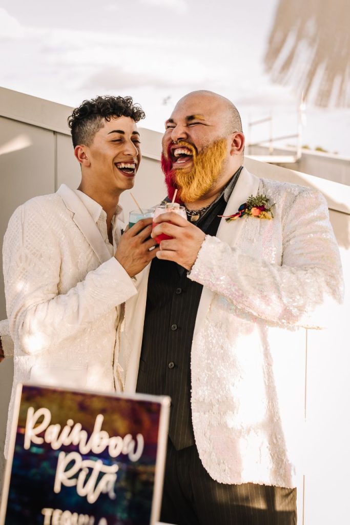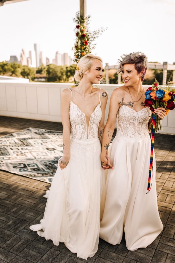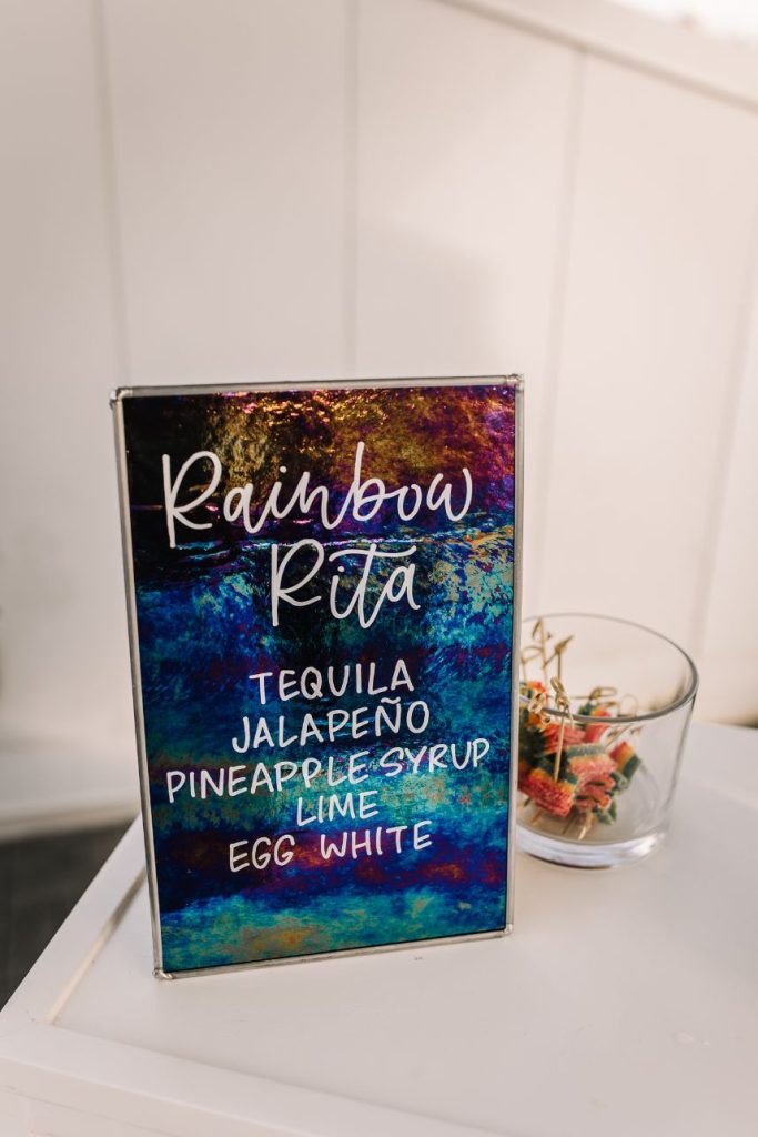 Lizzo truly said it best because love looks SO much better in color and this LGBTQ+ wedding inspiration is the perfect proof of that! Planned and designed by Moonstruck Events to be a full rainbow reception moment, each couple looks so ready to be wed and simply filled to the brim with love for their partner in this styled shoot. Two beautiful brides modeled gowns from EVOKE: the bridal experience while taking in the day together, and what better way to celebrate a brand new union than with refreshing mobile bartending services! The Traveling Spirit concocted yummy signature cocktails for everyone – a rainbow ‘rita with all the add-ins in various vibrant shades to match rainbow sweets from Alchemy Bake Lab that waited to be enjoyed by guests and lovers alike. Plus, custom stained glass made just for the occasion adds an artful centerpiece to tables without crowding your guests with flowers.