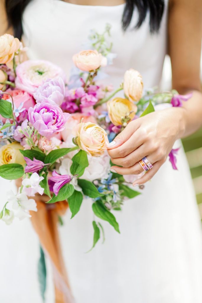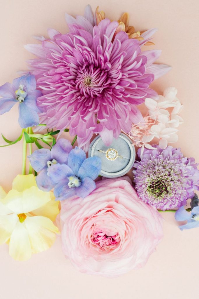 Some of my personal favorite flowers used were the Lavender Double Tulips, the Caramel Antike Garden Rose (it’s the perfect pale yellow rose!), Light Pink and Yellow Butterfly Ranunculus (they’re perfect for that floaty-effect), Coral Charm Peonies, Preserved Peegee Hydrangeas, Lavender Sweet Pea, Blue Dyed Tulips, Salmon Ranunculus, Blue Tweedia, Purple Clematis, and Lavender Dahlias, just to name a few!”