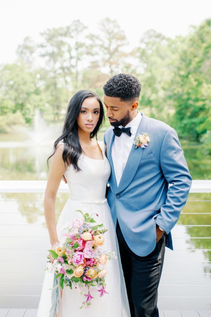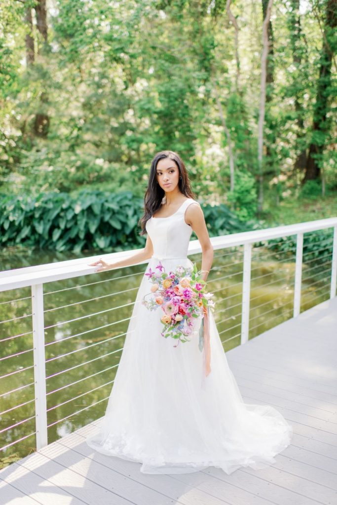 We’re giddy to unveil this season’s bridal fashion editorial, Midsummer Maven: a collection of romantic and whimsical statement gowns for the lush garden bride captured in vibrant, colorful photos by Kati Hewitt Photography and on video by Reverent Wedding Films in behind-the-scenes clips. Held around the property at Forever 5 Events, scenic gardenesque weddingscapes flowered with bright blooms by Unforgettable Floral unfold to showcase bridal styles from some of the industry’s top designers. Our model bride was breathtaking in each of the five statement bridal gowns from these Houston bridal boutiques (see credits for each below), and her wedding day looks were accented with romantic hair and makeup by BP Artistry along with fun and whimsical bridal accessories. Kaira finished off each bridal look with her fine jewelry collection of brightly colored gems.