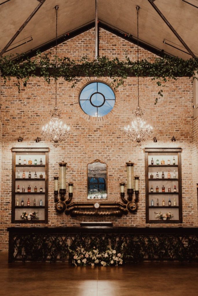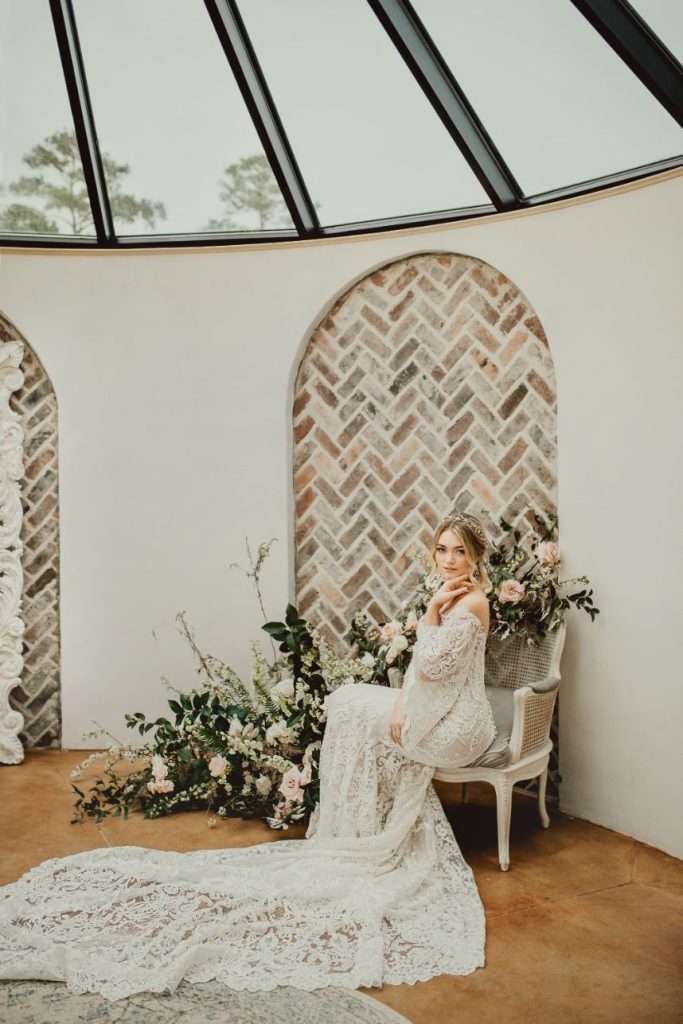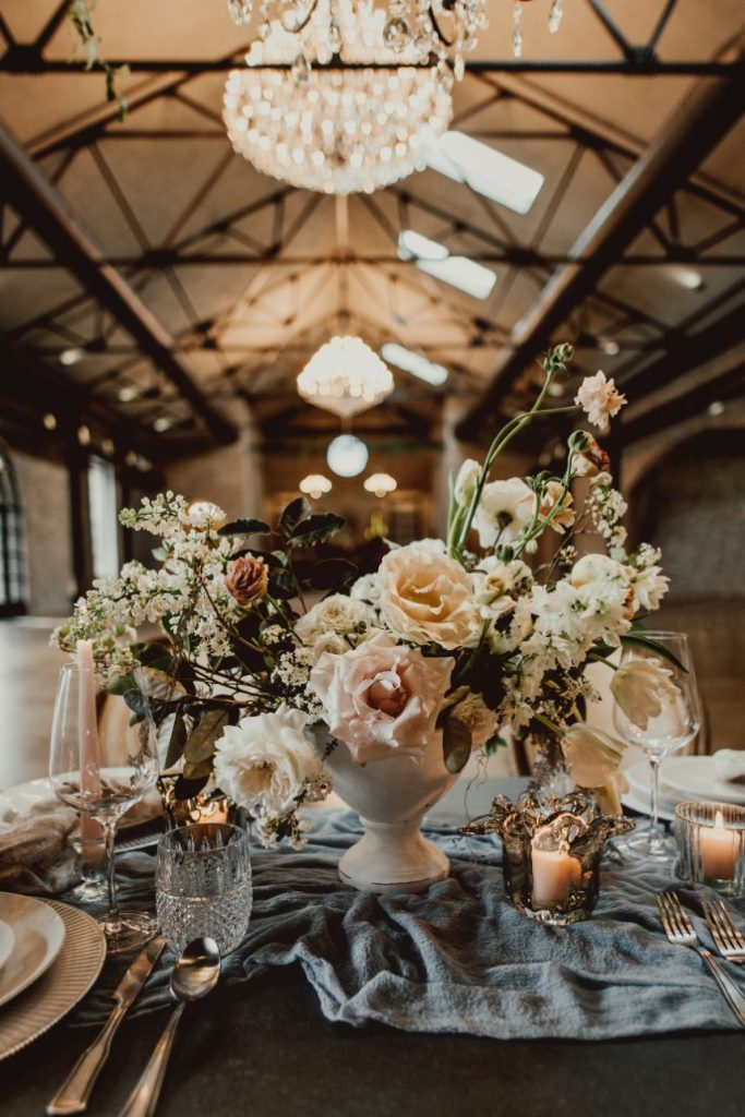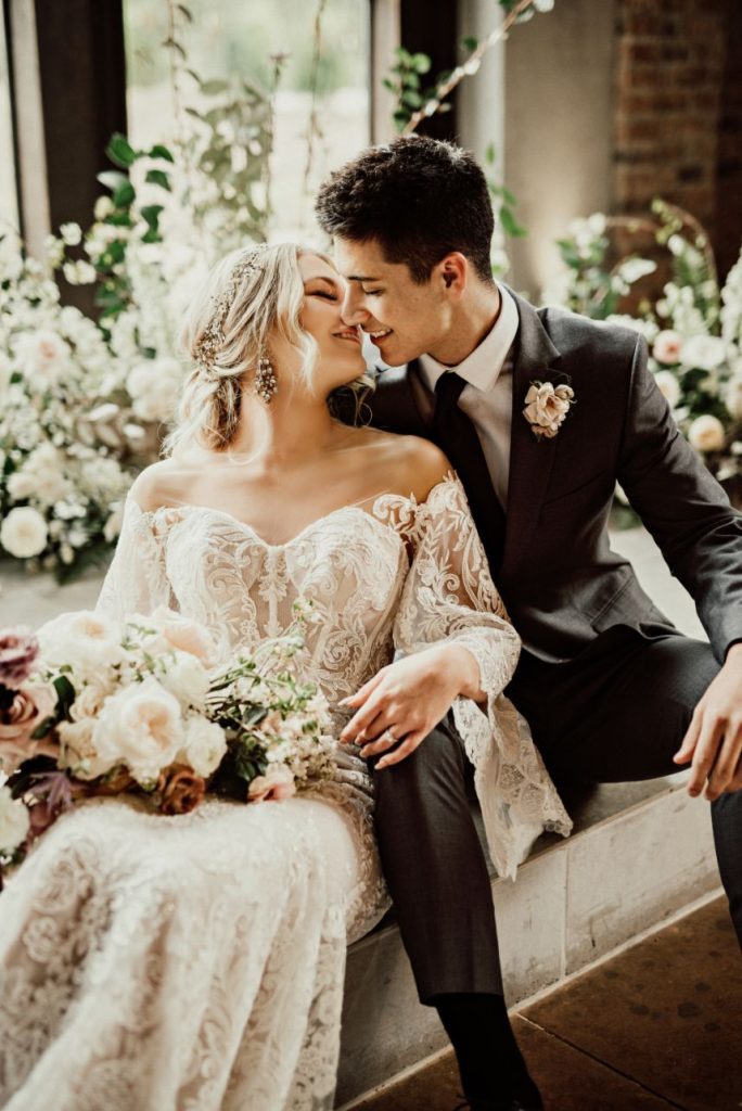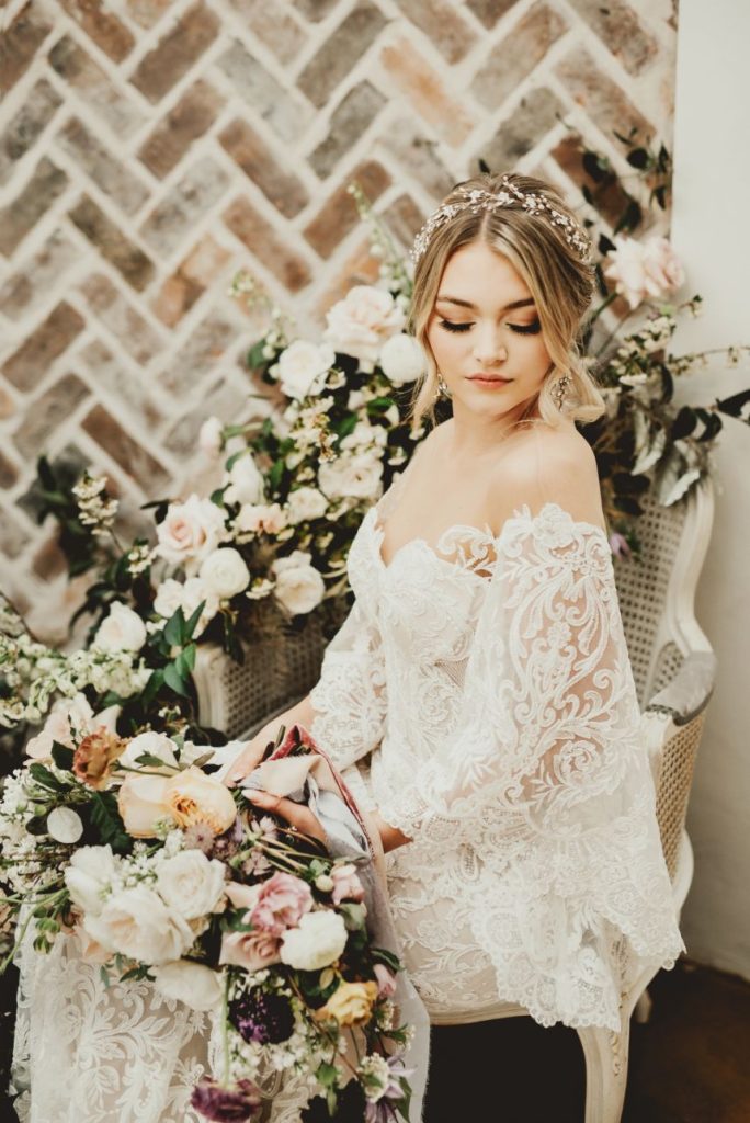 Give us all the drama! This contemporary romance wedding inspiration planned and designed by Love Birds & Co. is sure to wow both traditional and nontraditional brides alike. With a monochrome palette, it’s easy to mix and match a variety of different textures and finishes! Industrial brick and metals plus moody lighting contrast perfectly with feminine florals and organic textiles. From Flora + Fauna, this styled shoot features the most gorgeous floral design comprised of romantic roses and big blooms galore as well as plentiful greenery – even some suspended from hanging installations. Paperie from Jo’s Paper Kitchen in a dusty palette complemented the muted tones of the setting. The model’s stunning gown from Mia Bridal features off-the-shoulder poet sleeves and lace detailing all over. Beautiful artistry by ELM Beauty has her styled with loose curls secured in an updo with a bohemian hairpiece, and bold, warm-toned eye makeup matched with a natural peachy lip that is flattering and versatile enough for any bride! Having your wedding at an industrial venue means that you can utilize its urban setting and make it as full of luxe grandeur or as clean-cut and simple as you want! The choice is yours. Read on to hear about the planner’s vision for this contemporary romance wedding inspiration shoot. Cheers!