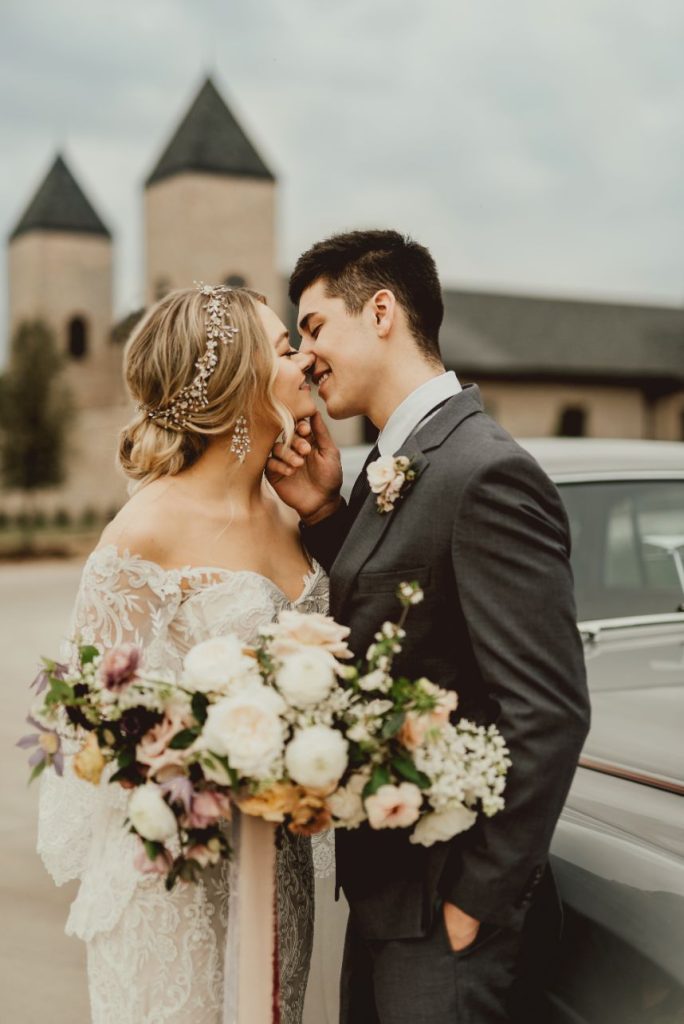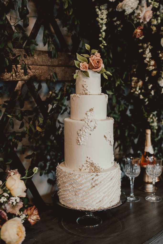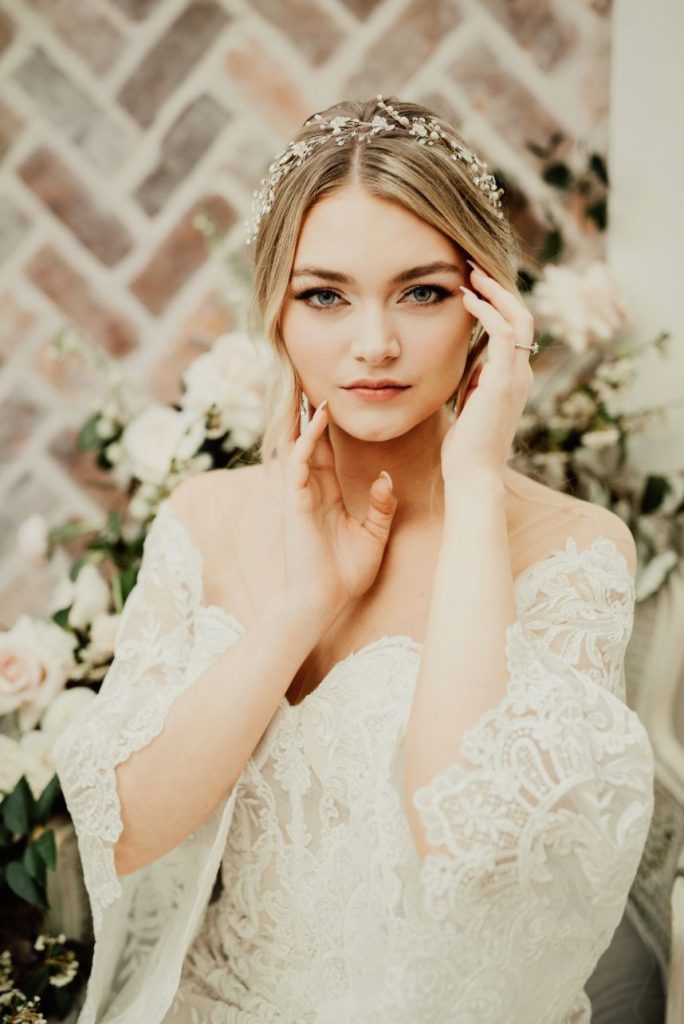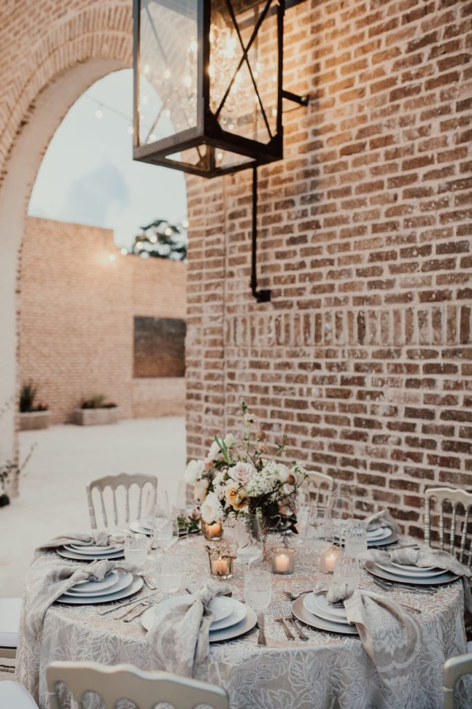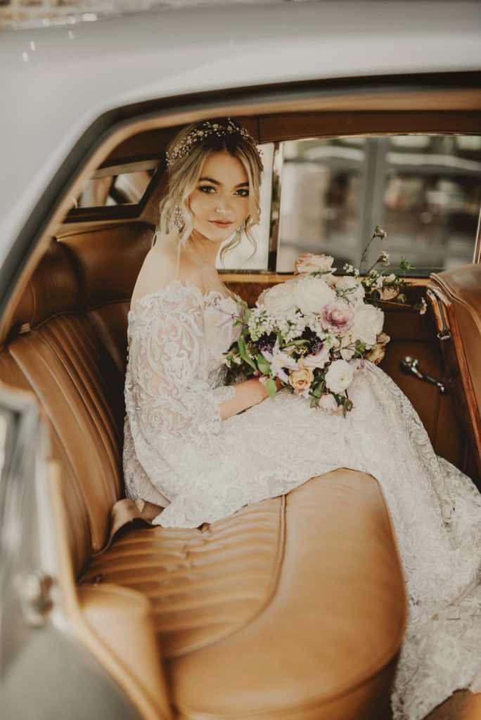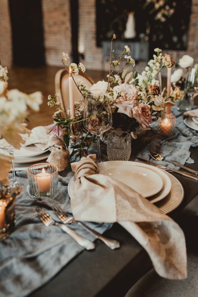 Give us all the drama! This contemporary romance wedding inspiration planned and designed by Love Birds & Co. is sure to wow both traditional and nontraditional brides alike. With a monochrome palette, it’s easy to mix and match a variety of different textures and finishes! Industrial brick and metals plus moody lighting contrast perfectly with feminine florals and organic textiles. From Flora + Fauna, this styled shoot features the most gorgeous floral design comprised of romantic roses and big blooms galore as well as plentiful greenery – even some suspended from hanging installations. Paperie from Jo’s Paper Kitchen in a dusty palette complemented the muted tones of the setting. The model’s stunning gown from Mia Bridal features off-the-shoulder poet sleeves and lace detailing all over. Beautiful artistry by ELM Beauty has her styled with loose curls secured in an updo with a bohemian hairpiece, and bold, warm-toned eye makeup matched with a natural peachy lip that is flattering and versatile enough for any bride! Having your wedding at an industrial venue means that you can utilize its urban setting and make it as full of luxe grandeur or as clean-cut and simple as you want! The choice is yours. Read on to hear about the planner’s vision for this contemporary romance wedding inspiration shoot. Cheers!