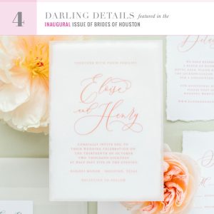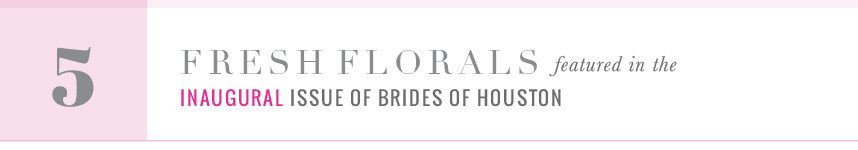 We can’t believe the debut issue of Brides of Houston magazine is almost here! We are so ready to show you all the beautiful ideas and inspiration on each and every page, and we’re particularly excited to reveal the inaugural Brides of Houston cover in just a few short days! In the meantime, we’re counting down to the cover reveal with some sneak peeks you’ll find in the glossies! We’re kicking things off today with five fresh florals straight from the pages of the new mag. As you flip through the beautiful pages of Brides of Houston, you’ll find tons of fabulous images featuring some of Houston’s top wedding florists – this is just the beginning! Be sure to stay tuned as we continue our countdown! Cheers!
