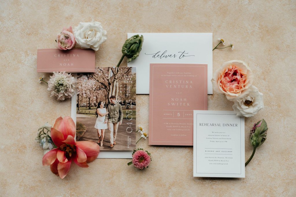 The invitation suite gave guests a glimpse into what was to come—soft blush tones, modern typography, and a sweet engagement photo of the couple that radiated happiness. Details like these carried through to the reception, where the cake—crafted by the talented team at Buttercream Houston—stood as a centerpiece of artistry and flavor. Covered in fresh florals, it echoed the vibrant romance of the day.