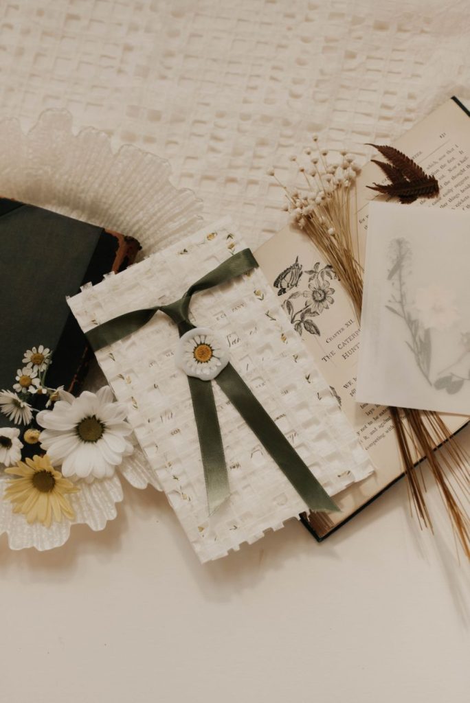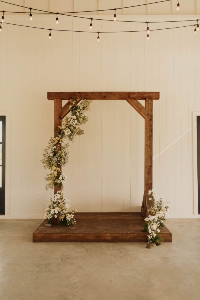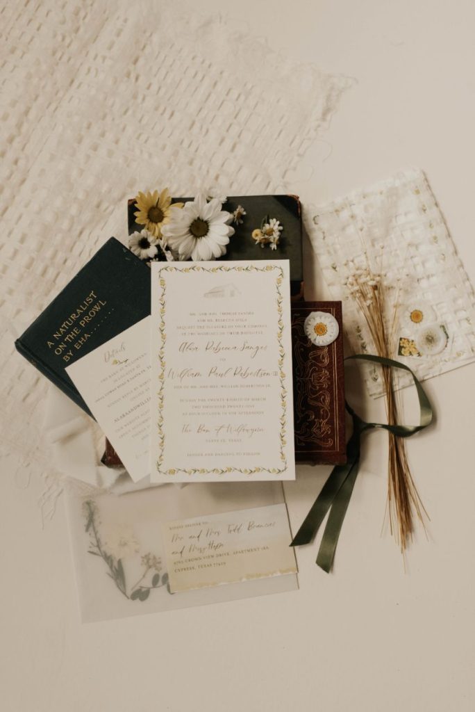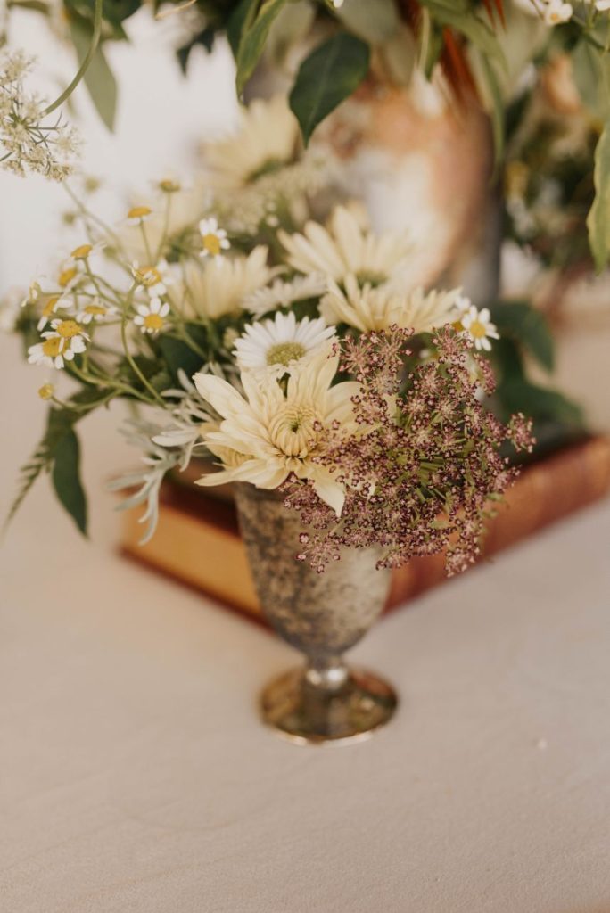 From the florist, Hannah of Edges Wild Studio: “As I’d imagine they do for most, daisies evoke a sense of carefree innocence to me, and that felt like such a timely palette cleanser after a tough year that I decided to lean all the way into it as the touchstone of this floral design concept: carefree. I wanted to keep it simple, which for a maximalist designer, meant choosing to focus on a single element by incorporating as many different varieties of it as possible; iterating on the size, coloration and composite-or-single-stem options of the humble daisy in order to maintain that highly textural Edges Wild style that I love to work in. I find that a daisy pretty much begs to be styled back into a recreation of its natural, fresh-from-the-field habitat, so as the base layer for this ceremony installation I foraged some baccharis – a perennial shrub with an airy, branching growth pattern and little dainty leaves that’s actually from the aster (read: daisy) family and grows along roadsides and fence lines all over East Texas. It was at the end of its bloom cycle when we created this set, so the flowering part of the bush had gone to seed, leaving dandelion-esque tufts to bob in the breeze and float away here and there, which only added to the bucolic dreaminess of it all when layered with bunches of adorable, open-faced, pungently herbal-smelling daisies. I think the baccharis was actually my favorite part of the whole design! A truly wild member of the daisy crowd.”