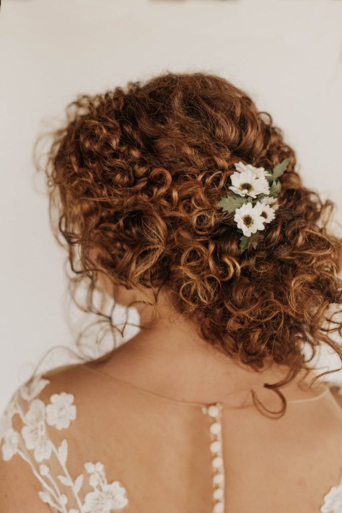 From the hair and makeup artist, Allison of AH Specialties: “For the look we created, we really just wanted to play off of her natural beauty. She had amazing features and the most perfect naturally curly hair. We really focused on ‘less is more.’ We added soft curls and face-framing pieces to create a romantic hairstyle. We lightly pinned her curls in the back to create a low updo and added floral as the finishing touch. For her makeup, we focused on bronzey tones and lots of glowing skin. We finished off the look with a nude glossy lip and fluffy lashes.”