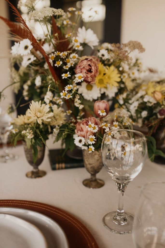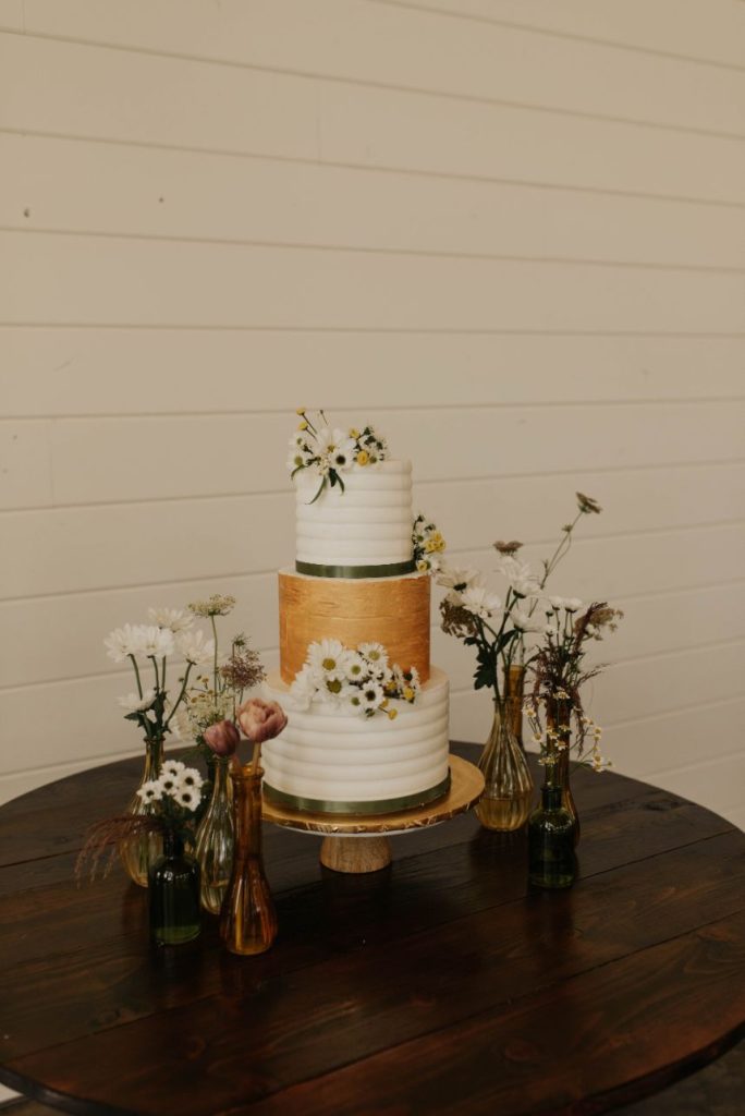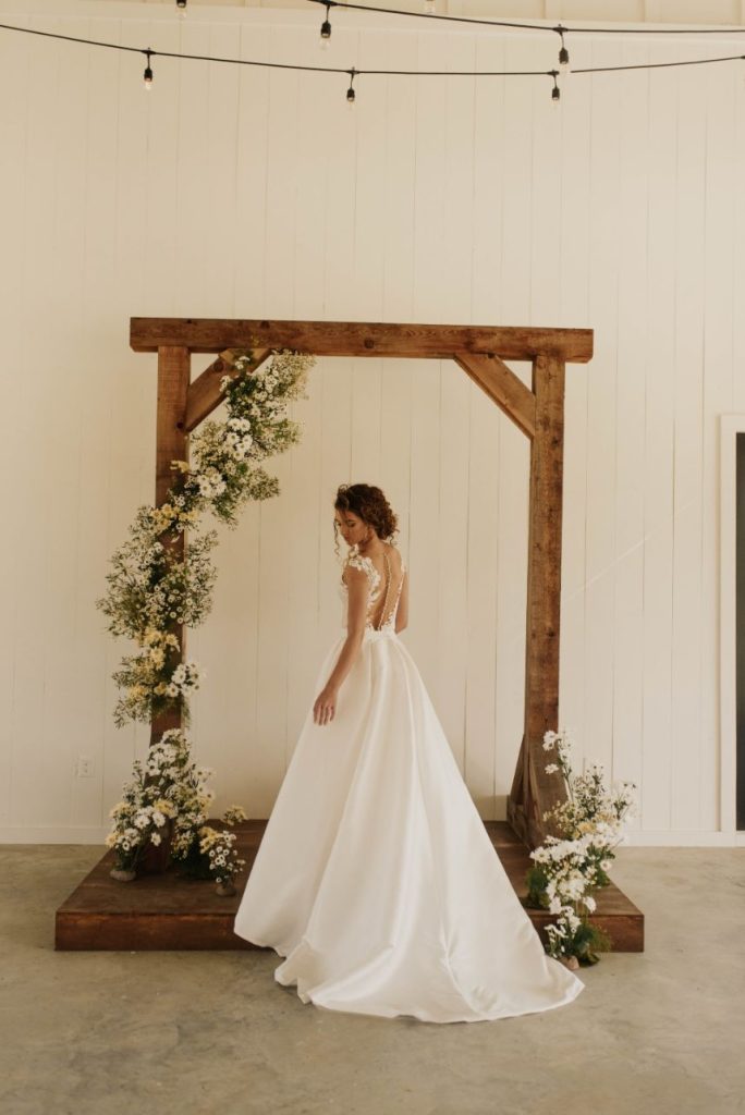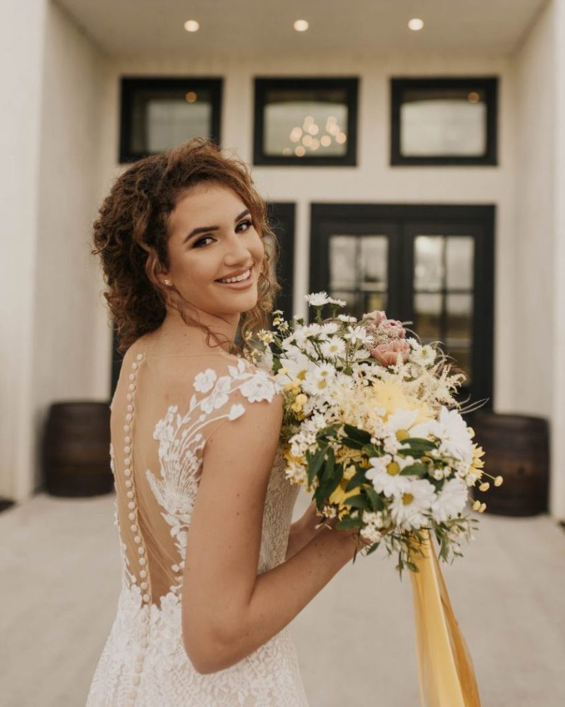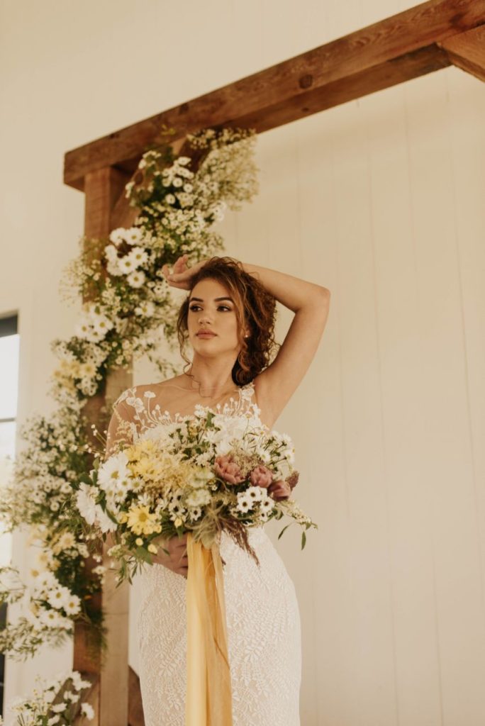 The Barn at Willowynn serves as the perfect rustic, raw wood backdrop for this darling daisy wedding inspiration, just brimming with carefree and effortless floral design by Edges Wild Studio. Since the wildflower looks best in its natural, fresh-from-the-field habitat, a foraged base layer of botanicals was in order. Ying and yang daisies, feverfew daisies, chamomile button daisies and more make up the main floral details. Wild-edged romance doesn’t stop there, though! The talented Taryn Lynn Photography captures timeless elements that take on a vintage charm when paired with her moody photography style, and we can’t get enough of carefree, romantic design. A stately invitation suite carefully crafted by Jo’s Paper Kitchen embodies a deep, muted primary color palette, and the same palette carries over into tablescape details from Lavish Linens in rich, organic textures. This bride models the perfect look for the occasion – a floral-patterned lace gown from Modern Affinity featuring elegant illusion open-back detailing. Embracing her natural curl, she was styled with a low, floral-adorned updo and glowy bridal beauty in shades of bronze, both by AH Specialties. A cake donning simplistic three-tiered design by Lane and Simple is just what we need to satisfy our sweet tooth, and its rustic wildflower design is too cute to be true. Read on for notes from the florist as well as the hair and makeup artist about the vision behind this darling daisy editorial and how that translated in their contribution. Cheers!