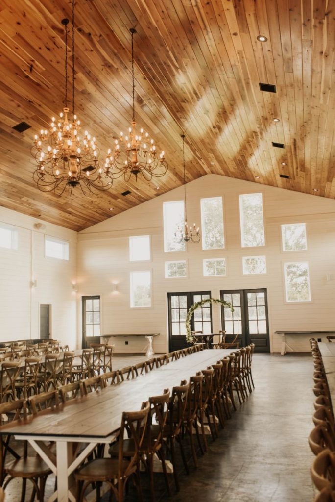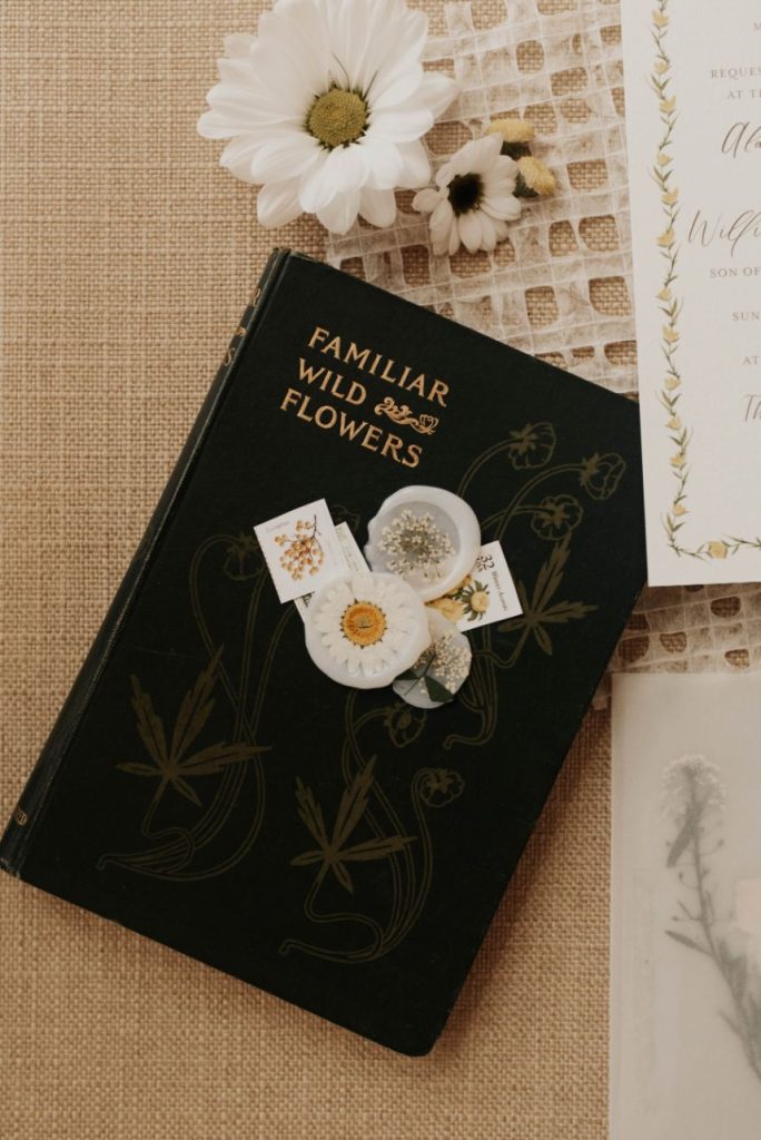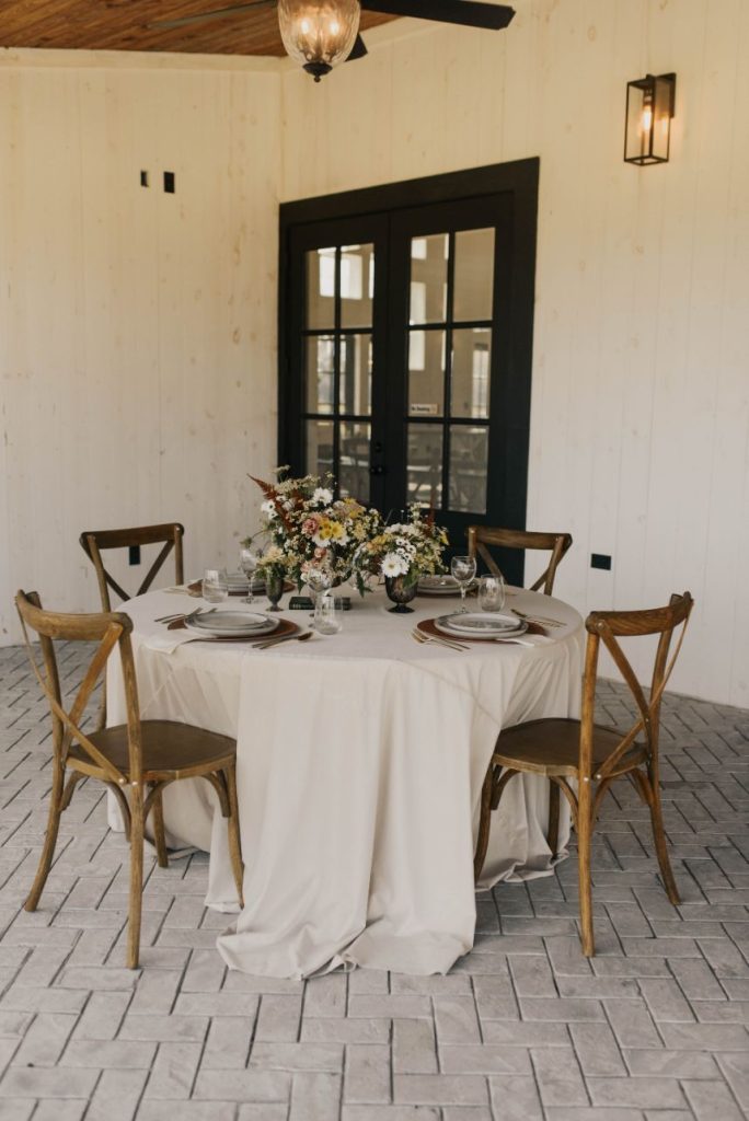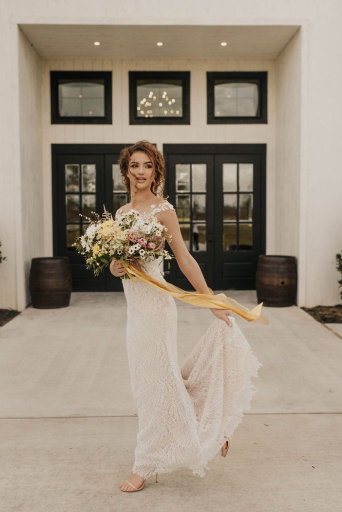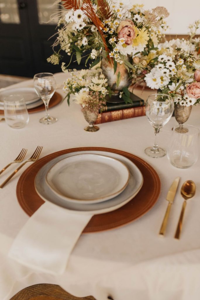 The Barn at Willowynn serves as the perfect rustic, raw wood backdrop for this darling daisy wedding inspiration, just brimming with carefree and effortless floral design by Edges Wild Studio. Since the wildflower looks best in its natural, fresh-from-the-field habitat, a foraged base layer of botanicals was in order. Ying and yang daisies, feverfew daisies, chamomile button daisies and more make up the main floral details. Wild-edged romance doesn’t stop there, though! The talented Taryn Lynn Photography captures timeless elements that take on a vintage charm when paired with her moody photography style, and we can’t get enough of carefree, romantic design. A stately invitation suite carefully crafted by Jo’s Paper Kitchen embodies a deep, muted primary color palette, and the same palette carries over into tablescape details from Lavish Linens in rich, organic textures. This bride models the perfect look for the occasion – a floral-patterned lace gown from Modern Affinity featuring elegant illusion open-back detailing. Embracing her natural curl, she was styled with a low, floral-adorned updo and glowy bridal beauty in shades of bronze, both by AH Specialties. A cake donning simplistic three-tiered design by Lane and Simple is just what we need to satisfy our sweet tooth, and its rustic wildflower design is too cute to be true. Read on for notes from the florist as well as the hair and makeup artist about the vision behind this darling daisy editorial and how that translated in their contribution. Cheers!