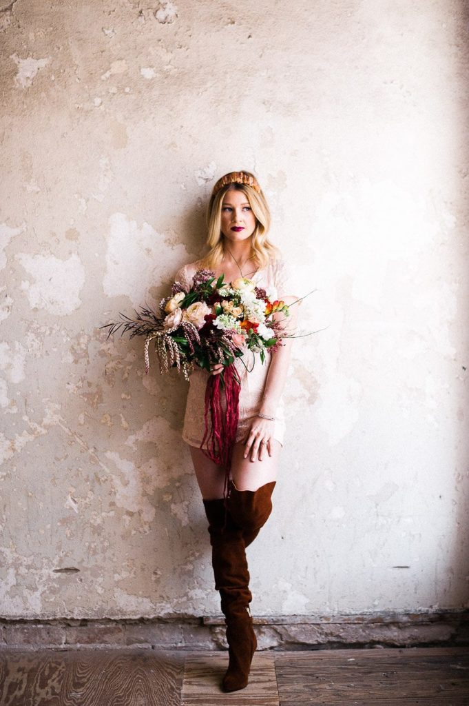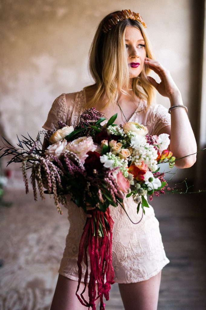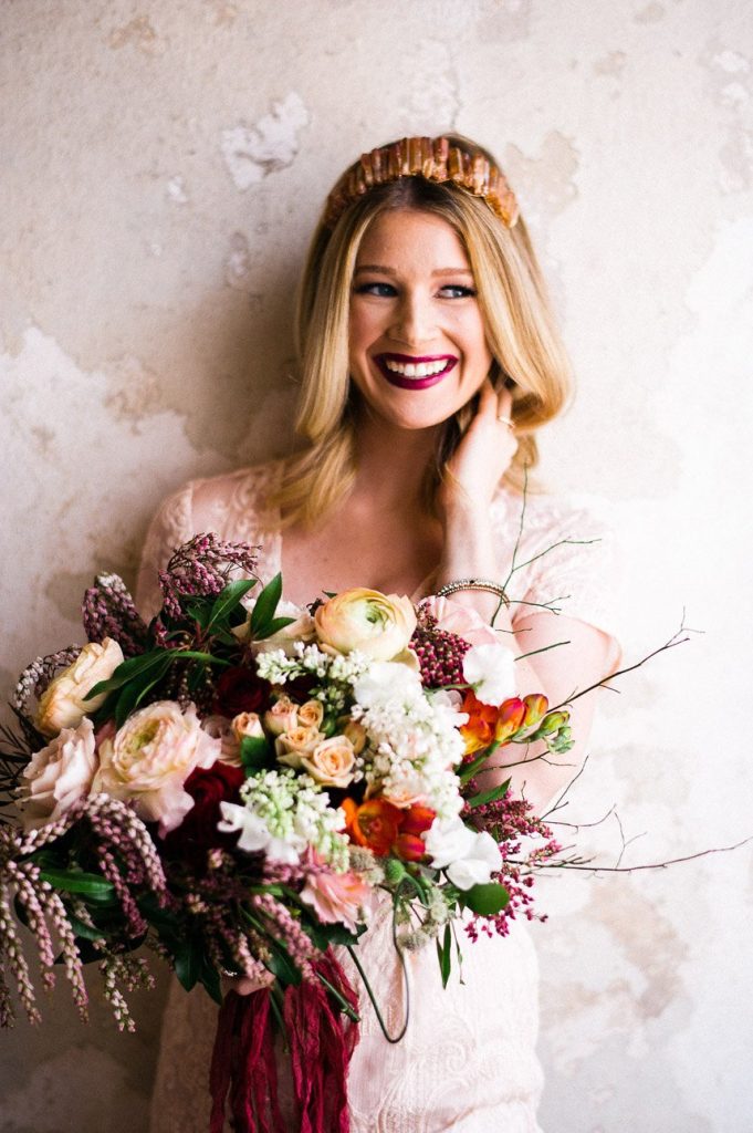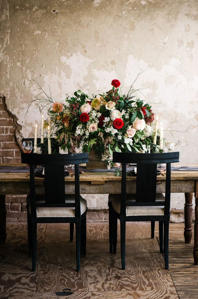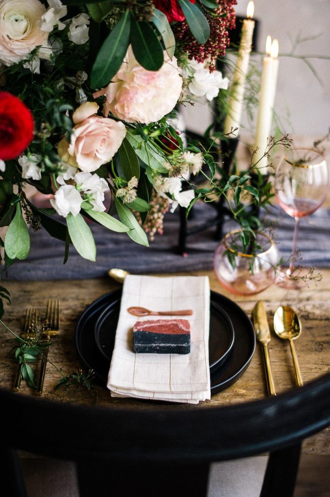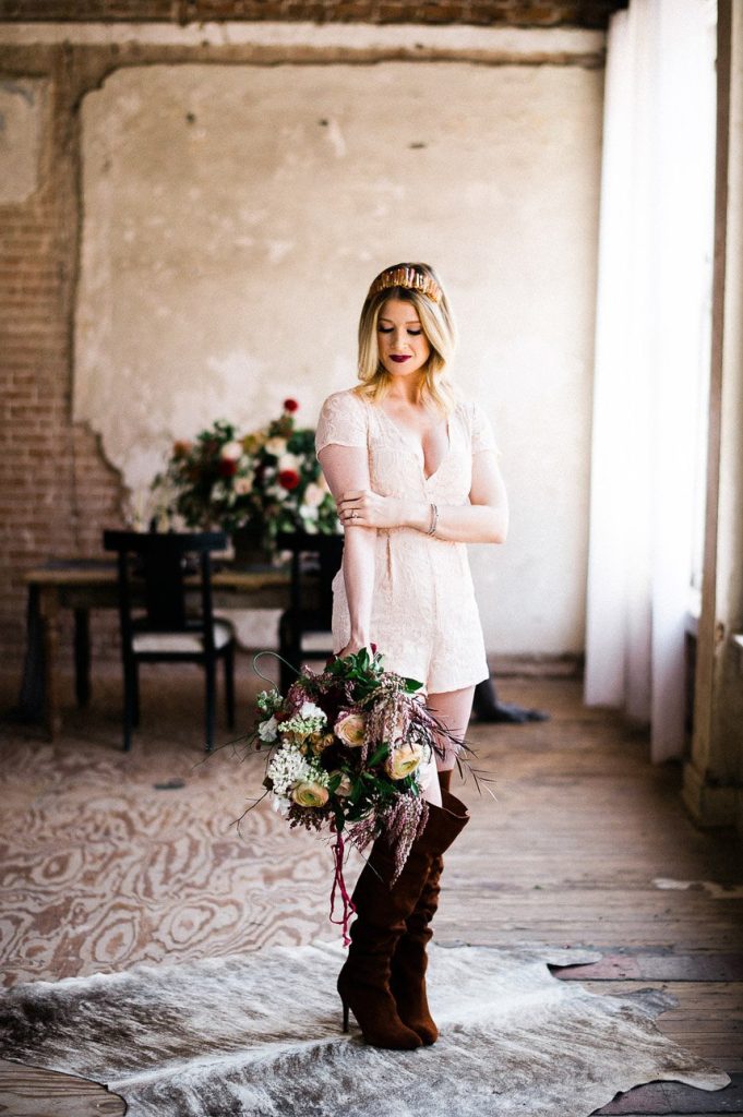 With Valentine’s Day approaching, we’re up for any excuse to celebrate all things romantic, flirty and feminine, and this dramatic jewel-toned styled shoot from Awake Photography does just that! We love the balance within this shoot using dainty details like the gold flatware on the table, candlesticks and the model’s soft blonde waves and gold ring, juxtaposed with the heavier, more dramatic pieces like the dark chairs, rustic wood floors and cowhide rugs. The insanely gorgeous blooms by Flower Vibes might be the most dramatic element of all, with roses in every color and a few succulents thrown in the mix. We’re in love! The model’s fun and flirty blush romper is accented accordingly with a pop of dark lipstick and knee-high boots, inspiring us to think outside the box and embrace a bolder style. Her striking beauty look by Blush Worthy is unforgettable! Geodes incorporated throughout the jewelry collection and tablescape, along with the model’s crystal crown in a beautiful quartz, all add a unique richness to the aesthetic, and more jewel-toned goodness comes from the beautifully hand-brushed invitation suite by Nib and Pixel. This shoot brings playful and daring together in a beautiful setting and evokes all kinds of emotion!