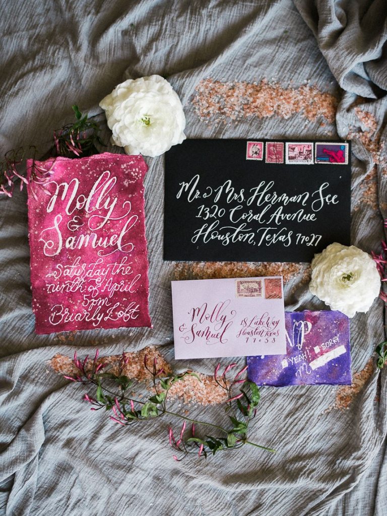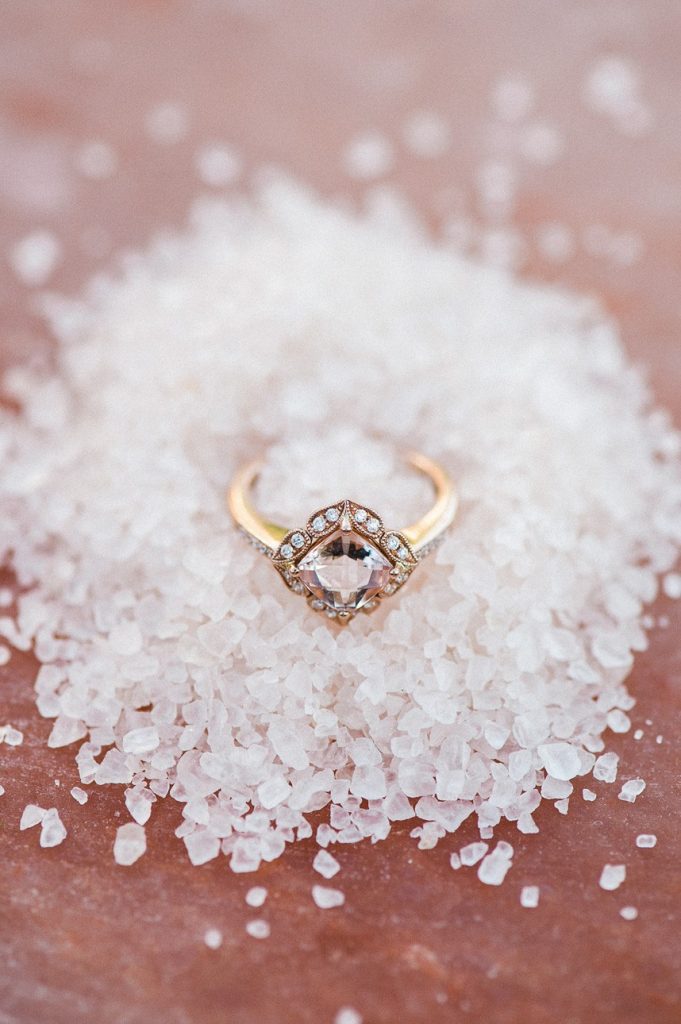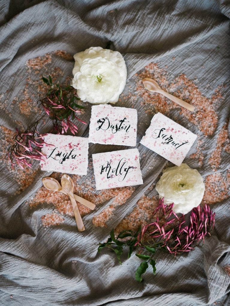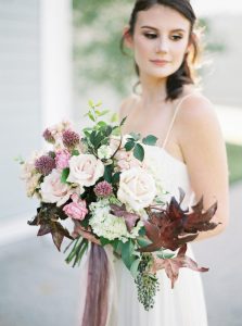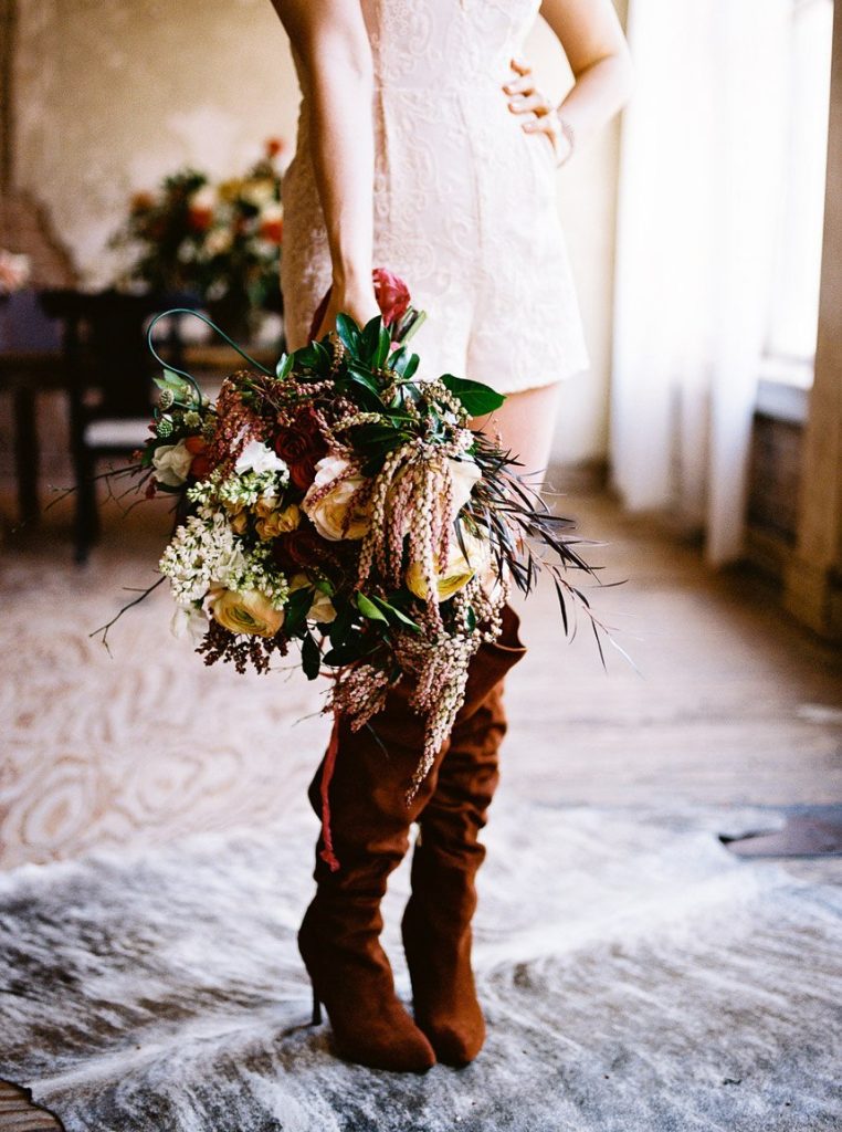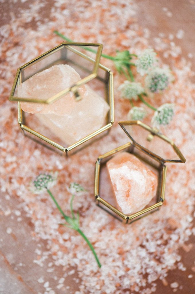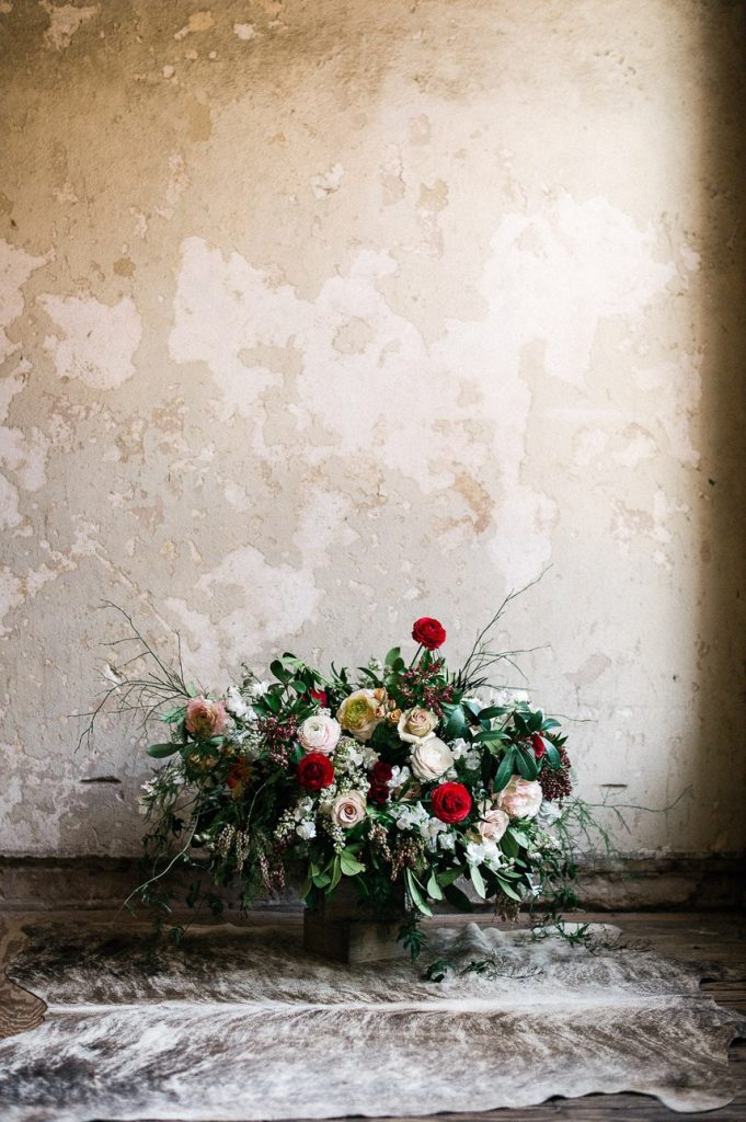 With Valentine’s Day approaching, we’re up for any excuse to celebrate all things romantic, flirty and feminine, and this dramatic jewel-toned styled shoot from Awake Photography does just that! We love the balance within this shoot using dainty details like the gold flatware on the table, candlesticks and the model’s soft blonde waves and gold ring, juxtaposed with the heavier, more dramatic pieces like the dark chairs, rustic wood floors and cowhide rugs. The insanely gorgeous blooms by Flower Vibes might be the most dramatic element of all, with roses in every color and a few succulents thrown in the mix. We’re in love! The model’s fun and flirty blush romper is accented accordingly with a pop of dark lipstick and knee-high boots, inspiring us to think outside the box and embrace a bolder style. Her striking beauty look by Blush Worthy is unforgettable! Geodes incorporated throughout the jewelry collection and tablescape, along with the model’s crystal crown in a beautiful quartz, all add a unique richness to the aesthetic, and more jewel-toned goodness comes from the beautifully hand-brushed invitation suite by Nib and Pixel. This shoot brings playful and daring together in a beautiful setting and evokes all kinds of emotion!