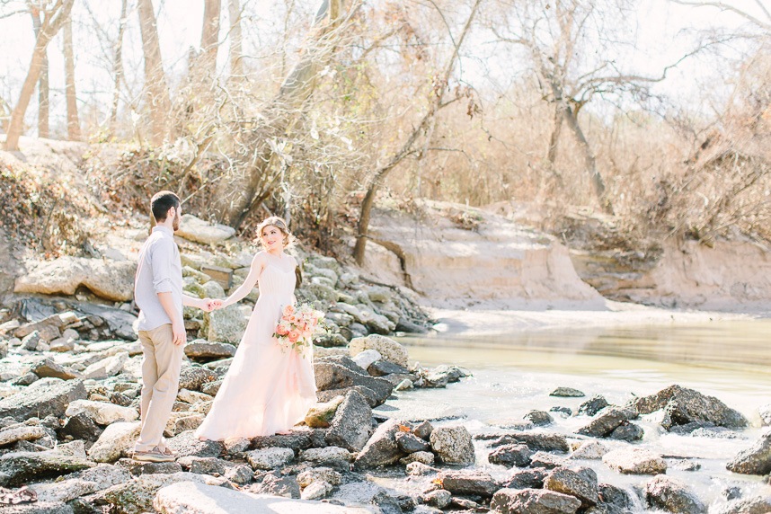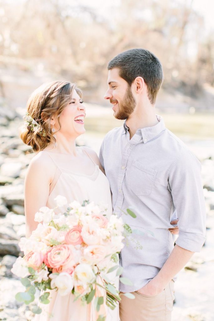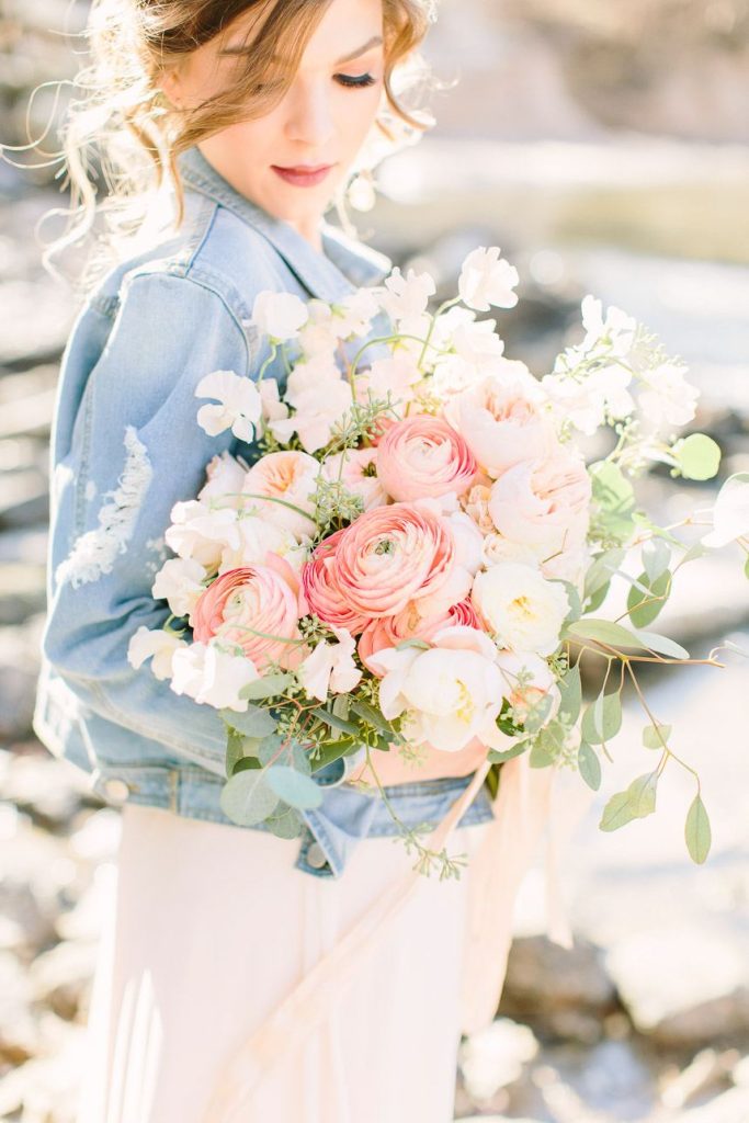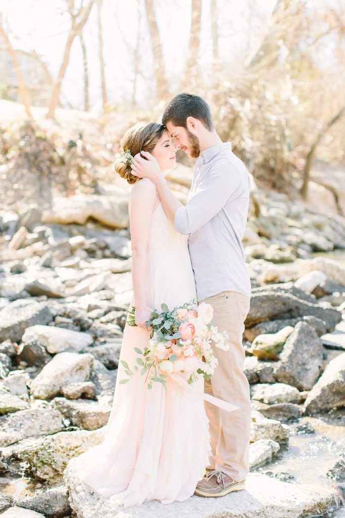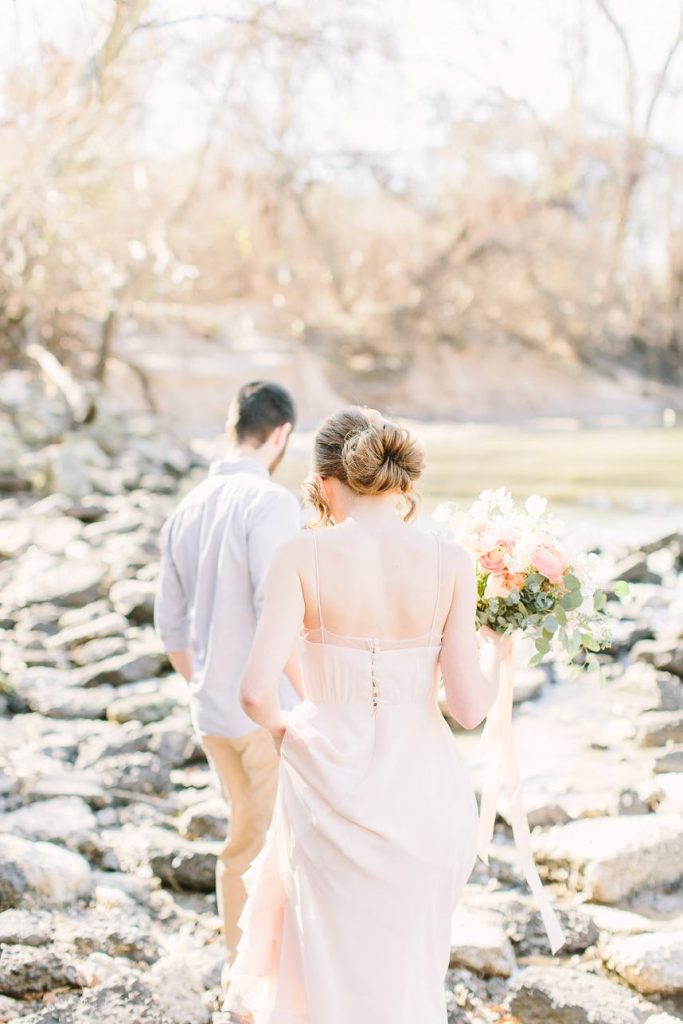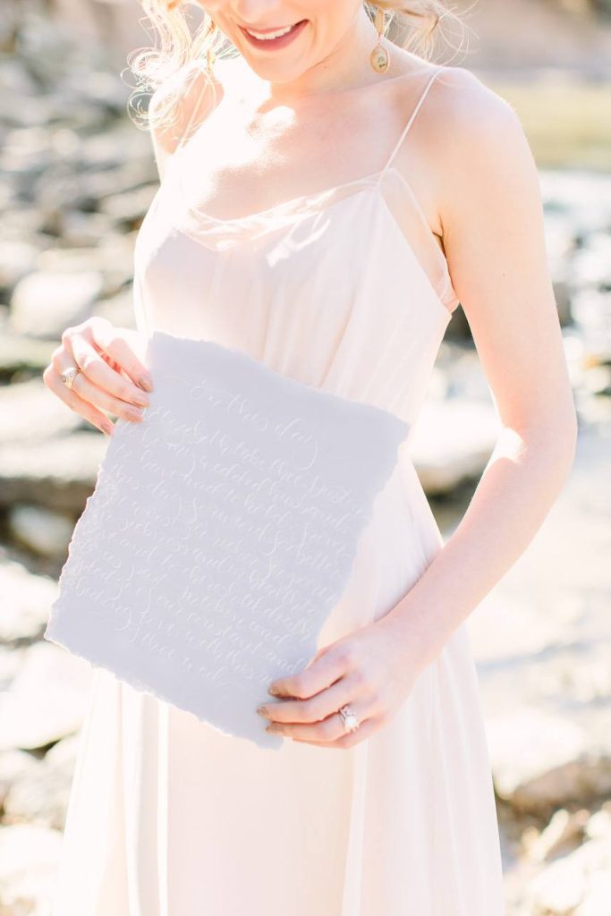 What a treat we have for you today! This romantic blush styled anniversary shoot from Ode to Joy Flowers and Kate Elizabeth Photography stopped us right in our tracks! Captured at the peak of golden hour in an oh-so-romantic wintry riverbed, the combination of gentle light and a soft palette make this one dreamy photo session! A fresh and classic makeup look perfectly complements the flowy ethereal blush gown, accessorized with a light denim jacket and a low, loose ballet-inspired bun with a flower tucked in, of course. Ode to Joy included white roses, coral peonies for a pop of color and loose eucalyptus leaves to create a beautifully romantic bouquet. A hand-calligraphed copy of the couple’s vows on dusty blue parchment adds a heartfelt touch to this gorgeous anniversary shoot we couldn’t help but share. Happy scrolling!