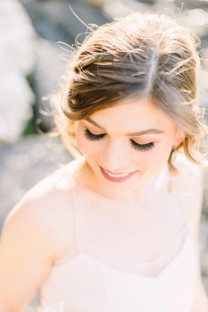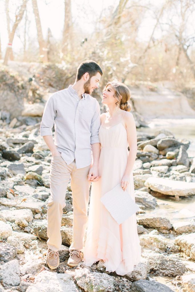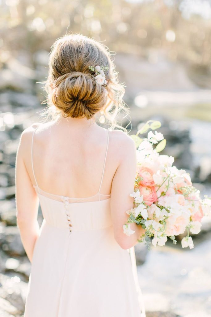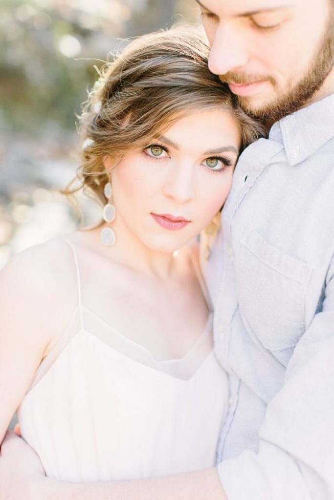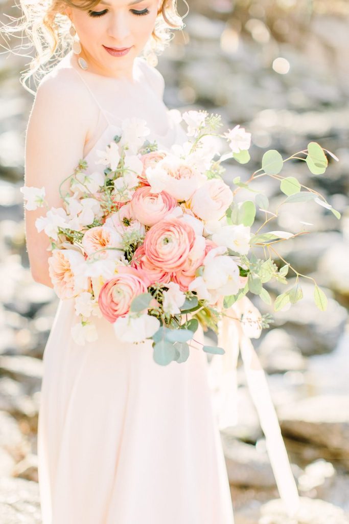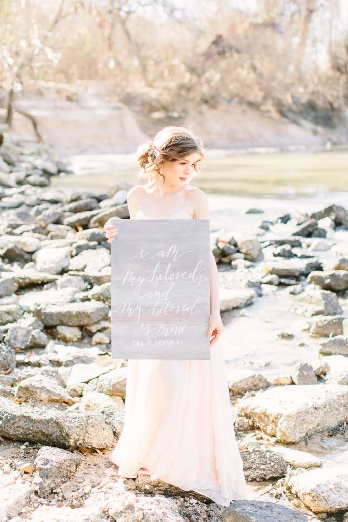 What a treat we have for you today! This romantic blush styled anniversary shoot from Ode to Joy Flowers and Kate Elizabeth Photography stopped us right in our tracks! Captured at the peak of golden hour in an oh-so-romantic wintry riverbed, the combination of gentle light and a soft palette make this one dreamy photo session! A fresh and classic makeup look perfectly complements the flowy ethereal blush gown, accessorized with a light denim jacket and a low, loose ballet-inspired bun with a flower tucked in, of course. Ode to Joy included white roses, coral peonies for a pop of color and loose eucalyptus leaves to create a beautifully romantic bouquet. A hand-calligraphed copy of the couple’s vows on dusty blue parchment adds a heartfelt touch to this gorgeous anniversary shoot we couldn’t help but share. Happy scrolling!