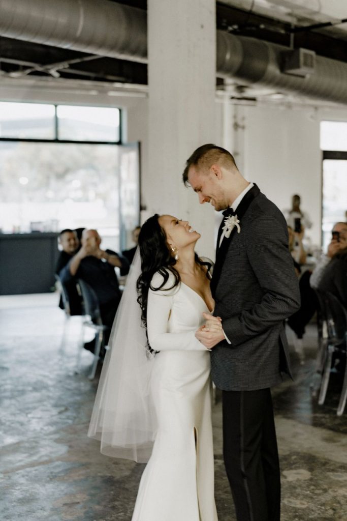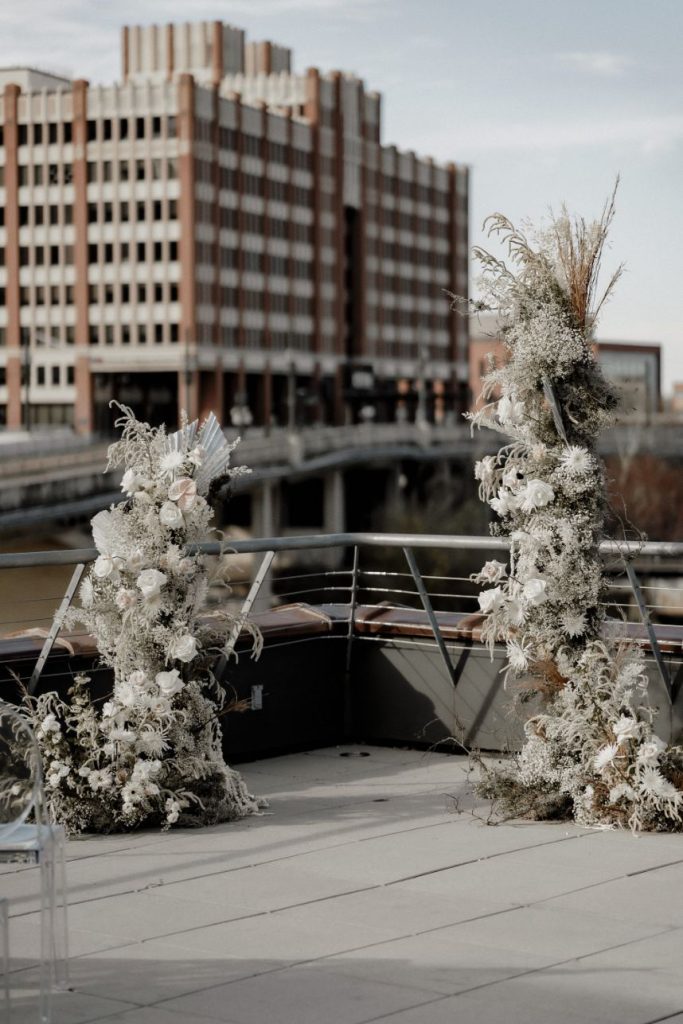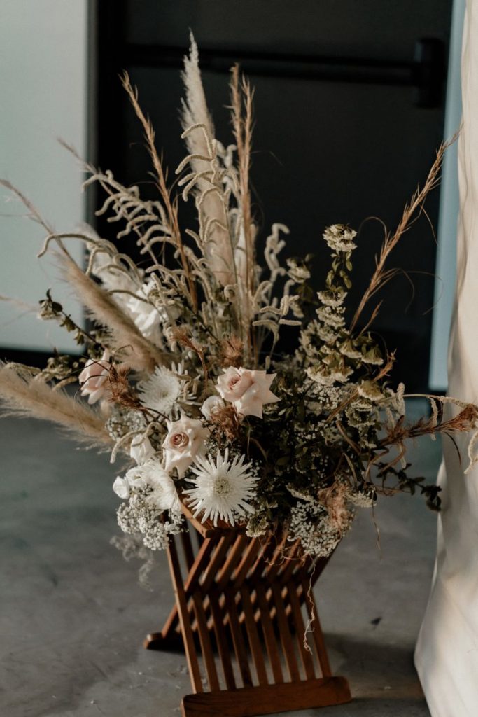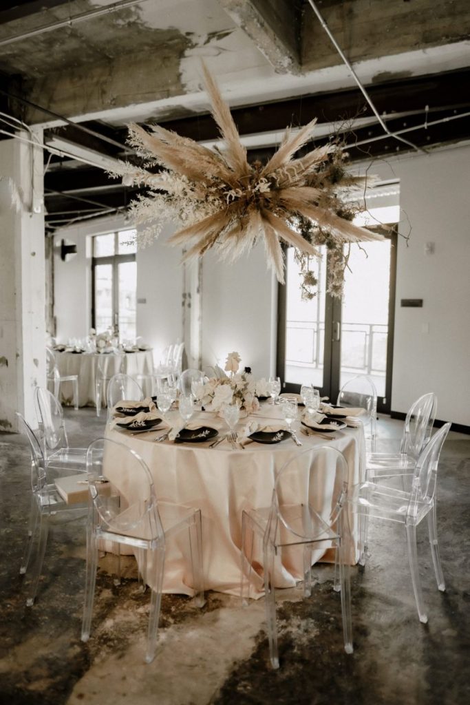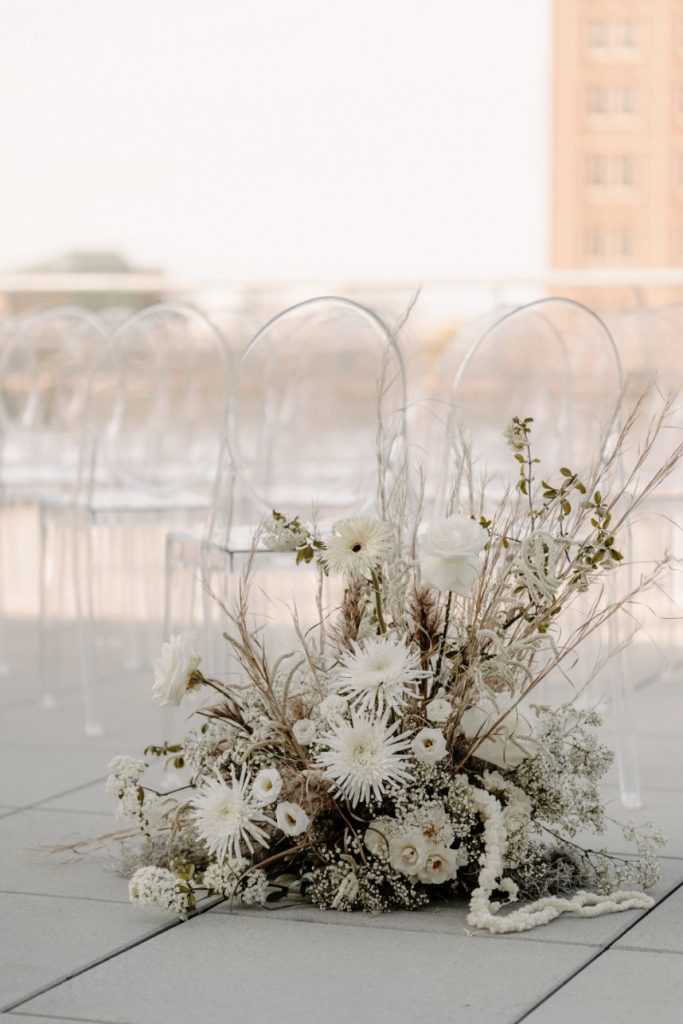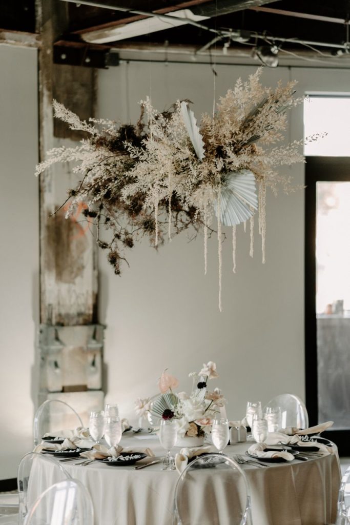 Dried grasses and florals, organic neutrals and modern architectural design all combine to create a seriously showstopping bohemian wedding held at the Sunset Coffee Building! This venue has so many spaces to offer and Isabelle and Chris tied the knot in an elevated rooftop ceremony (no pun intended), then headed down to the first floor to an industrial-style space with a balcony overlooking the bayous. Flora + Fauna went above and beyond with suspended, dried florals and wild-edged arrangements in all the most tasteful areas, accented with cascading sun-bleached amaranth and dried pampas among other pretty petals to captivate the boho feel! Isabelle looks gorgeous from head-to-toe, and we love her big Hollywood curls paired with simple bridal glam by Adorne Artistry – the look is just as perfect with her long-sleeved gown as it is with her white pantsuit reception outfit! SO cute! The newlyweds and their guests celebrated in high-fashion style, and with their soiree perfectly planned by Chancey Charm Weddings, it went off without a hitch. Cakes by Gina created a sleek and simple tiered white wedding cake adorned with a few berries for good measure. So many modern and organic elements take this wedding to another level, and some of our favorites were the aura reading portrait yurt as well as the wire photo op complete with dramatic dried florals and the couple’s initials in bright pink neon! Every detail in this modern, bohemian wedding is so cool and chic! Read on to hear a note from the bride about one of her favorite wedding memories. Cheers to Isabelle and Chris!
