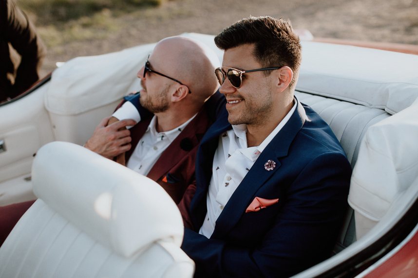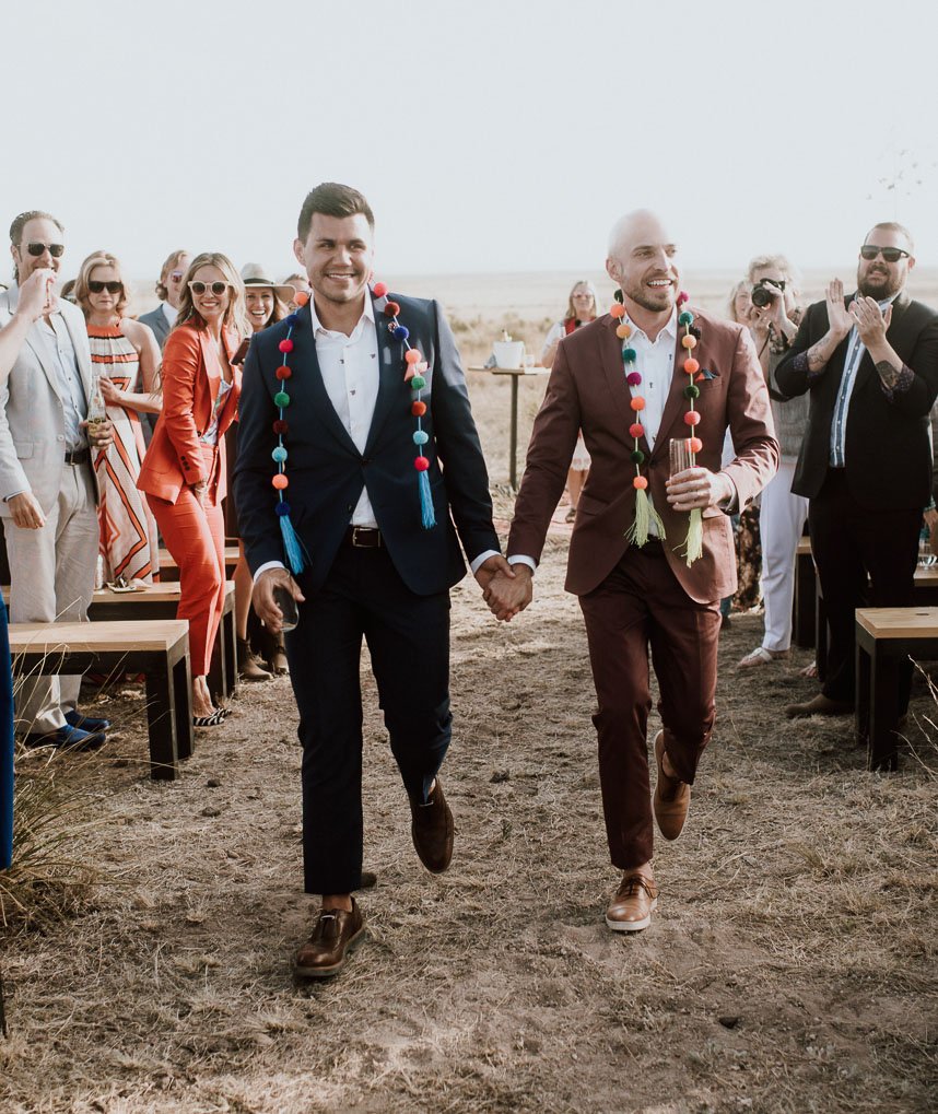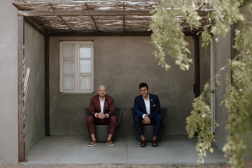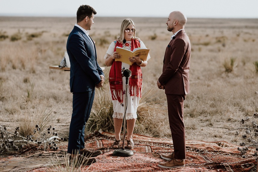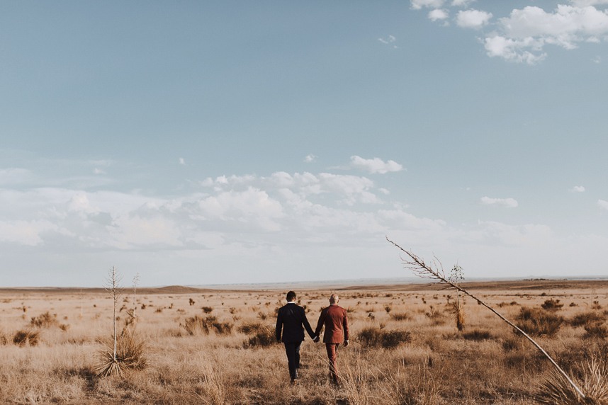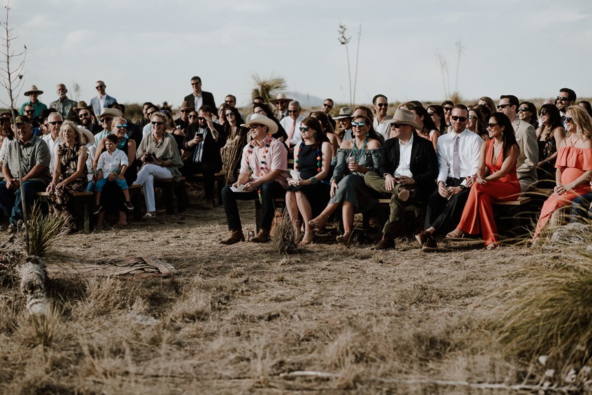 From the grooms: “Our wedding day was a celebration of 10 years of love and companionship, and it was a reflection of our personal styles – approachable and eclectic, with a mix of urban and country vibes that reflect our upbringing. We also wanted to share Marfa with our favorite people since it is our favorite place. We have been heading west multiple times a year for the past 11 years and honestly are so mesmerized by the landscape, the art and the people there. We were very relaxed the whole wedding day as we didn’t have a wedding party to coordinate. We felt as though all of the people in our lives are equally important and wanted to keep it as simple as possible, with attention to entertainment, food, experience and the landscape. Our favorite part of the day was driving west on Highway 90 just outside of Marfa for the ceremony arrival and seeing the crowd of friends and family waiting for us in the desert. We had a location about 1/4 mile off the main road where everyone was waiting for us and as we approached, our mothers met us halfway to walk us down the aisle… that’s when it felt real!”