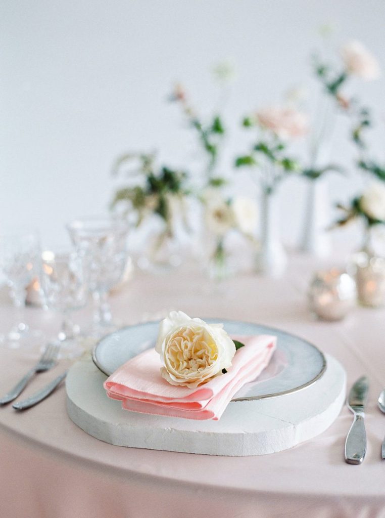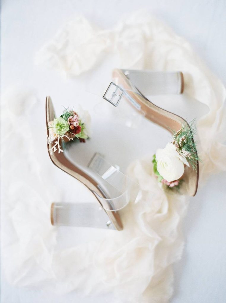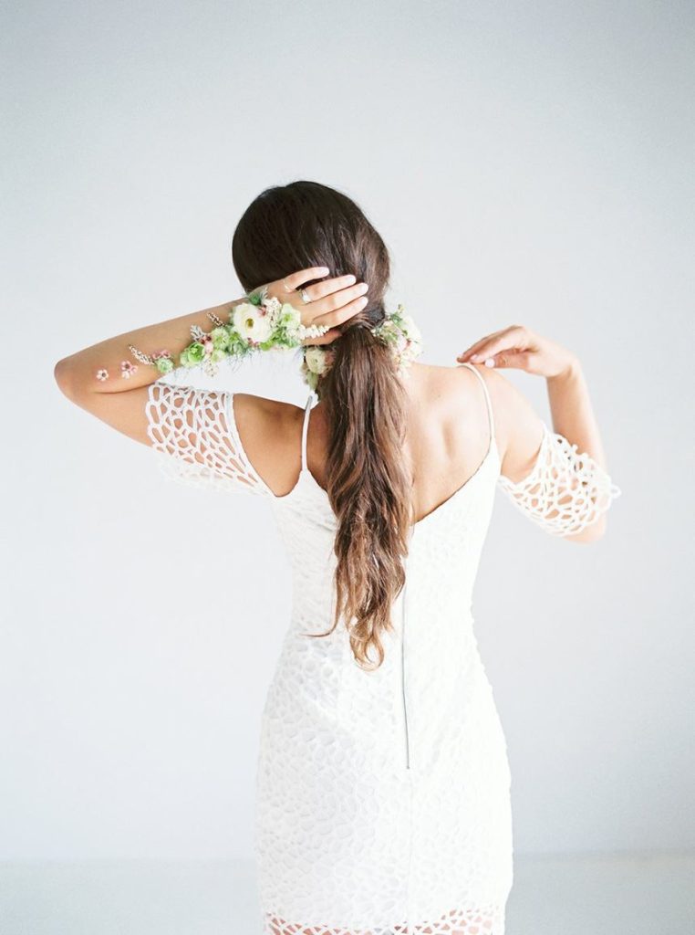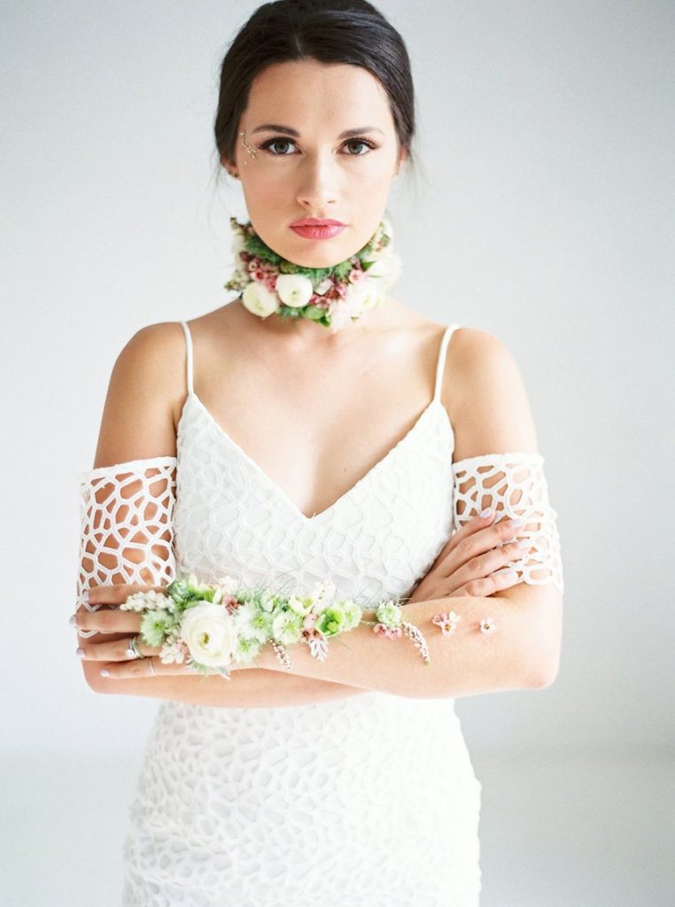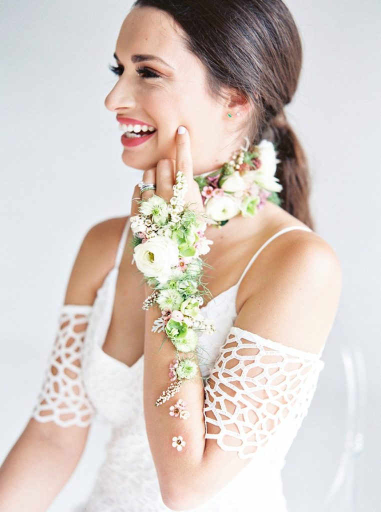 To tone down the sweetness to an otherwise girly and glamorous shoot, we’re loving the unique take on this edgy, styled shoot of bridal portraits captured by Awake Photography. The team behind floral studio Flower Vibes dreamed up a concept where softness subtly toughens up by way of limb-climbing blooms meant to resemble beautiful, blossoming flower tattoos. To bring this vision to life, the team first used a simple color palette of greens, whites and subtle infusions of pink to create a floral cuff that spanned from the model bride’s forearm to her finger to mimic trendy jewelry hand chains. The same blooms were trimmed down and wrapped around her neck in a choker-style arrangement. Coordinating arrangements filled with roses, wildflowers and greenery were used in the bride’s overflowing bouquet, varying table top decor, place settings and even as embellishment on the bride’s shoes! Trend-conscious clear strap and lucite-heeled shoes were a perfect match for a form fitting, cold shoulder open weave gown matched with a sleek ponytail and neutral smokey eye from Hey Lovely. A sugary sweet table setting complete with soft pink linens and porcelain, marble and crystal serveware and candle lit votives was the proverbial icing on the cake to this unique bridal shoot!