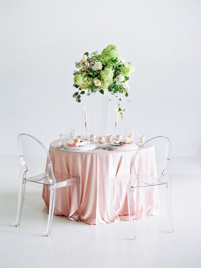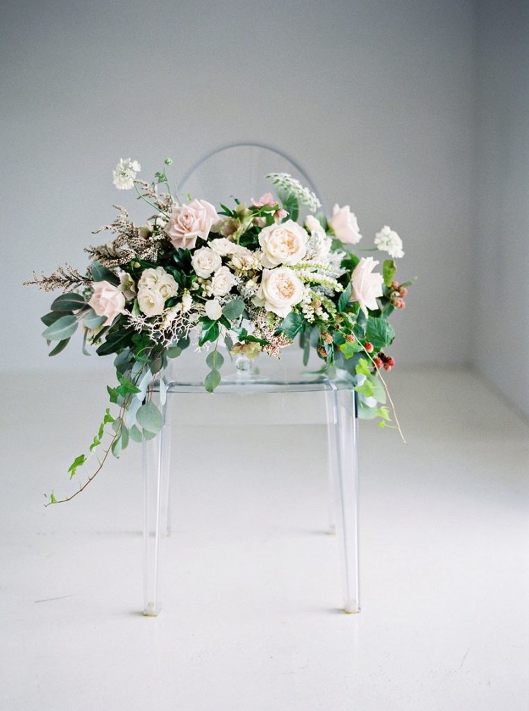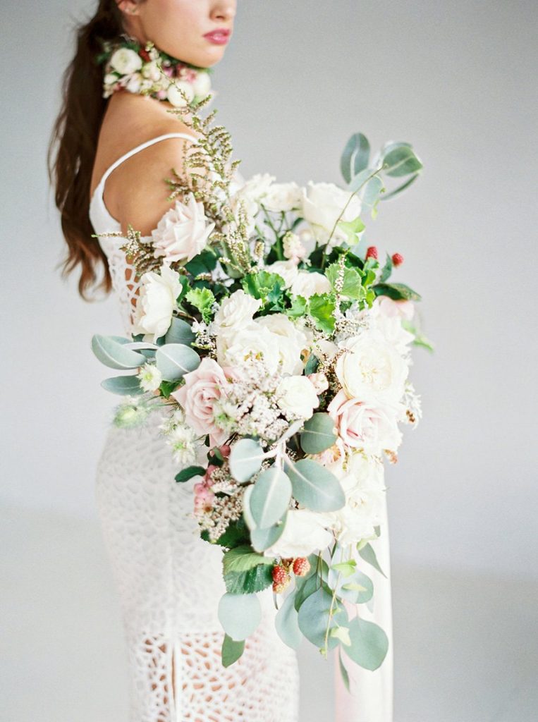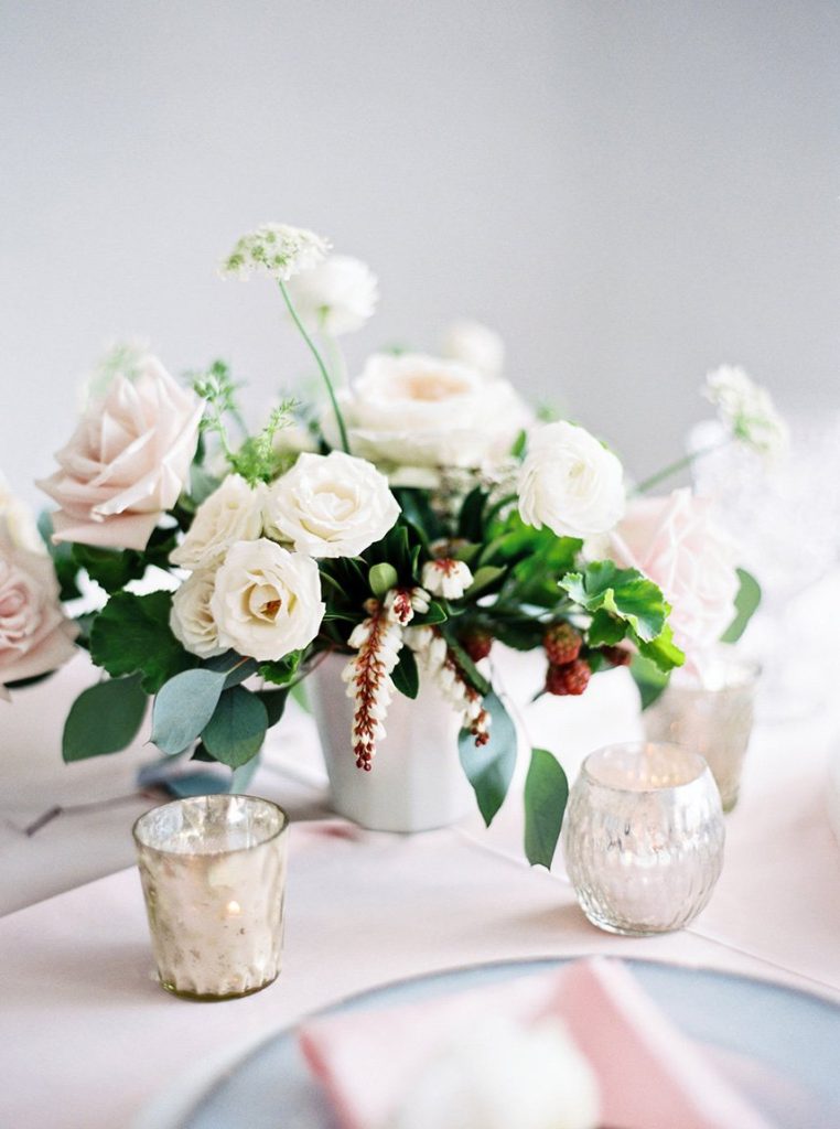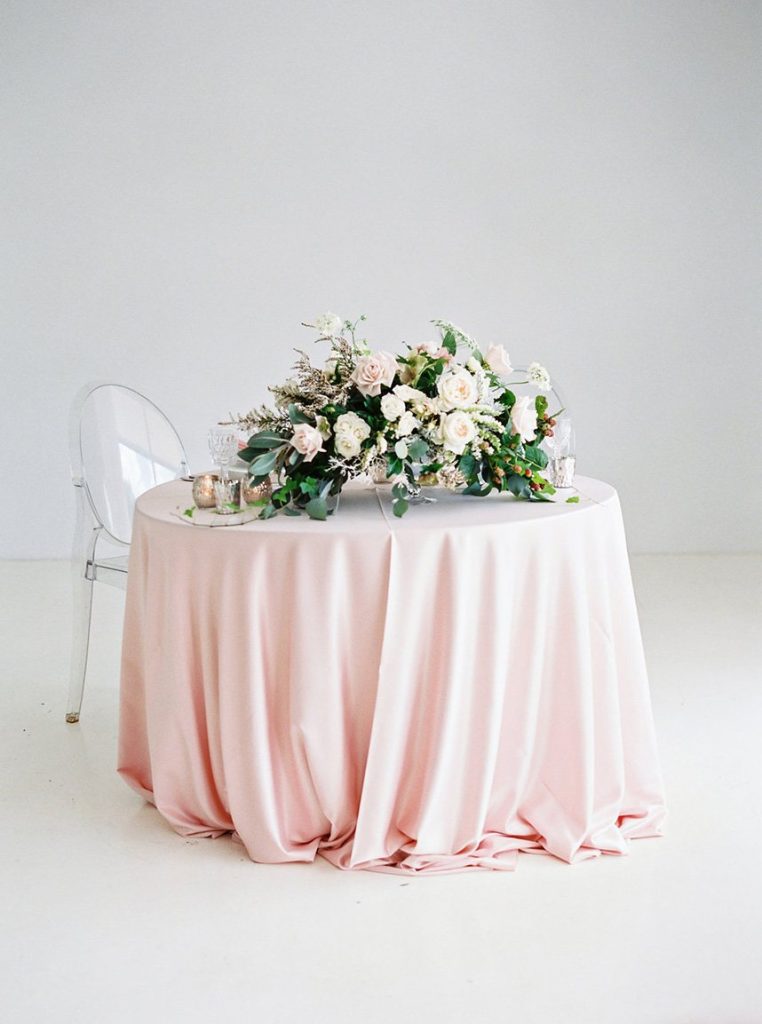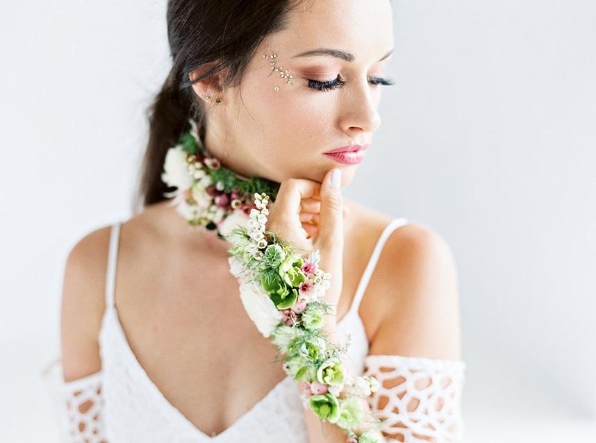 To tone down the sweetness to an otherwise girly and glamorous shoot, we’re loving the unique take on this edgy, styled shoot of bridal portraits captured by Awake Photography. The team behind floral studio Flower Vibes dreamed up a concept where softness subtly toughens up by way of limb-climbing blooms meant to resemble beautiful, blossoming flower tattoos. To bring this vision to life, the team first used a simple color palette of greens, whites and subtle infusions of pink to create a floral cuff that spanned from the model bride’s forearm to her finger to mimic trendy jewelry hand chains. The same blooms were trimmed down and wrapped around her neck in a choker-style arrangement. Coordinating arrangements filled with roses, wildflowers and greenery were used in the bride’s overflowing bouquet, varying table top decor, place settings and even as embellishment on the bride’s shoes! Trend-conscious clear strap and lucite-heeled shoes were a perfect match for a form fitting, cold shoulder open weave gown matched with a sleek ponytail and neutral smokey eye from Hey Lovely. A sugary sweet table setting complete with soft pink linens and porcelain, marble and crystal serveware and candle lit votives was the proverbial icing on the cake to this unique bridal shoot!