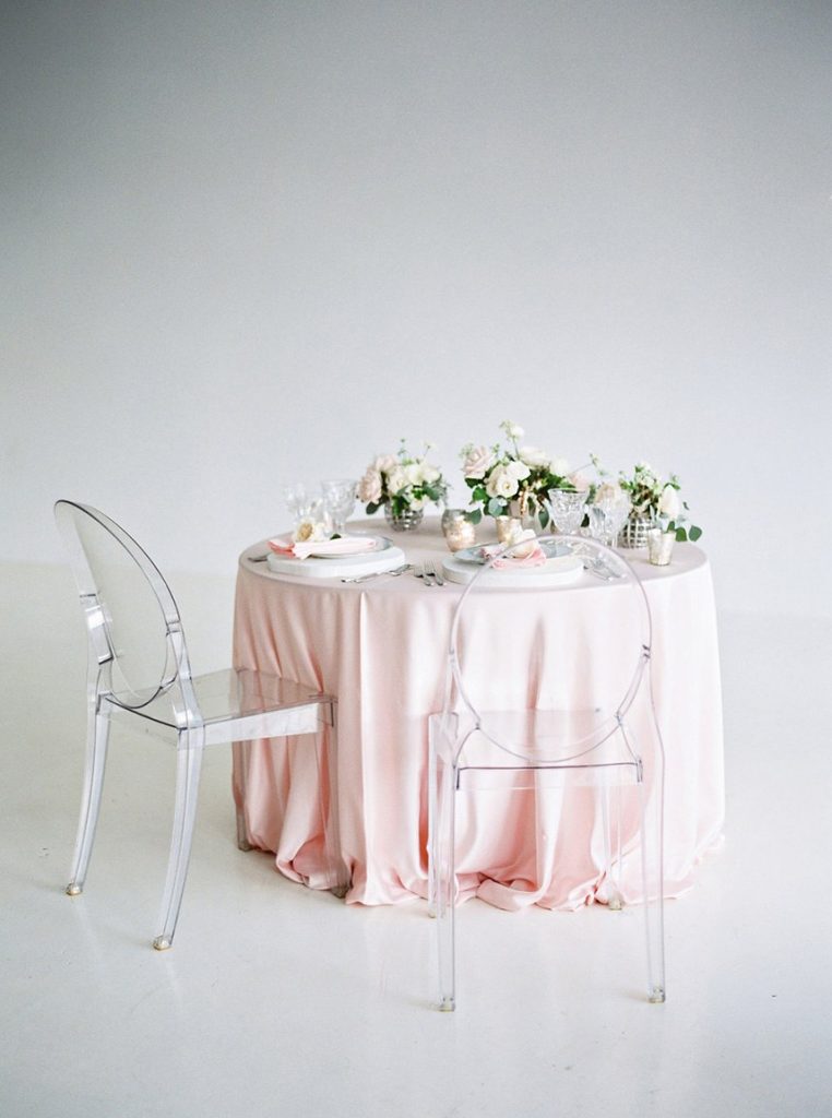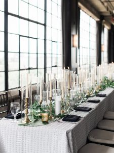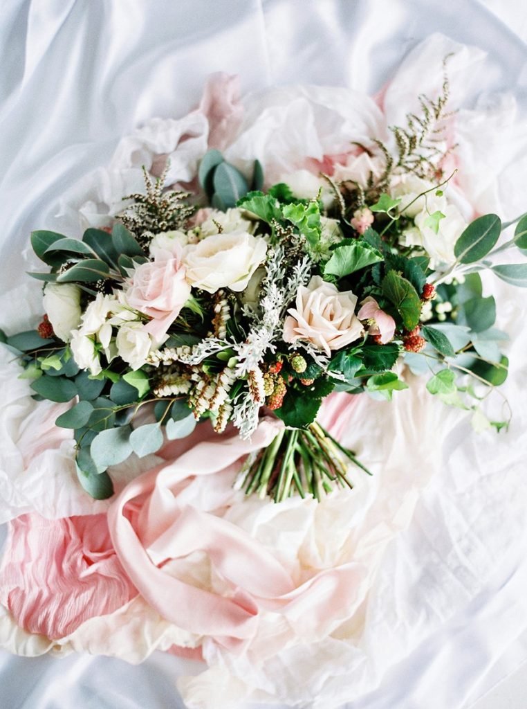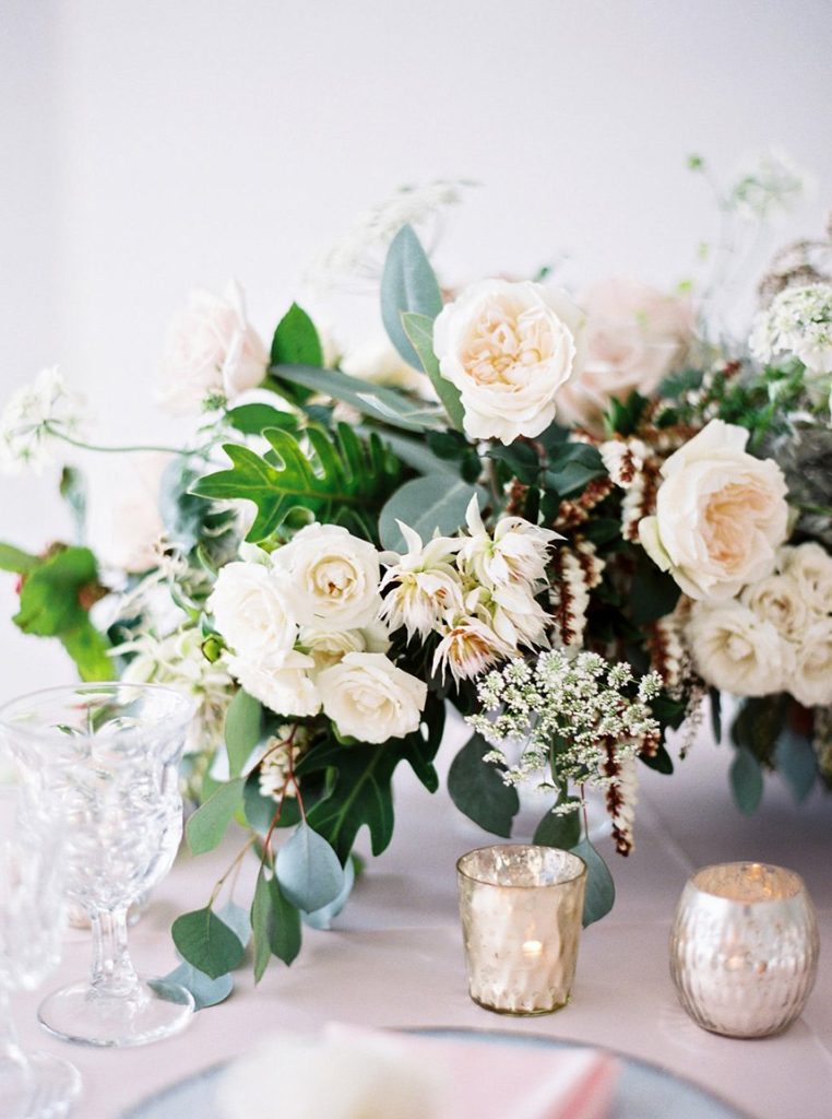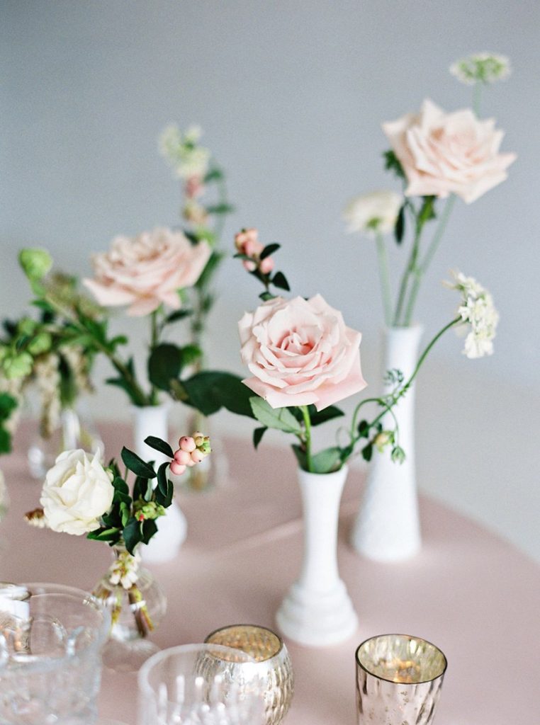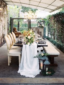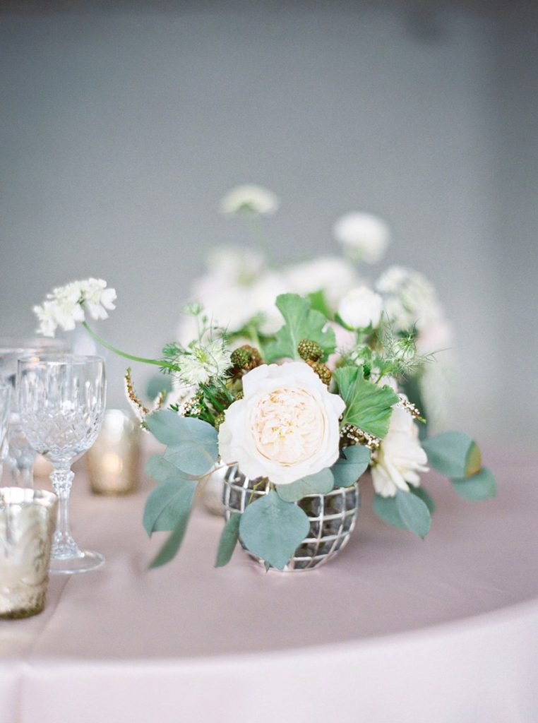To tone down the sweetness to an otherwise girly and glamorous shoot, we’re loving the unique take on this edgy, styled shoot of bridal portraits captured by Awake Photography. The team behind floral studio Flower Vibes dreamed up a concept where softness subtly toughens up by way of limb-climbing blooms meant to resemble beautiful, blossoming flower tattoos. To bring this vision to life, the team first used a simple color palette of greens, whites and subtle infusions of pink to create a floral cuff that spanned from the model bride’s forearm to her finger to mimic trendy jewelry hand chains. The same blooms were trimmed down and wrapped around her neck in a choker-style arrangement. Coordinating arrangements filled with roses, wildflowers and greenery were used in the bride’s overflowing bouquet, varying table top decor, place settings and even as embellishment on the bride’s shoes! Trend-conscious clear strap and lucite-heeled shoes were a perfect match for a form fitting, cold shoulder open weave gown matched with a sleek ponytail and neutral smokey eye from Hey Lovely. A sugary sweet table setting complete with soft pink linens and porcelain, marble and crystal serveware and candle lit votives was the proverbial icing on the cake to this unique bridal shoot!