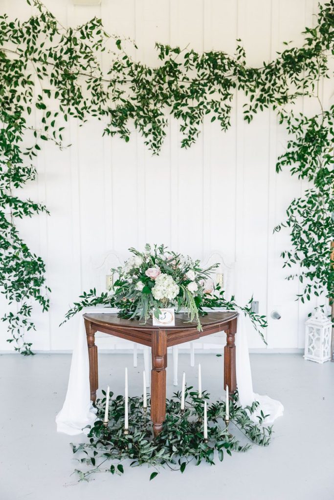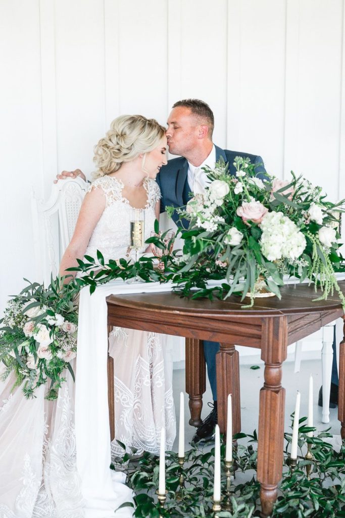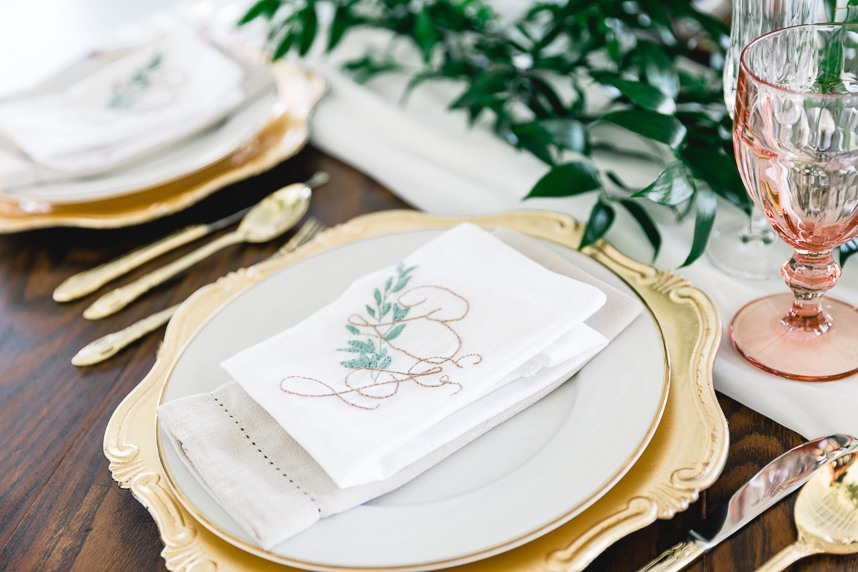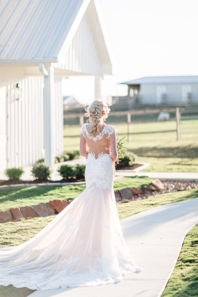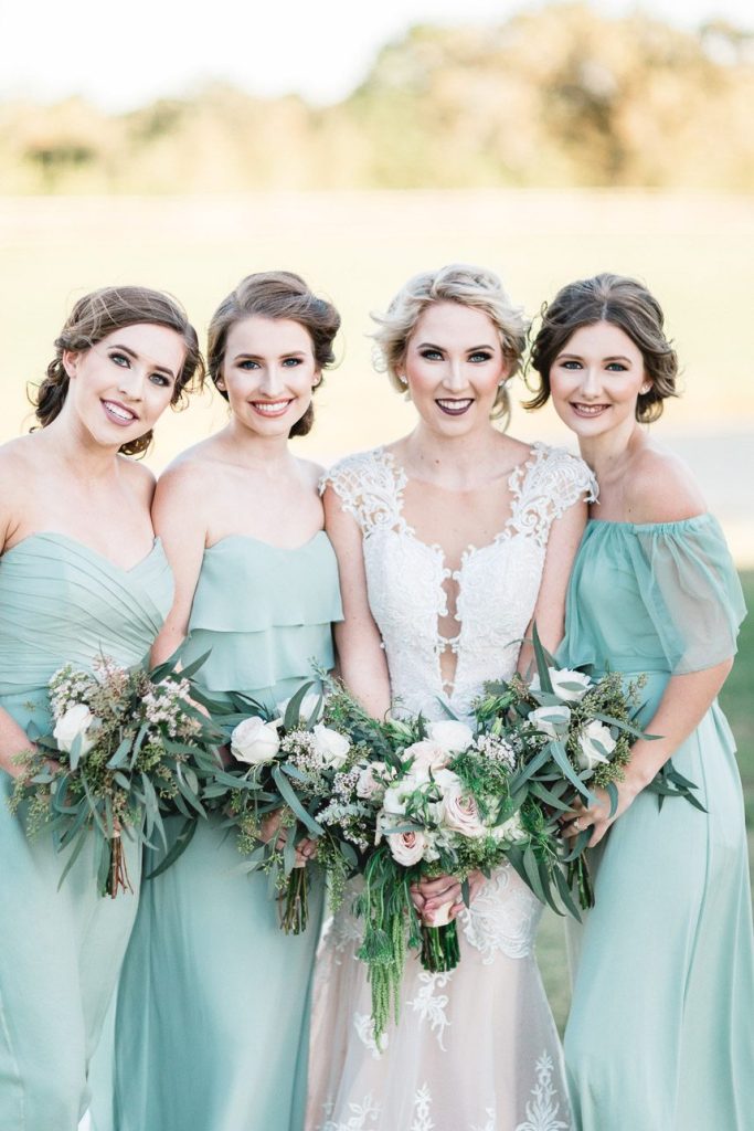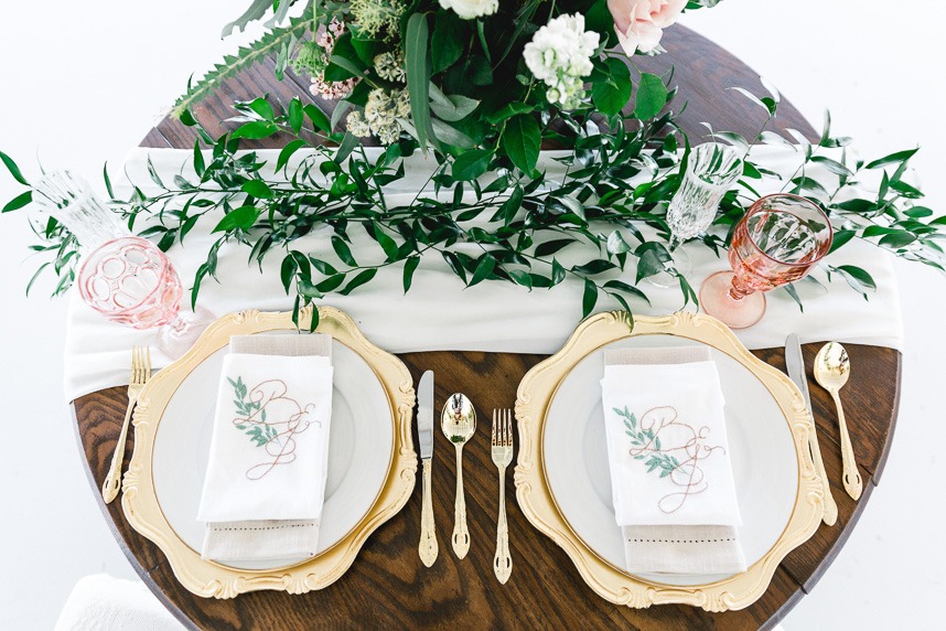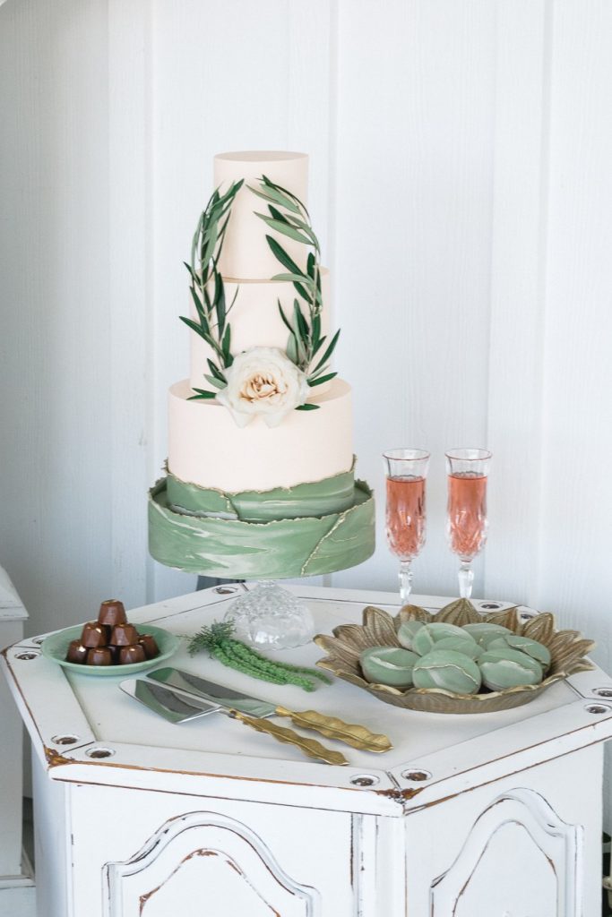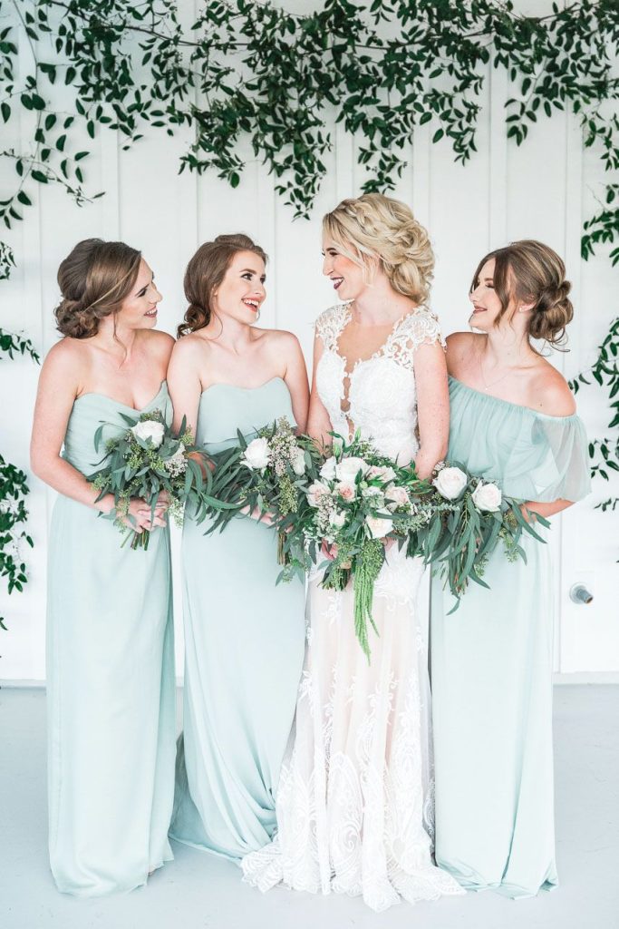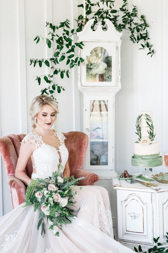 There’s nothing like a fresh take on a classic wedding palette that can make our hearts skip a beat, and this elegant mint farmhouse styled shoot is no exception! Planned and styled by Rachel May Weddings, the crisp white walls of The Farmhouse wedding venue made the perfect backdrop for shades of mint and light blue alongside pops of green – the perfect combination for spring! Gold elements tied everything together, from the tablescape to the cake setup to the jewelry. The model bride’s stunning lace gown with an illusion back from Whittington Bridal is accentuated by her romantic braided updo and dramatic look from Hey Doll Beauty. The marble cake, luscious greenery table runner, candlesticks, sweetly embroidered napkins and string lights hung above are some of our favorite touches of this darling styled shoot! Cheers to springtime!