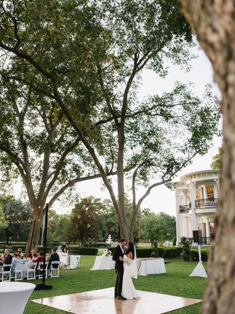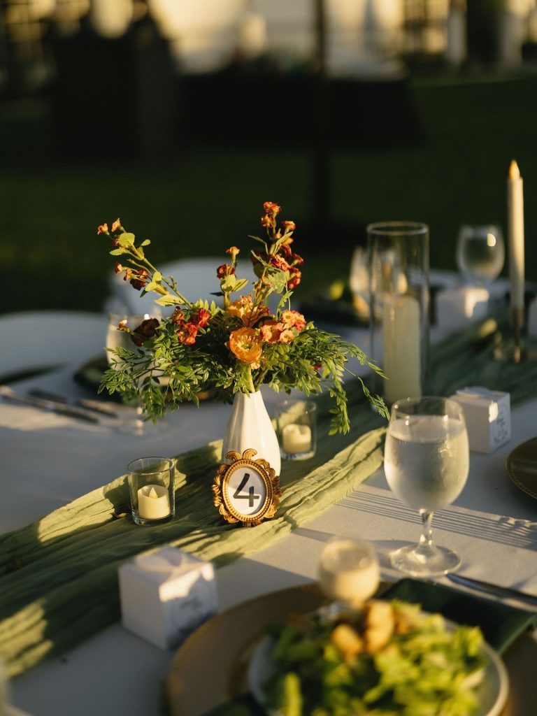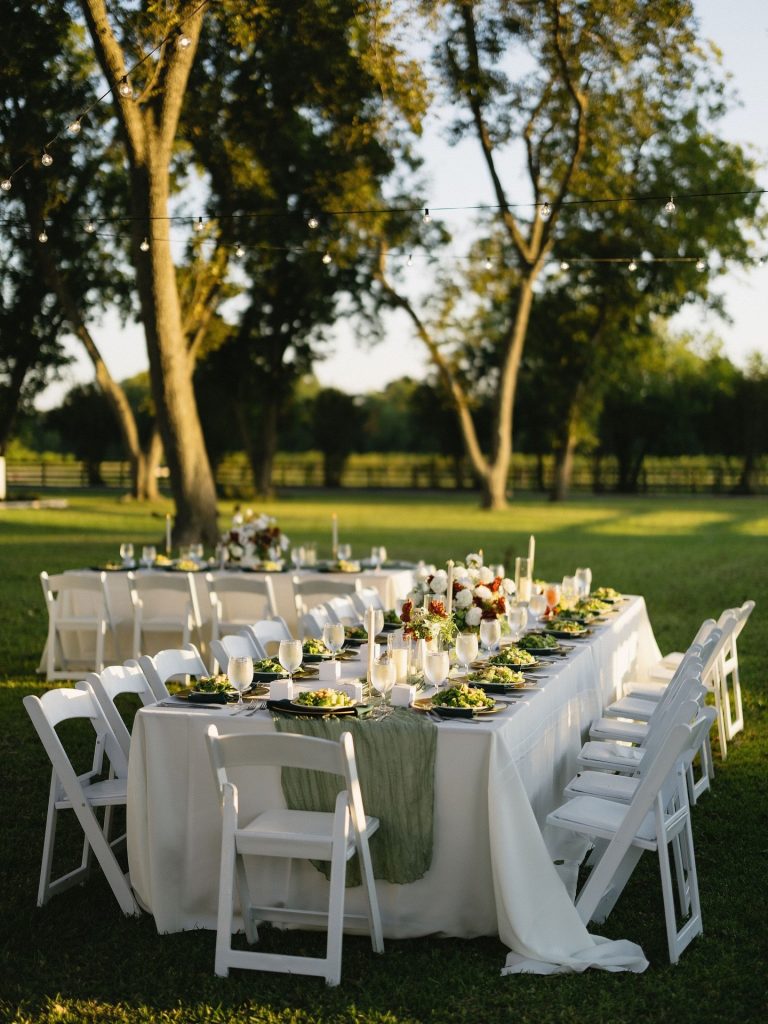 We love how they leaned into the outdoor spaces with long tables, warm tones, and a dance floor set right on the lawn as the sun went down, all brought together so beautifully by Weddings by Andrea!