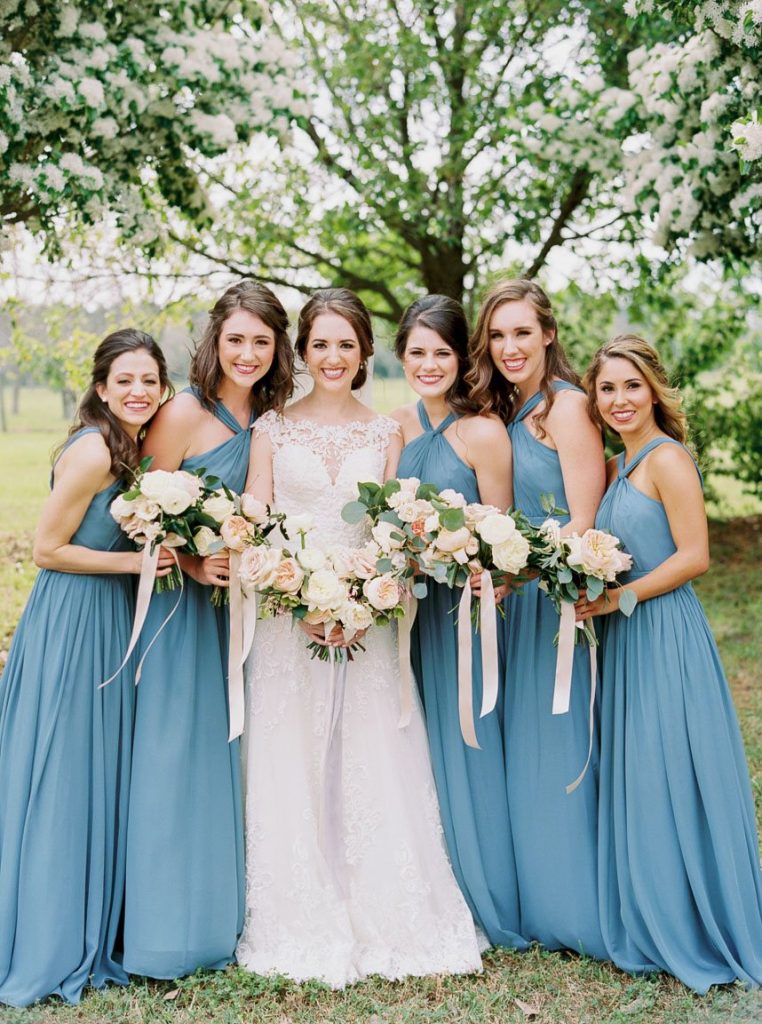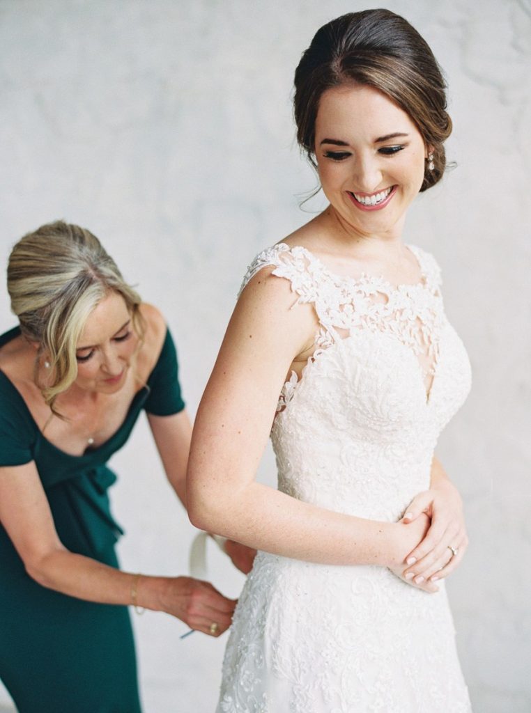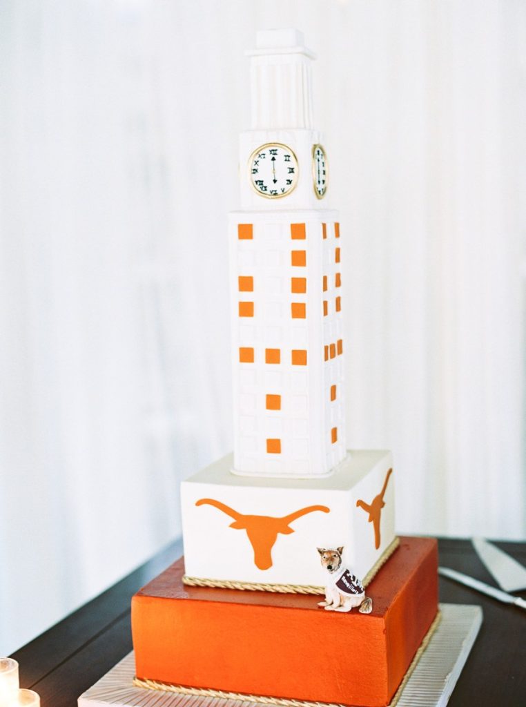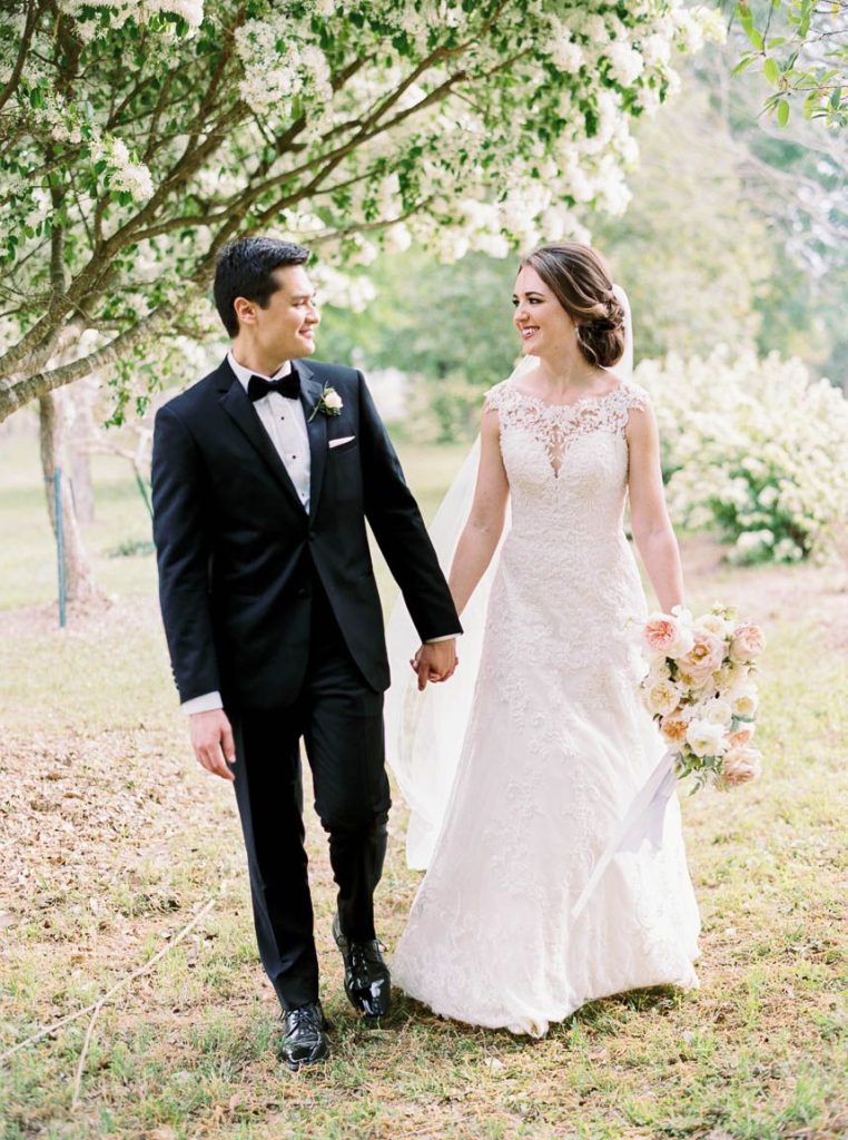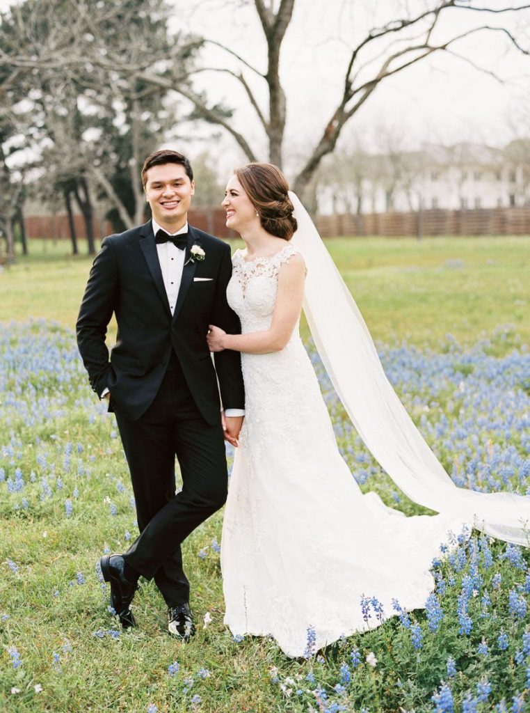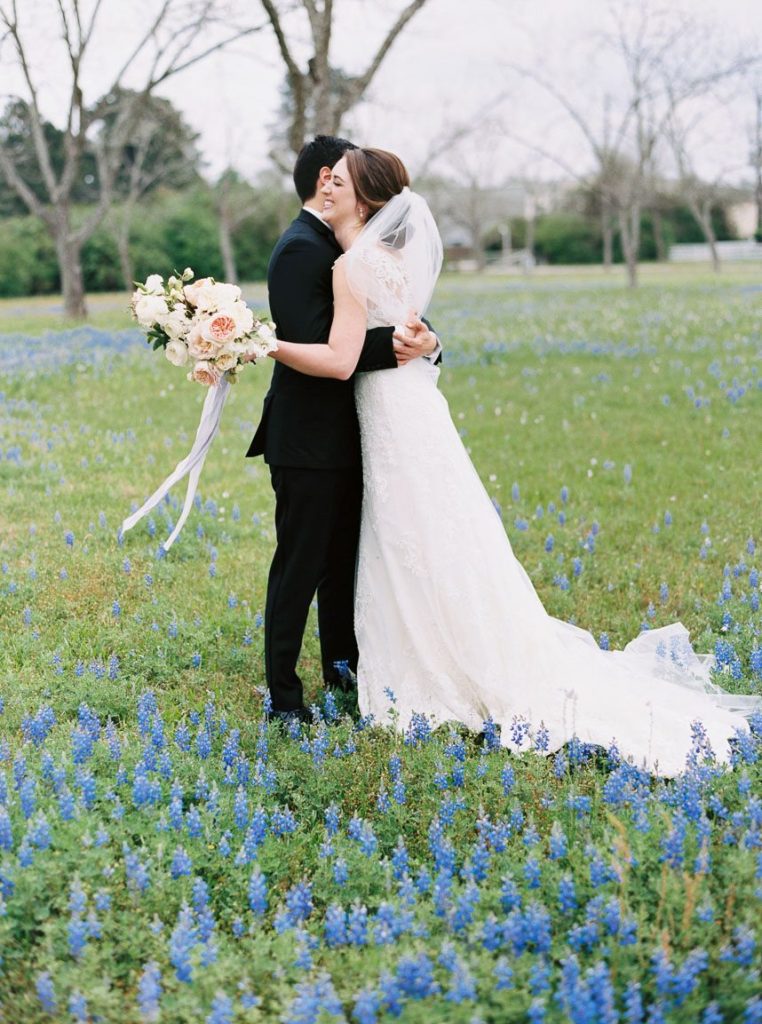 From the bride: “Justin and I met over a game of corn hole during our medical school’s new student mixer. We quickly became friends and before we knew it, we were doing everything together, from studying to sharing popcorn at the movies to signing up for a marathon. Despite Justin being a Longhorn and me being an Aggie, Justin decided to ask me out, and after taking me on a date to the theater, we started dating! I wanted our wedding to enhance the natural spring beauty of Chandelier Grove and feel dreamy and romantic. When I arrived with my bridesmaids and mom the morning of the wedding, I squealed with excitement because EVERYTHING was in bloom! Bluebonnets were bursting with color, and trees were covered in beautiful white flowers. I couldn’t believe it was our wedding day; it felt too good to be true! The feeling of thankfulness was a theme throughout the rest of the day. Justin and I felt so happy that so many of our friends and family wanted to be with us to celebrate. My favorite detail was my two ‘something blue’ and ‘something borrowed’ rings. I borrowed a blue sapphire ring from my grandmother on my mom’s side, and my cousin gifted me a blue turquoise ring made from jewelry worn by my grandmother on my father’s side. Justin and I also built corn hole sets (one for UT and one for A&M) so guests could enjoy the game that brought us together.”