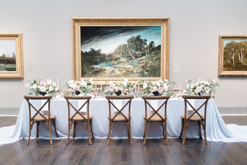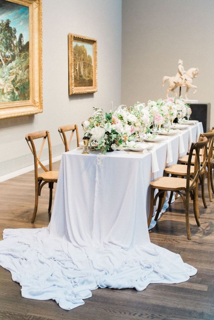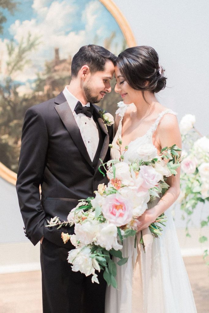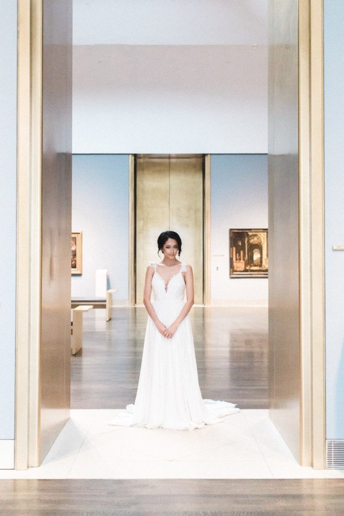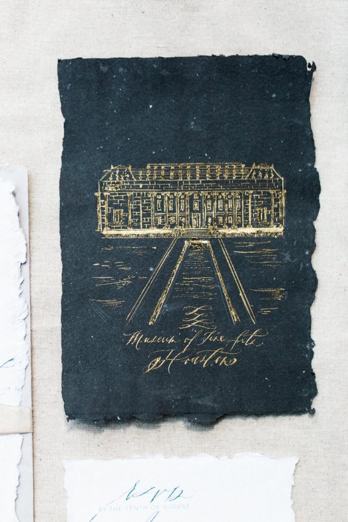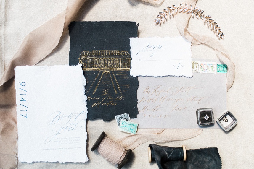 We’re in awe of this ethereal artistic styled shoot captured by Marni Wishart at Houston’s Museum of Fine Arts. With neutrals and metallics complementing hues of muted navy and touches of blush, this understatedly elegant shoot has a wow factor only magnified by the contemporary event design and stunning florals by Maxit Flower Design. Adorne Artistry gave the model bride a timeless look, while the soft lines of her gown from Unbridaled tied in perfectly with the flowy linens and ribbons on the cake made by Buttercup Bakery. Each and every detail from the exquisite jewelry to the hand-lettered invitation suite has us completely in love!
