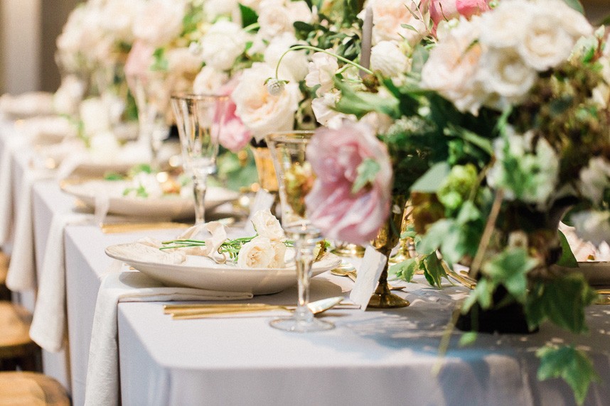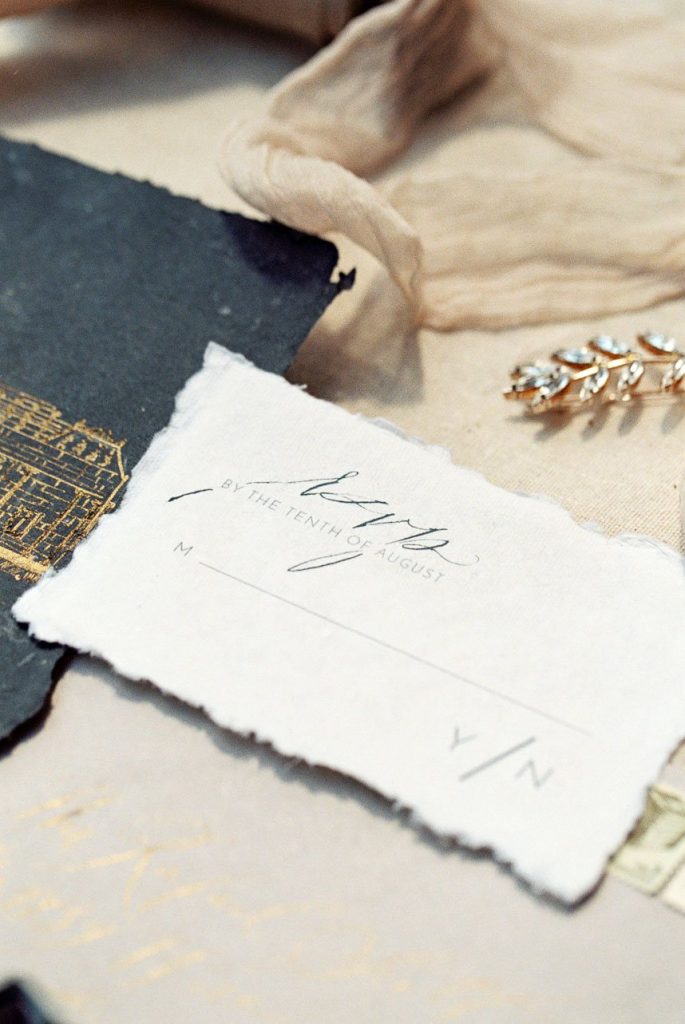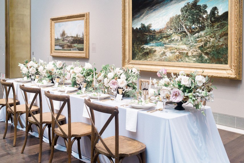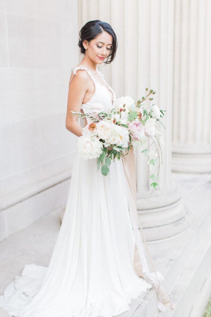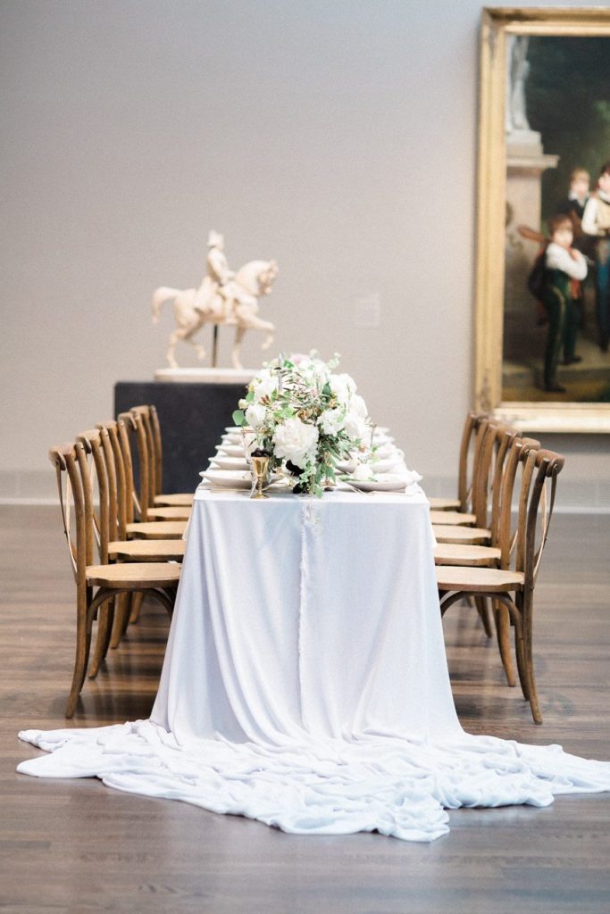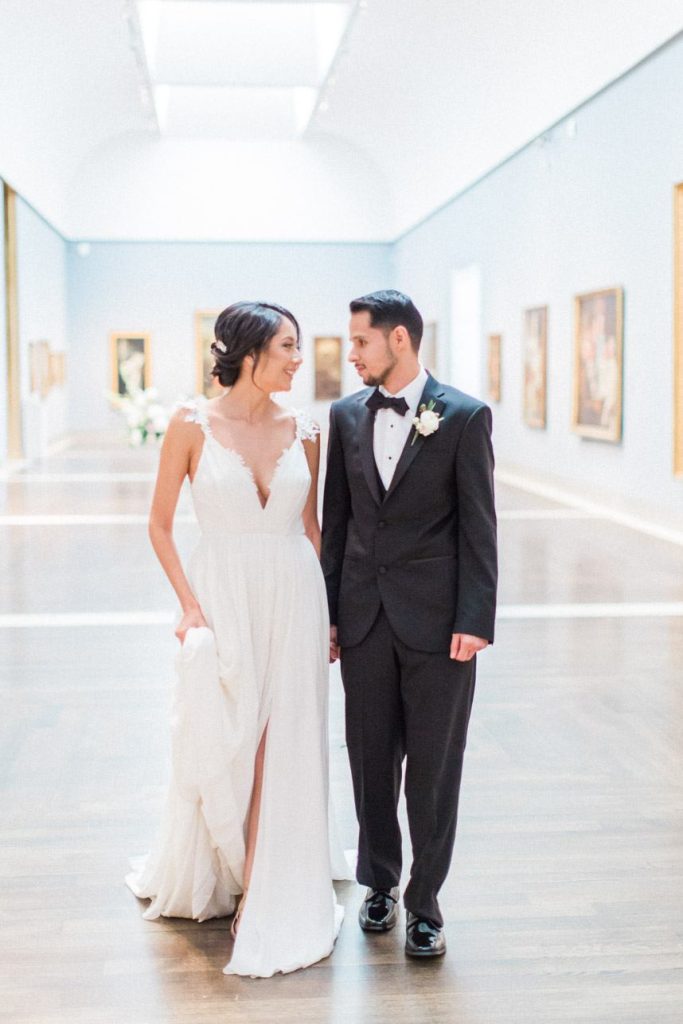 We’re in awe of this ethereal artistic styled shoot captured by Marni Wishart at Houston’s Museum of Fine Arts. With neutrals and metallics complementing hues of muted navy and touches of blush, this understatedly elegant shoot has a wow factor only magnified by the contemporary event design and stunning florals by Maxit Flower Design. Adorne Artistry gave the model bride a timeless look, while the soft lines of her gown from Unbridaled tied in perfectly with the flowy linens and ribbons on the cake made by Buttercup Bakery. Each and every detail from the exquisite jewelry to the hand-lettered invitation suite has us completely in love!