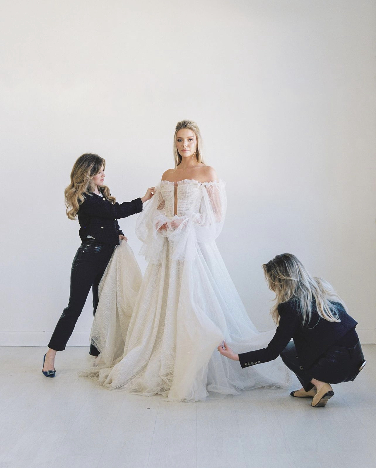 Building on the success of Etoilly Artistry, Hailey and Kailey recently launched Etoilly Atelier, an extension of their brand designed to address a bride’s complete wedding wardrobe needs. Etoilly Atelier offers personalized styling services that go beyond just selecting a wedding dress. From sourcing the perfect gown to curating the ideal accessories, including shoes, jewelry, and veils, Etoilly Atelier ensures every element of a bride’s ensemble works harmoniously to reflect her unique vision. This also goes beyond the wedding day ensemble; Hailey and Kailey’s team provide styling for the perimeter events of a bride’s wedding day as well as a hands-on approach on wedding day ensuring that gown, veil, and other special belongings are clean, pristine, and picture perfect for the day.