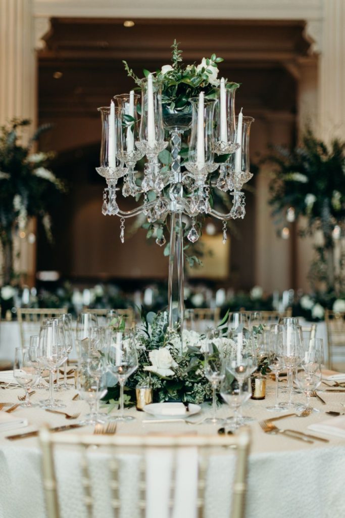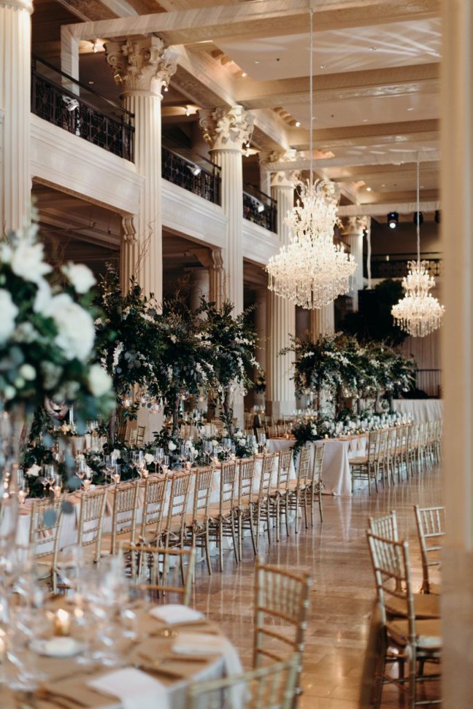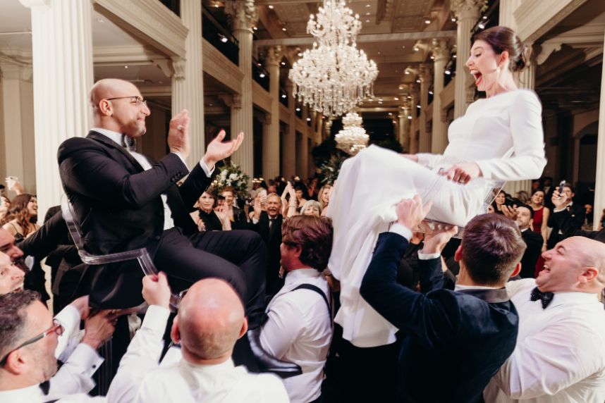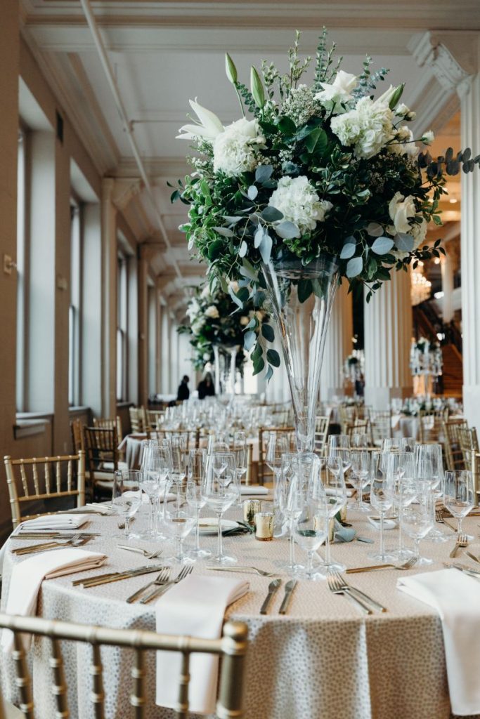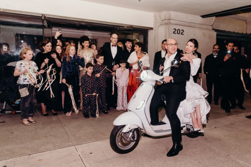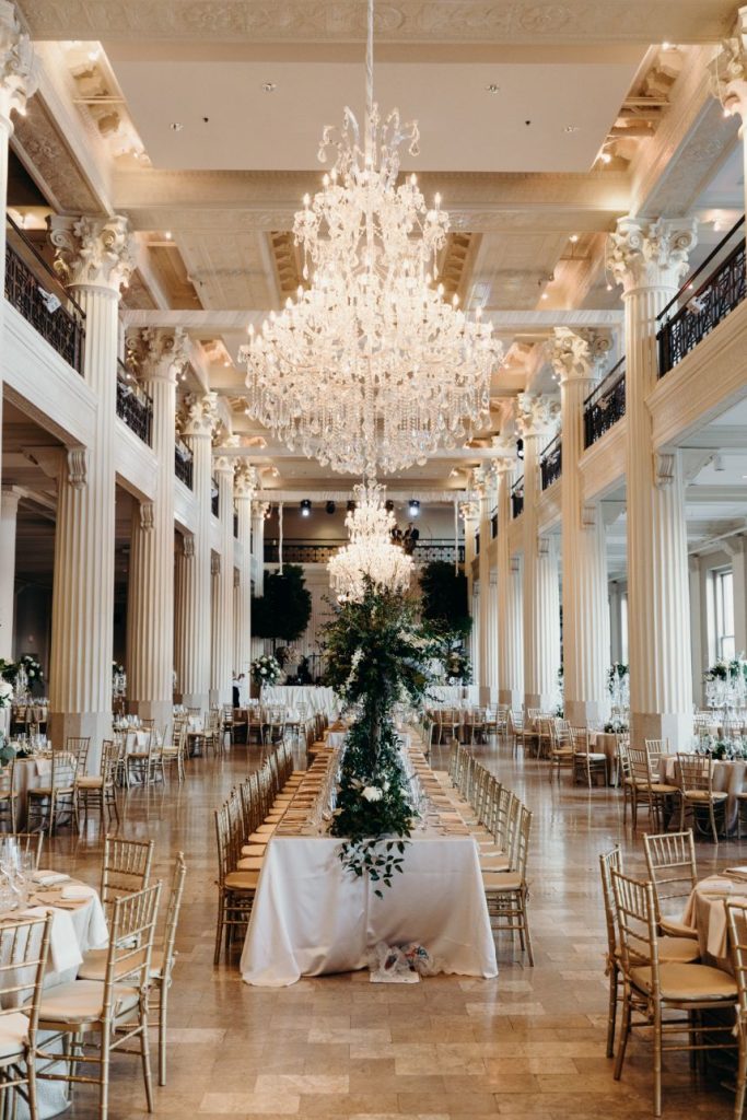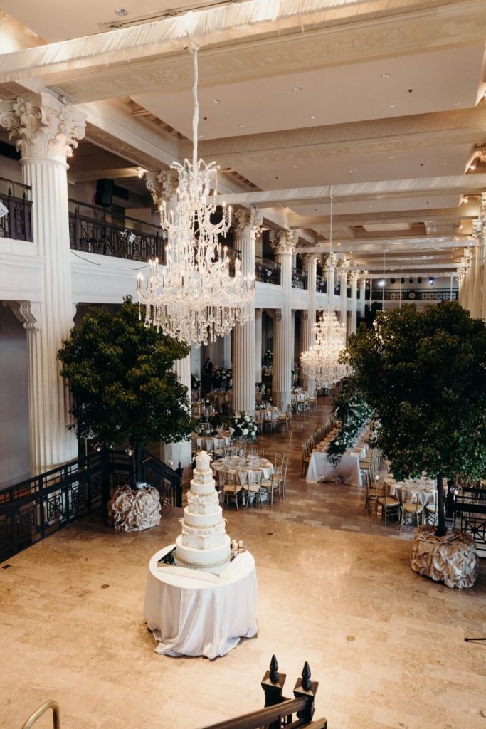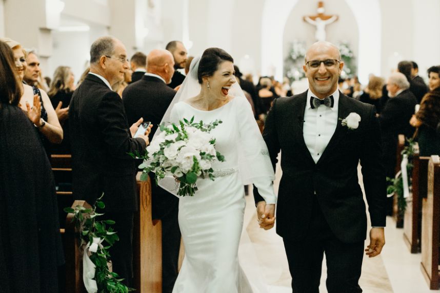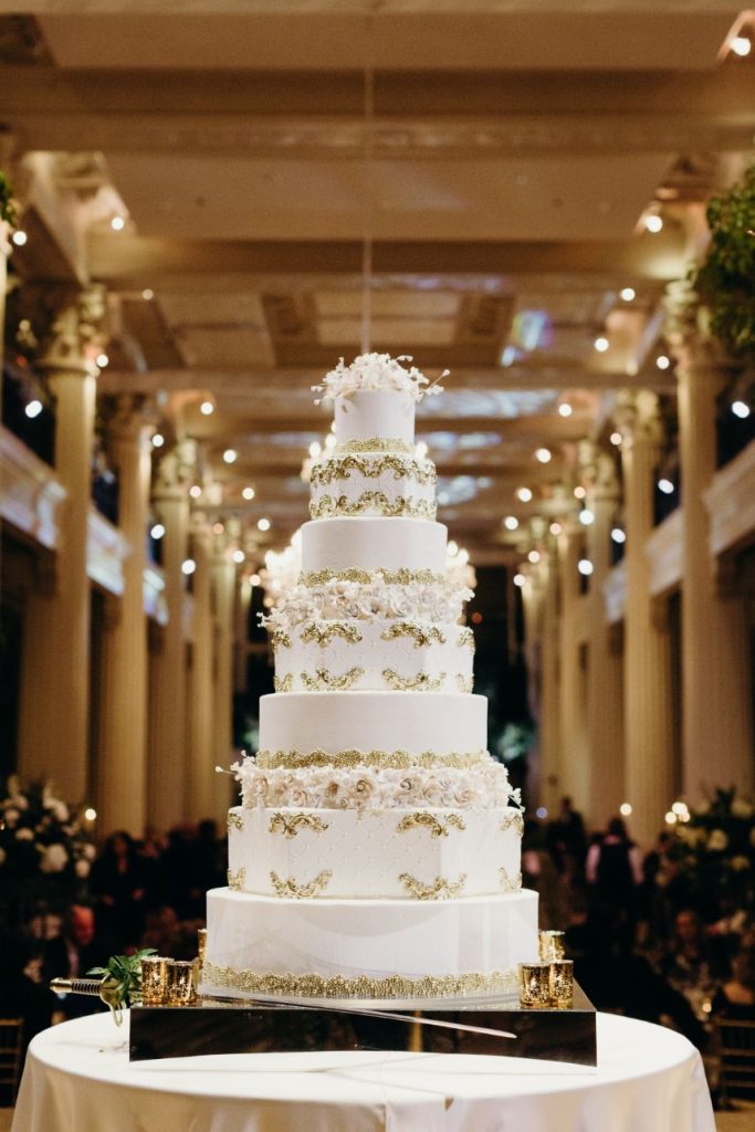 Now, in their lush fall wedding of gold, ivory and greens, the couple was able to combine their wanderlust with stylistic details that would tell their love story for all their family and friends to witness. Bride Falynn looked effortlessly beautiful, styled by artists at Hey Lovely with a chic chignon updo, classic glam and a bold lip to walk unaccompanied down the aisle by her preference. Looking back, she says she could hardly wait to make it to her soon-to-be husband and remembers her now mother-in-law gesturing for her to slow down. She was simply stunning in a Mikaella by Paloma Blanca gown in style #2105 from Brickhouse Bridal, featuring clean lines, long sleeves, an elegant bateau neckline, and a lovely likeness to Meghan Markle’s royal gown. The groom’s Lebanese heritage also played a large part in their luxe affair. Falynn and Dakrin included three different musicians throughout the evening – a live jazz band, a live Lebanese band, and a live DJ just to have all bases covered. The music was a big hit and everyone participated in Lebanese dabke dancing, plus the bride and groom were hoisted into the air sitting on chairs. Their intricate wedding cake measured eight feet tall atop its display table and consisted of seven delectable tiers that the newlyweds sliced into with a sword. They made so many memories and exchanged some sweet words with guests before the new Mr. and Mrs. saddled up for an exit ride on a pearl white vintage Vespa! The talented Reverent Wedding Films captured every detail of their day so beautifully in a highlight down below. Read on for a note from the bride about her favorite wedding day memory and what made it so sweet. Cheers to the Dows!