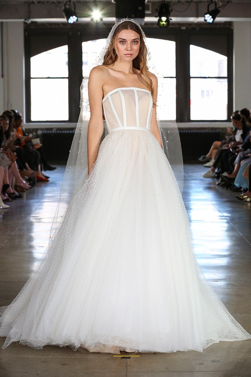 With another runway season behind us, we’re heading into the end of the year already looking forward to what Fall 2019 has in store for brides-to-be! Cooler weather seasons allow for greater experimentation with texture, layers, silhouettes and even color palette, and designers certainly proved this to be true for next fall’s lineup of runway fashion. From heavy embellishments to new accessories, there’s something a little dazzling for every bride, no matter your style! Scroll on for a few of our standouts and be sure to check out our Instagram profile for more live-action photos straight from the shows under the “FASHION” highlight tab!