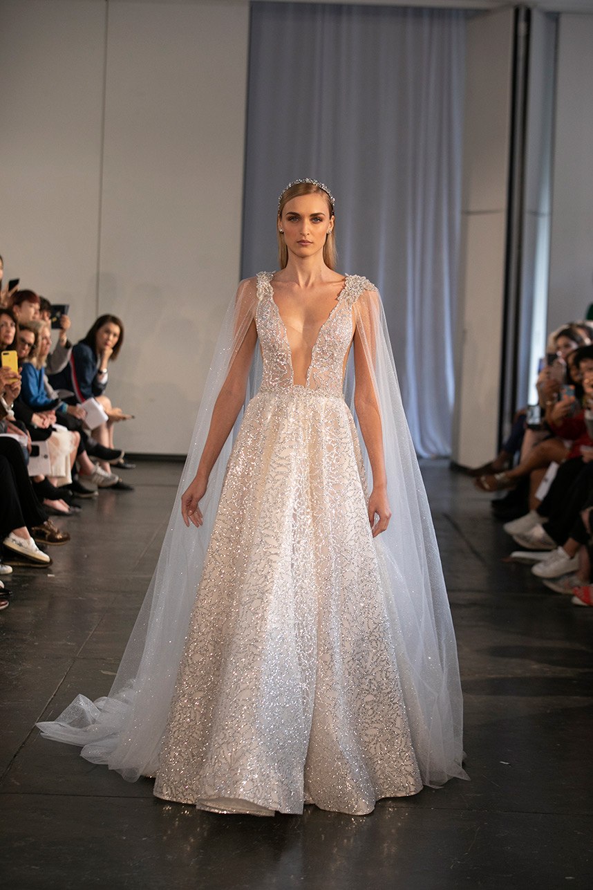 While capes have become no stranger to the runways over the last few years, this season it was evident that they’re here to stay. In fact, a staggering number of designers favored showing looks that featured cape styles seemingly altogether replacing the need for a veil. Looks featuring attachments to the gown were neatly hidden on straps or even built-in similar to a hood to create multiple looks on one gown. Others paired the cape as an accessory. But regardless of the style, the one commonality was the trailing length behind each gown as if creating the look of a cathedral-length veil. Be sure to look for this fabulous Berta style and other cape looks from the Muse by Berta Fall 2019 collection at Stephen Grace Atelier.