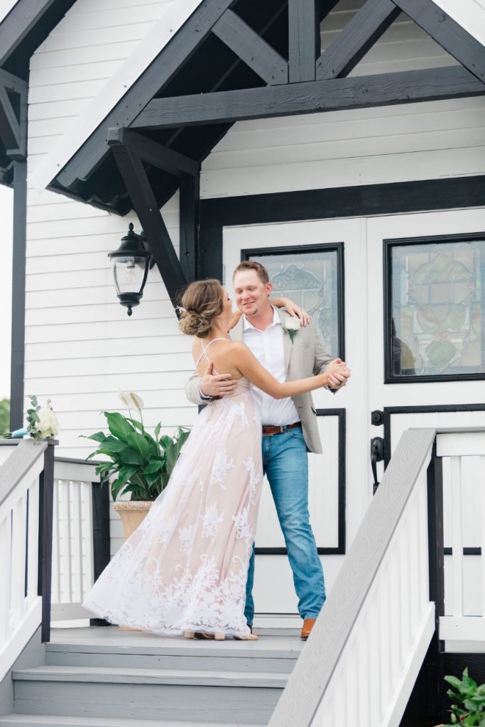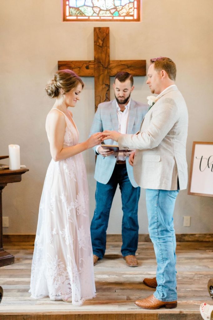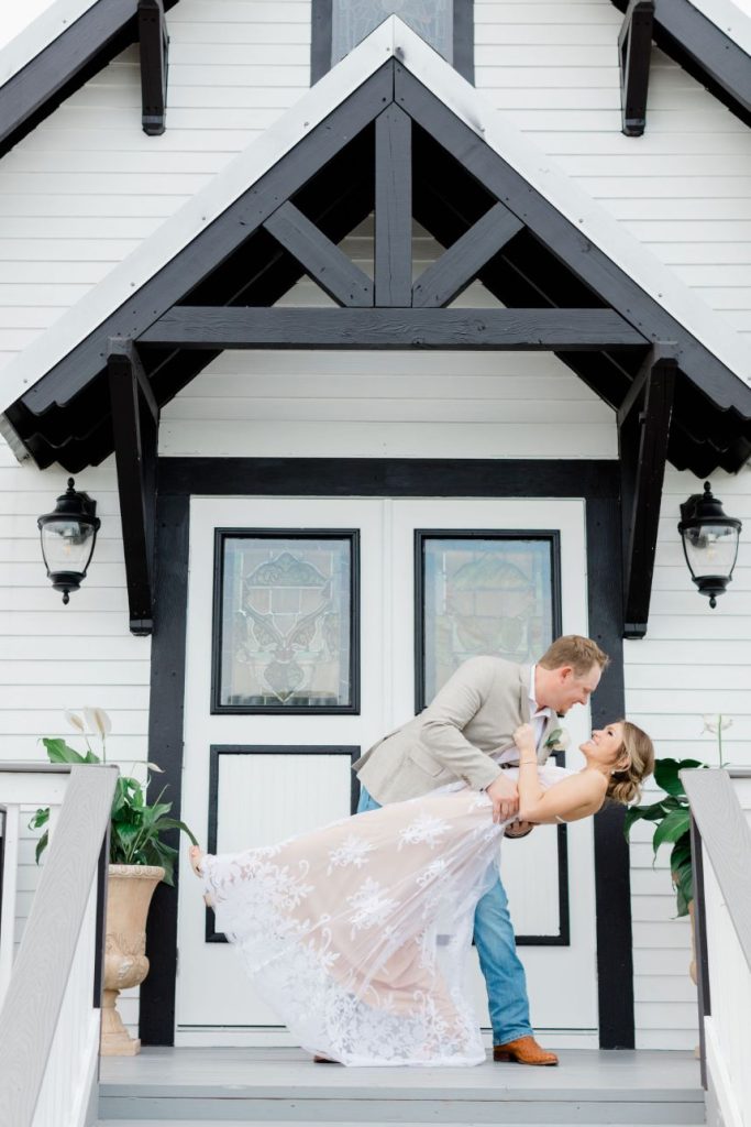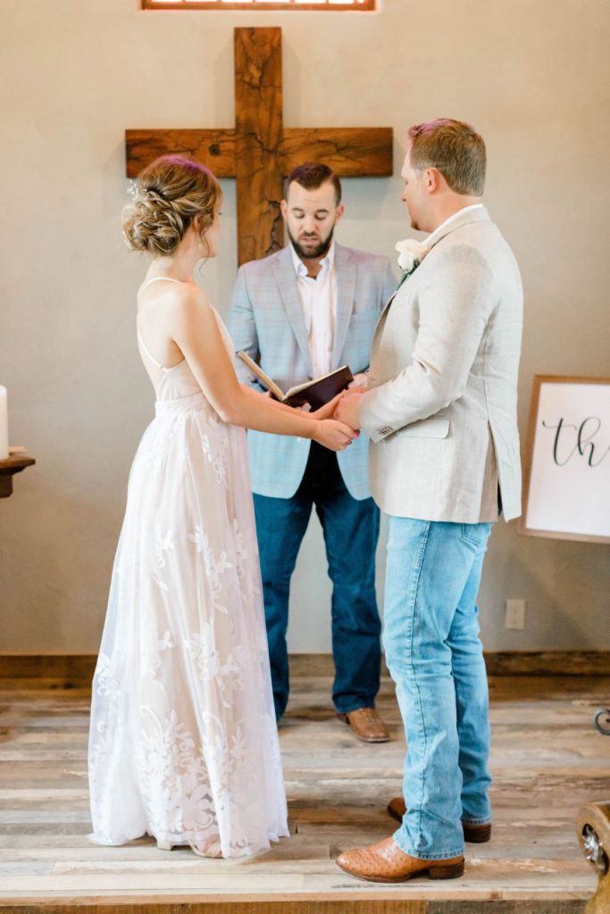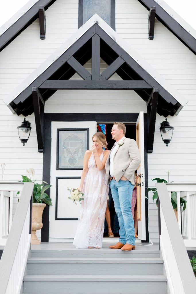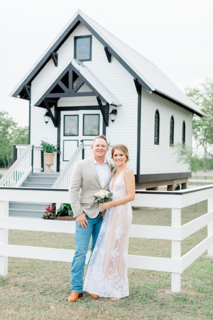 Procuring a venue for this intimate Corona wedding took a little more effort than just touring and booking! Spoiler alert: Tiffany and Zach’s adorable chapel ceremony is held in a venue everyone in the family helped build! The newlyweds’ story first began when they attended the same high school growing up. However, it wasn’t until June of 2018 that they formally met! One double date and lots of texting later, Tiffany knew Zach was the one for her. In June of 2019, the two were engaged and began planning their dream wedding for April 2020. Just a week into April, though, Tiffany and Zach had to make the heartbreaking decision to postpone their plans for a larger wedding until it would be safer. However, they just couldn’t imagine not being wed on their original date! They decided to tie the knot at a family-built chapel on the groom’s sister’s property in Dickinson, Texas.