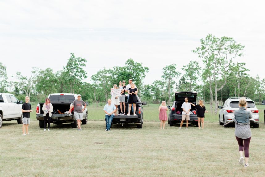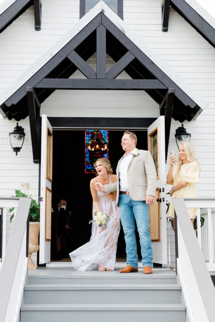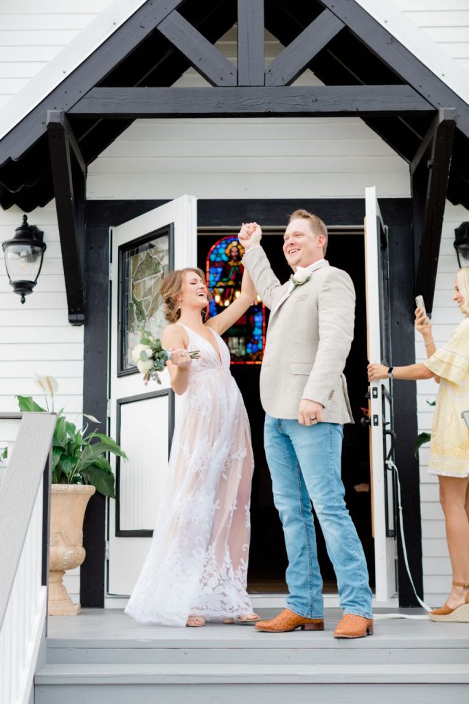 From the bride: “There are several things you worry about when planning an outdoor wedding in Texas. Will it be too hot? Will it rain? What dresses and suits are the most comfortable for the weather? A global pandemic never even occurred to us. Four weeks before our April 10th wedding, we had to make the heartbreaking decision to postpone all of our plans and wait for a safer time to get everyone together. This meant contacting every vendor to make changes and praying they were all available on the same day, throwing away everything we had made or purchased with a date on it, and contacting each person off of our three-hundred-and-fifty-person guest list. We contemplated waiting until our rescheduled date in July, but as our original wedding date grew closer, I just couldn’t imagine not marrying my best friend on the day we had planned for so long. We were brainstorming location ideas when my sister’s in-laws offered their property. A few years ago, they began building a quaint little chapel on their property in Dickinson, Texas. They would randomly work on it from time to time, but when we needed a place to get married during a nationwide shutdown, the whole family pitched in to finish. They spent days out there cleaning, landscaping, finishing last-minute details, mowing to create a parking lot area, and even laying a walkway so I could wear heels. April 10th rolled around. I woke up in my bed at my parents’ house. My sister painted my nails, and I talked to my bridesmaids on FaceTime. My talented friend, Kelsey Croft, fixed my hair and makeup, and my sister-in-law brought mimosas for us to drink and celebrate while I got ready. We were trying to be super excited and happy, but the day just didn’t feel as special as we had wanted it to be. With only our immediate family present, and several others watching from Facebook Live, my brother-in-law married us in Waymaker Chapel. My photographer who is also my cousin, Weddings by Westy, drove in from College Station to capture all the details. We made our exit walk down the aisle, and our sisters flung the doors open for a dramatic picture effect. We never guessed that our wedding party had been tailgating in the parking lot and were there to celebrate us with signs and cheers! This moment was more special than we could have ever dreamed, and definitely the silver lining in the nightmare that is being a ‘COVID Bride.'”