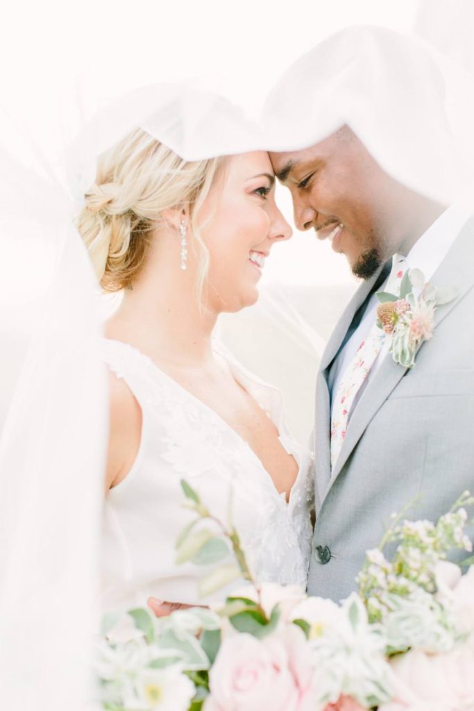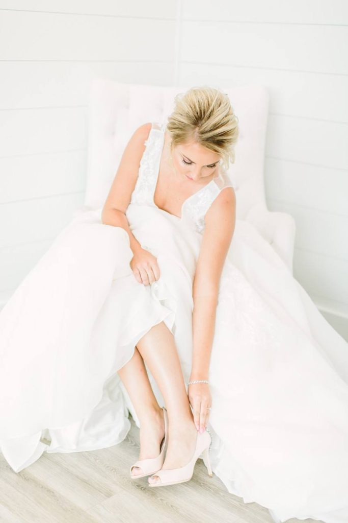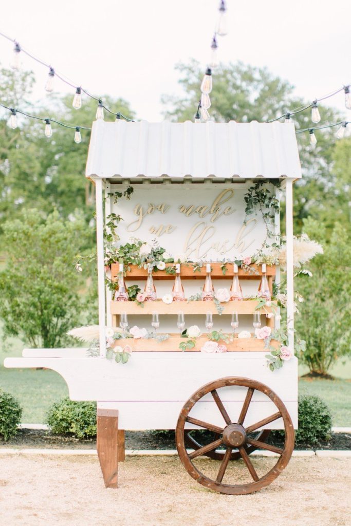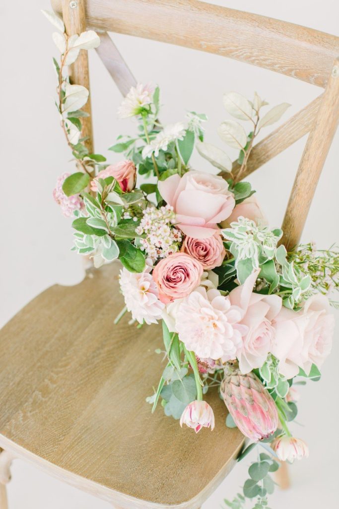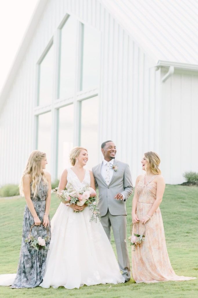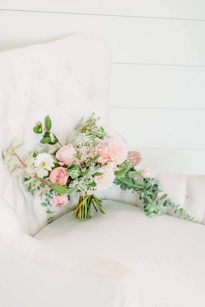 Inspired by the rustic beauty of a Texas garden, this floral farmhouse wedding inspiration features a bright white venue, darling blush pink blooms and gorgeous details throughout! Designed by Lean On Me Events and captured in a light and airy style by Kate Elizabeth Photography at The Farmhouse venue, the abundance of organic florals and feminine flair make this styled shoot one for the books. Thorn Floral Studio knocked the floral design out of the park with their arrangements, from the climbing vines on the ceremony arbor to the crawling table runner, loose bouquets and the circular bridesmaids’ arrangements for the ladies to carry. So darling and unique! The bride and her girls flaunted gorgeous braided boho hairstyles and bold lashes by Adorne Artistry, and the bride’s gown from Brickhouse Bridal features a dropped back and flowy A-line skirt, accentuated by a dramatic cathedral veil. The bridesmaids’ garden-esque floral gowns and coordinating blush pink linens at each place setting, marked by a wreath of greenery atop an ivory lace tablecloth keep the feminine, organic vibes flowing through this floral farmhouse scene, and to us, it’s all dreamy! Cheers!