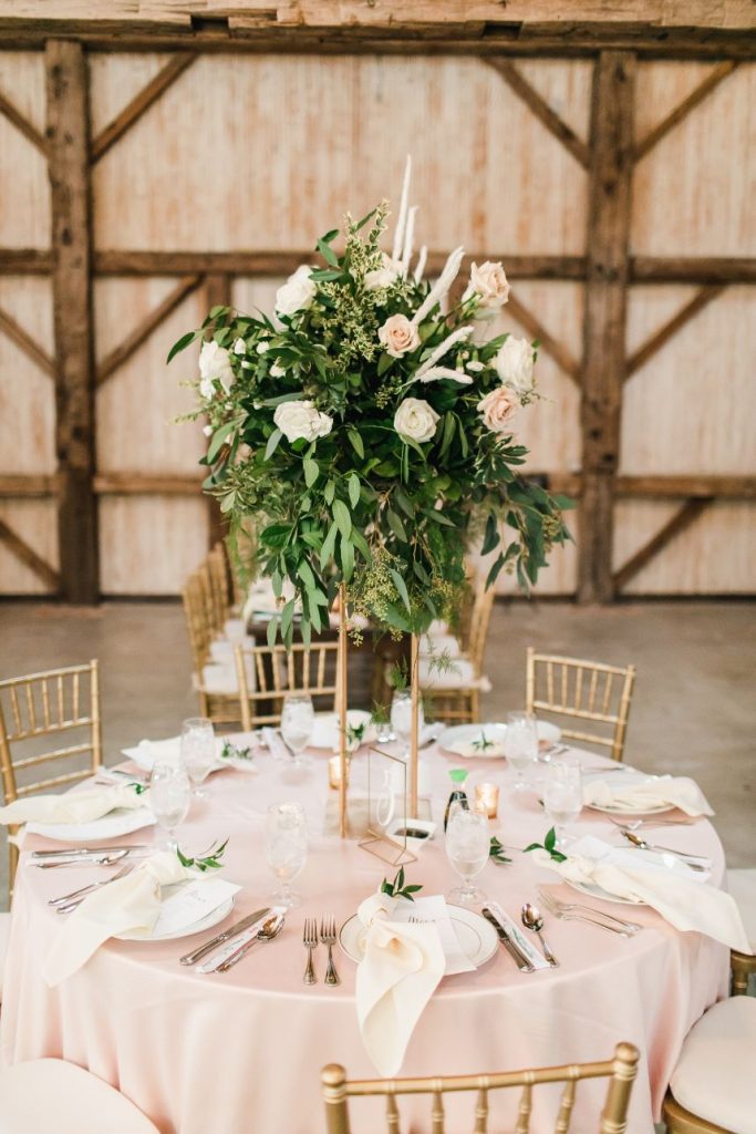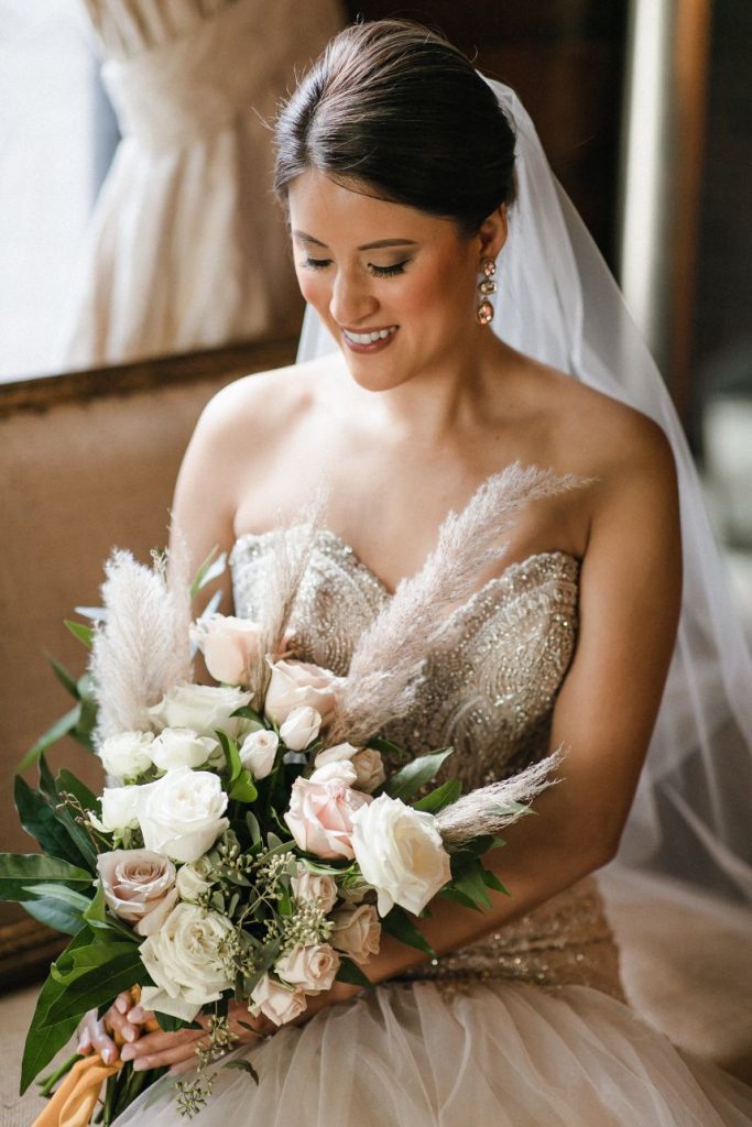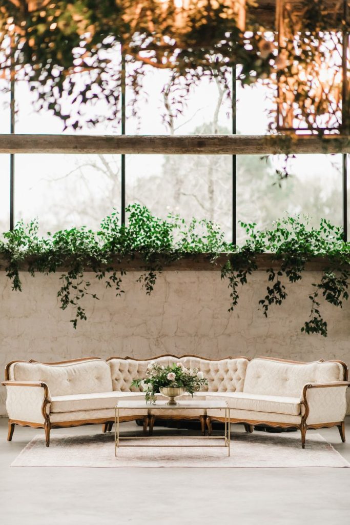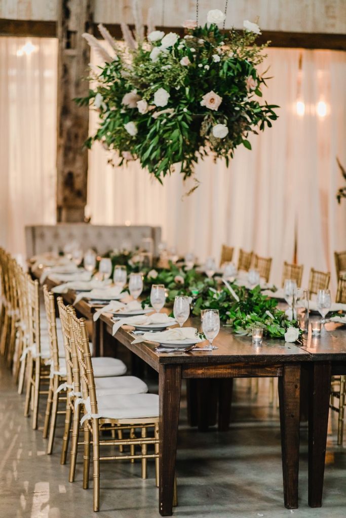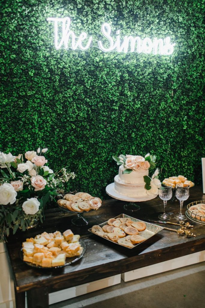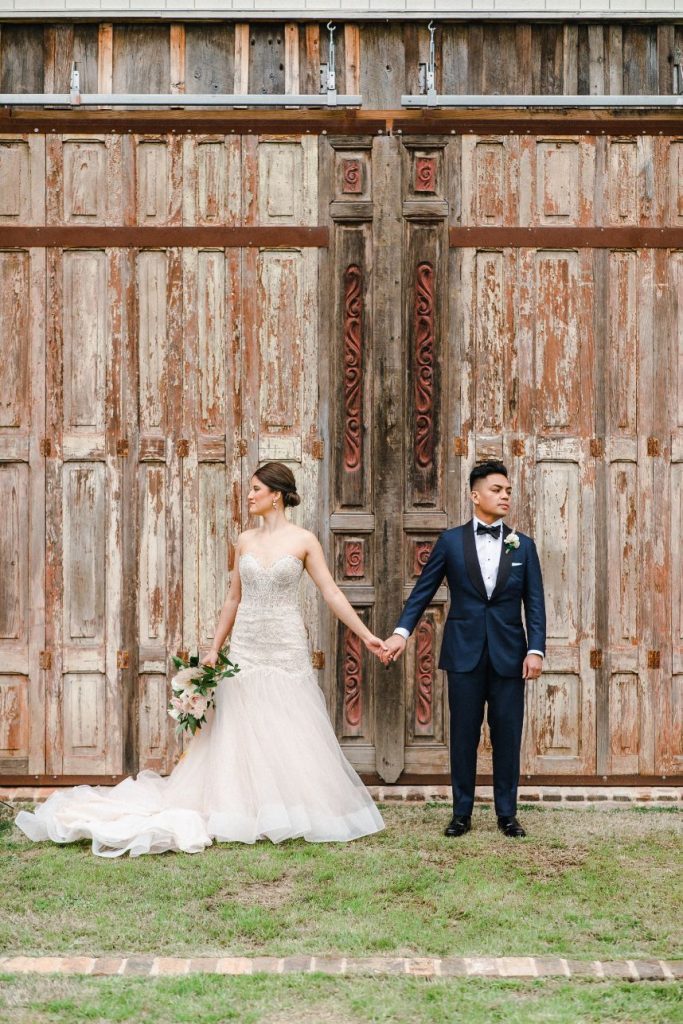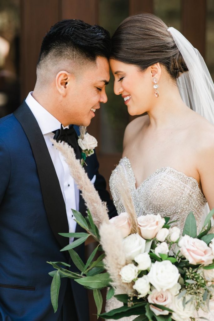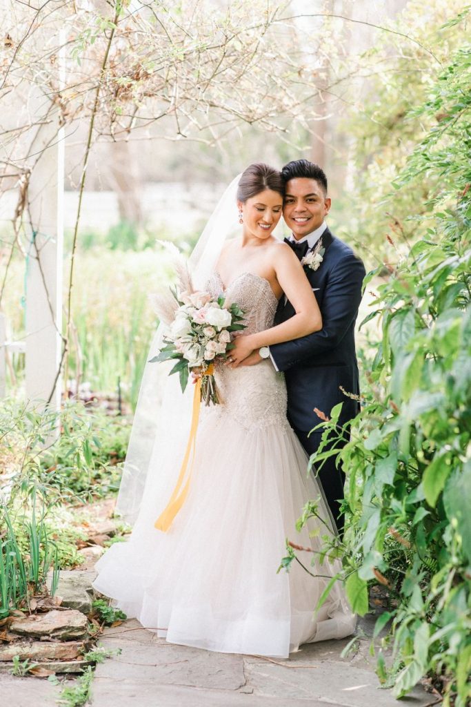 There is so much rustic romance in this forest green and blush wedding captured by BLVD Photography! Utilizing a palette of forest green and blush, Kim and Marc’s wedding scenes showcase a rough-around-the-edges rustic and romantic set up featuring tons of greenery, pampas, rentals and other amazing pieces from Love Birds & Co.! With a few subtle, boho details and some adorable, flashy neon, this well-rounded wedding has it all! Kim is a beautiful, blushing bride with hair and makeup artistry by Hey Lovely, and we love the way artists styled her with a flawless warm brown eye and rust-colored lip as well as an elegant, chic updo. She is truly a showstopper donning a lovely Essense of Australia beaded mermaid gown from Whittington Bridal matched with the prettiest flowing veil to accompany! Both bride and groom have something haute to flaunt on their left hand too – Marc’s silver wedding band perfectly complements Kim’s radiant oval-shaped diamond, both from The True Gem of Dallas. All the heart eyes! Kim and Marc’s love for each other is so apparent, and we think they threw the perfect forest green and blush wedding to celebrate. Read on to hear a note from the bride about what she learned from the wedding planning process and her advice for brides-to-be! Cheers to Kim and Marc!