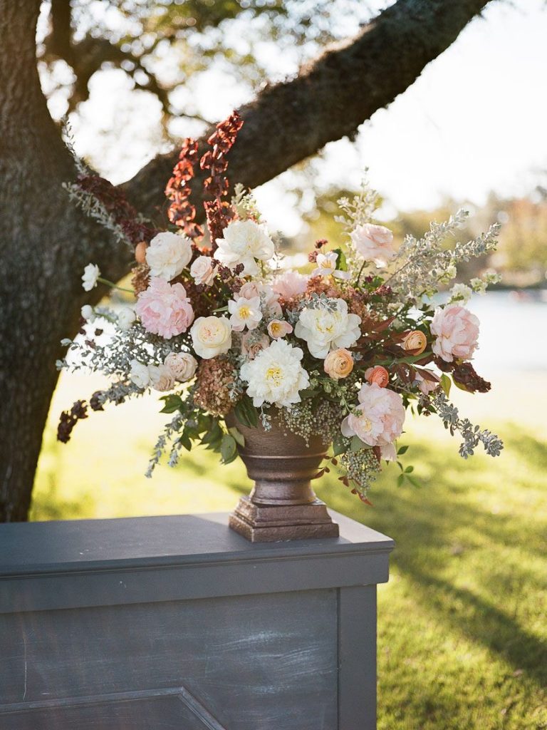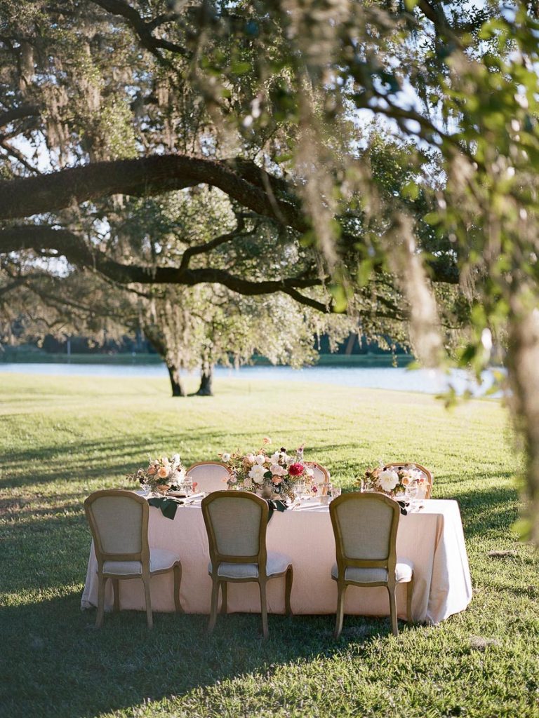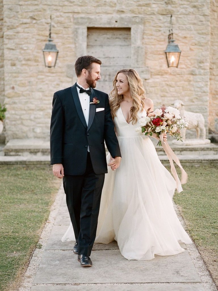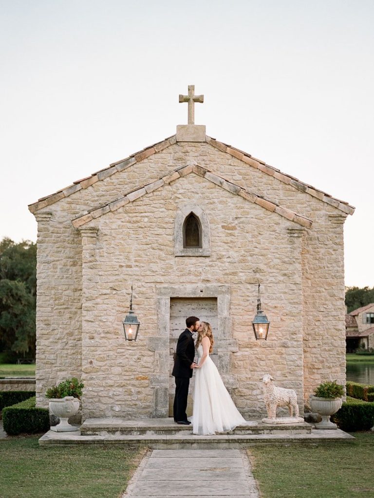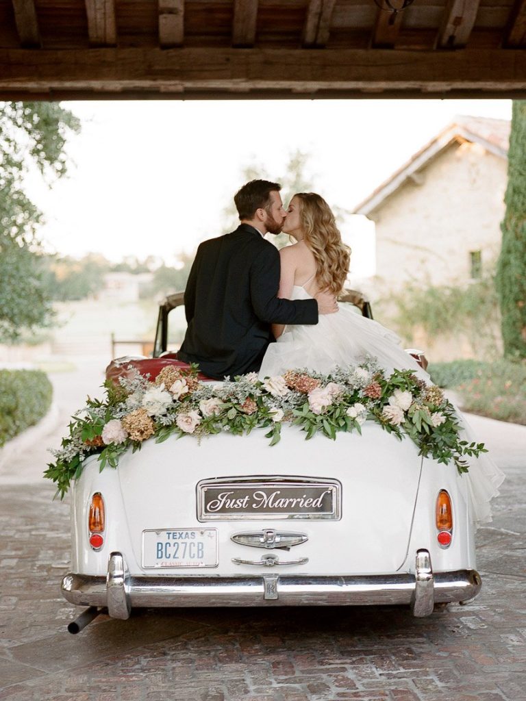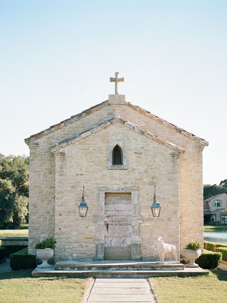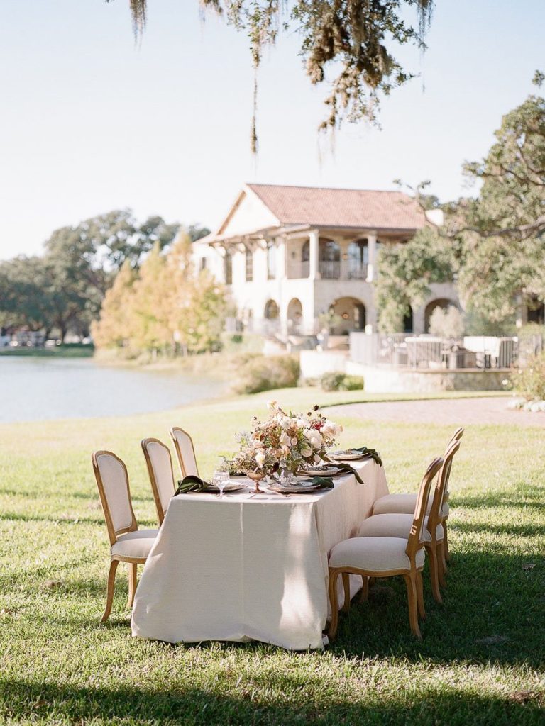 From the planner: “As Davy and Skylar first started brainstorming for this editorial, an inspiration couple took shape. Their couple would want to bring Old World glamour to the natural Texas countryside. Their design goal was to meld a love for European travel with an appreciation of the South. They knew instantly there was no other choice than The Clubs at Houston Oaks! They have a 15th-century chapel that was brought over from France. The palette started with a soft primary group of blush, cool grey and gentle green, brought to life through vibrant burgundies, antique golds, forest greens and rich, peachy tones. They set up the tablescape beneath the soft overhang of the oaks dripping in Spanish moss. The simple semi-naked cake with edible gold details absolutely shimmered in the soft evening light. She + Him Bartending whipped up a plethora of custom cocktails all inspired by the Europe-meets-Texas vibe. A favorite detail was the 1960s Rolls Royce, the perfect getaway car for the happy couple.”