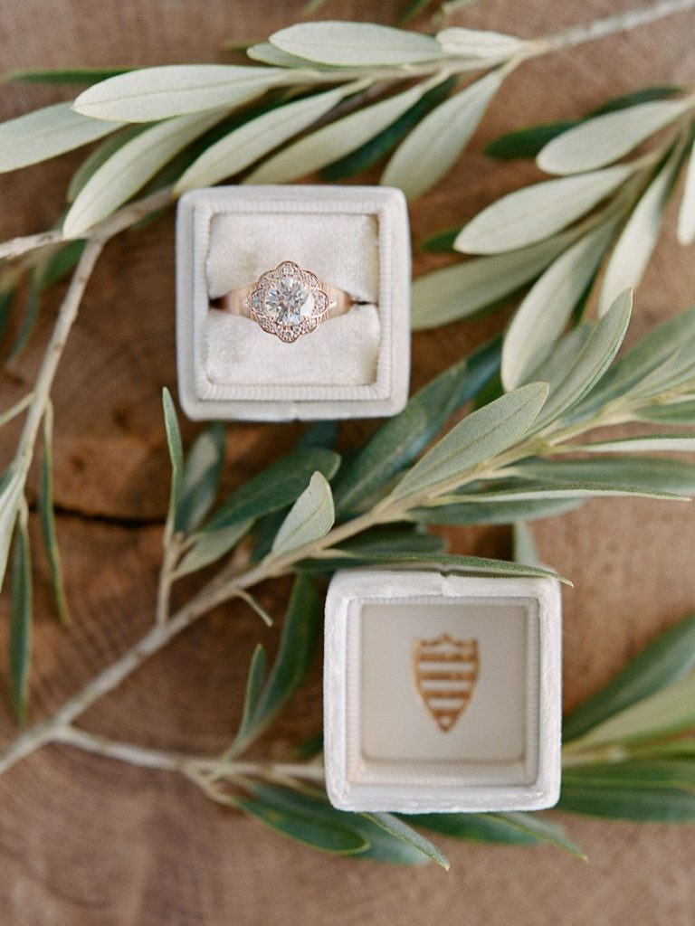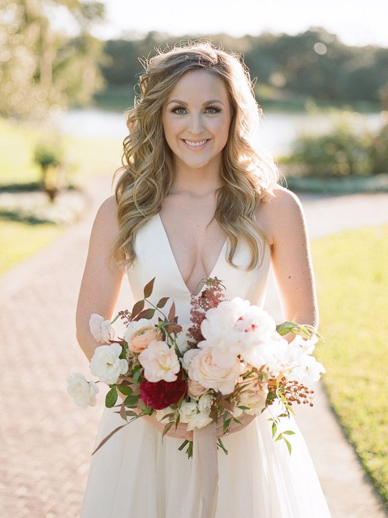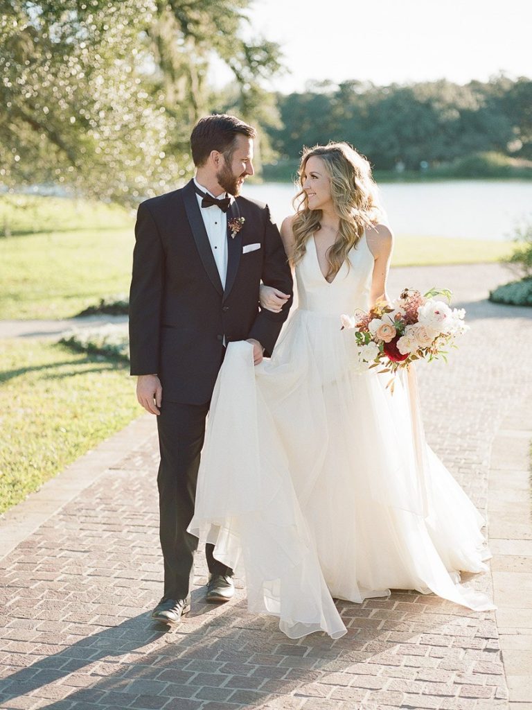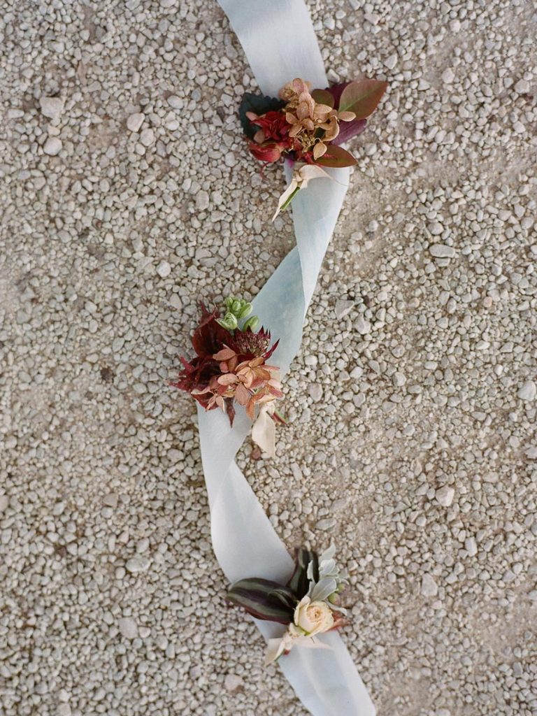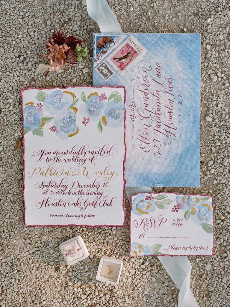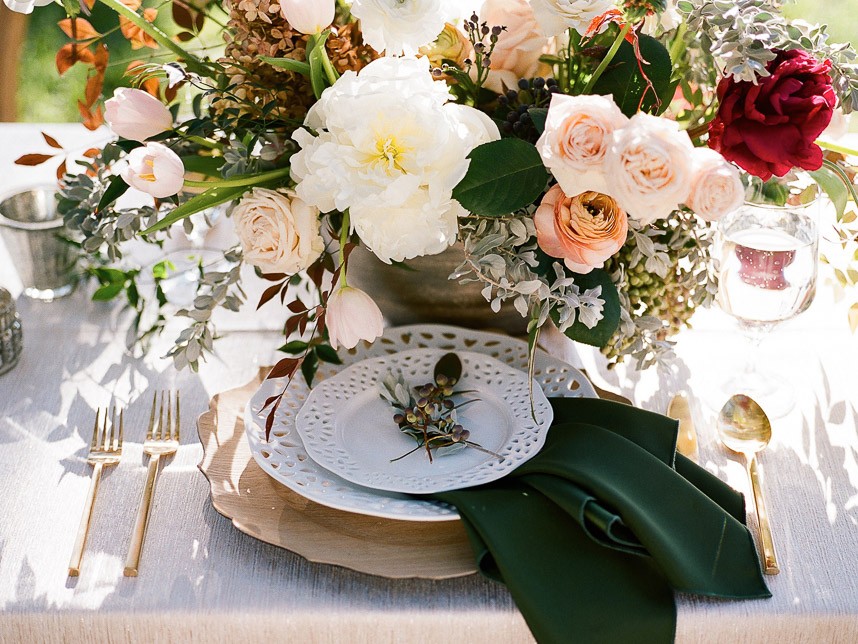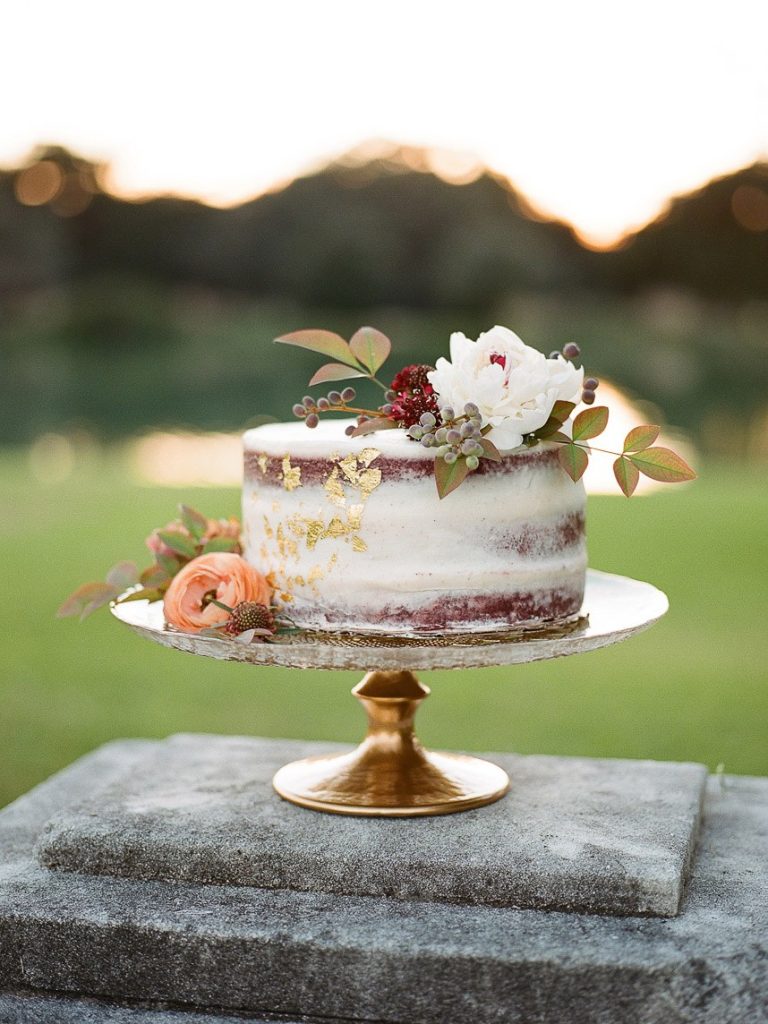 From the planner: “As Davy and Skylar first started brainstorming for this editorial, an inspiration couple took shape. Their couple would want to bring Old World glamour to the natural Texas countryside. Their design goal was to meld a love for European travel with an appreciation of the South. They knew instantly there was no other choice than The Clubs at Houston Oaks! They have a 15th-century chapel that was brought over from France. The palette started with a soft primary group of blush, cool grey and gentle green, brought to life through vibrant burgundies, antique golds, forest greens and rich, peachy tones. They set up the tablescape beneath the soft overhang of the oaks dripping in Spanish moss. The simple semi-naked cake with edible gold details absolutely shimmered in the soft evening light. She + Him Bartending whipped up a plethora of custom cocktails all inspired by the Europe-meets-Texas vibe. A favorite detail was the 1960s Rolls Royce, the perfect getaway car for the happy couple.”