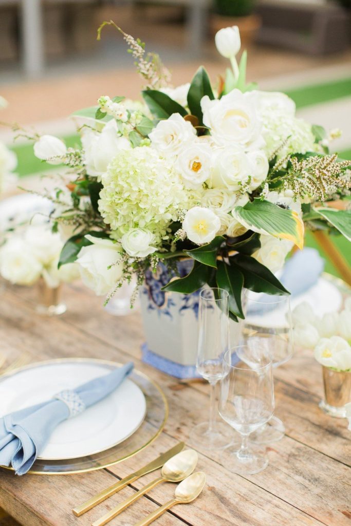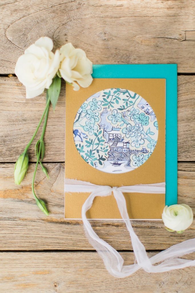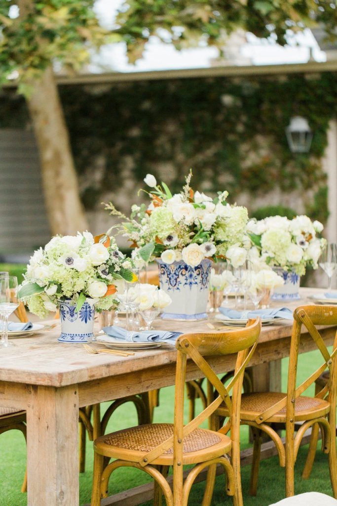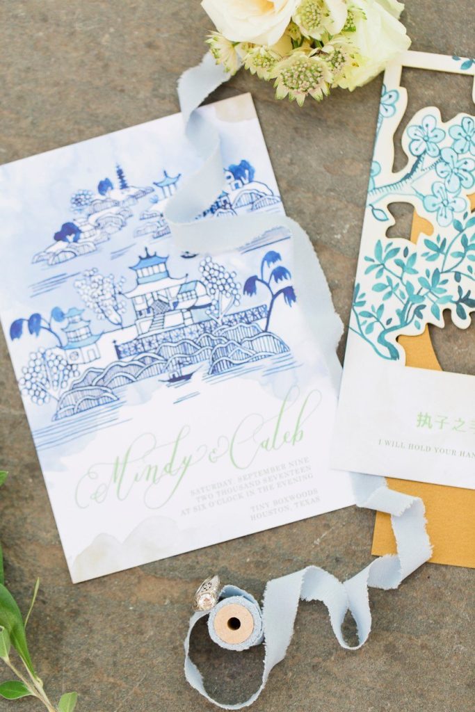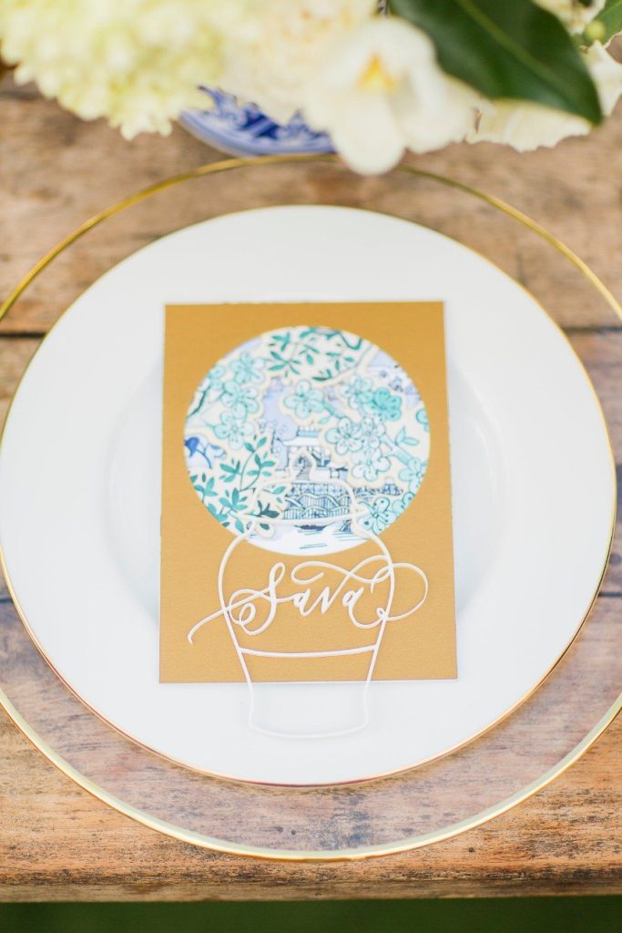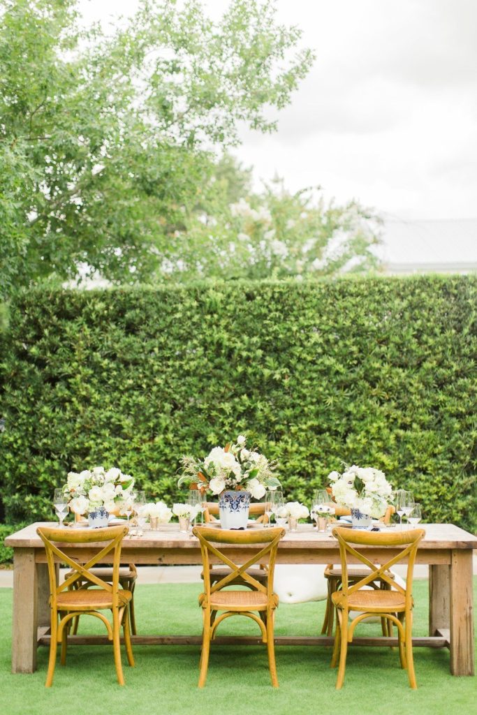 We’ve seen chinoiserie – a classic blue and white pattern – make its way into several celebrations this year, and this garden chinoiserie styled shoot works just beautifully with it as the theme! Dreamed up by Sava Sipe of Houston wedding planners Two Be Wed, this quaint scene gives a fresh, modern twist to the timeless blue pattern, pairing it with bright ivory blooms and lively greens from Lanson B. Jones Floral. Keeping with the color scheme, the model groom wore a dapper blue suit, while the bride donned a gown with a classic silhouette, paired with fresh, natural hair and makeup by Hey Lovely. A weathered farmhouse table and wooden chairs were juxtaposed against the china pattern to help the whole scene feel approachable and fresh. We’re especially obsessed with the stationery and how it carries the pattern so eloquently from the invitation suite to the place cards – the laser-cut detailing is such a thoughtful detail! With plenty of dark and light blue touches, like the tufted ceremony seating and linens bringing texture to the scene, this garden chinoiserie shoot has everything we could want and more. Cheers!