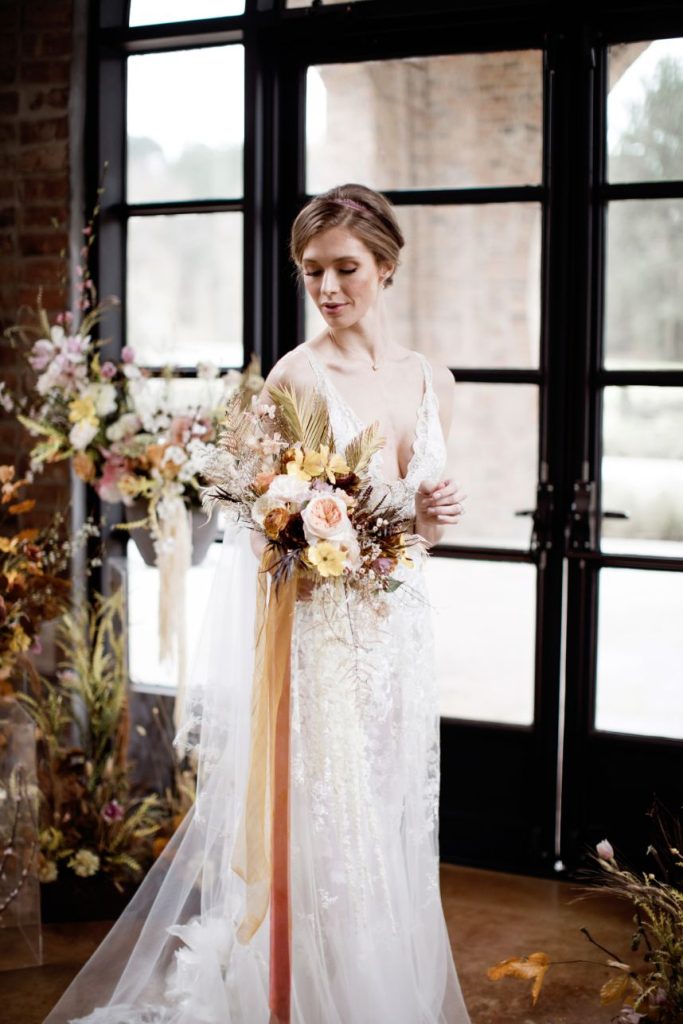 Vintage details and wild floral come together to create this perfect garden party wedding inspiration! With planning and design by Alyssa Meeks Events, it’s no wonder that this styled shoot is an absolute showstopper. Moody wedding scenes depict a vintage love story from darling Tiffany blue glass and bar cart details in the bridal suite to cigar lounge-style groom portraiture. Candlelit tablescapes donning vintage linens convey a feeling of coziness, nostalgia, and oh-so-much romance only exacerbated by incredible floral design. Edges Wild Studio absolutely lived up to their name creating free-spirited floral arrangements of autumnal wildflowers, dried grasses, cascading sun-bleached amaranth and botanicals of all shapes and sizes that make these low-lit wedding scenes come to life. If your aim is to be wed among the flowers, then this vintage, wildflower-filled garden party wedding inspiration is exactly what you need. Cheers!