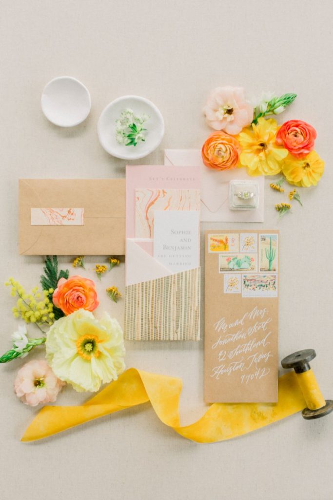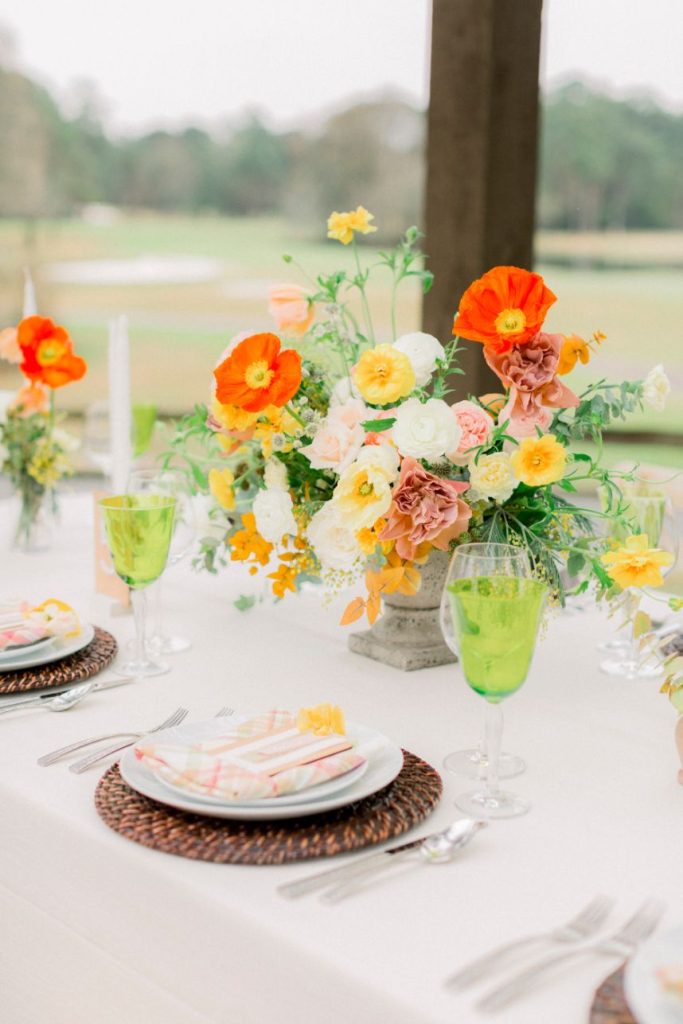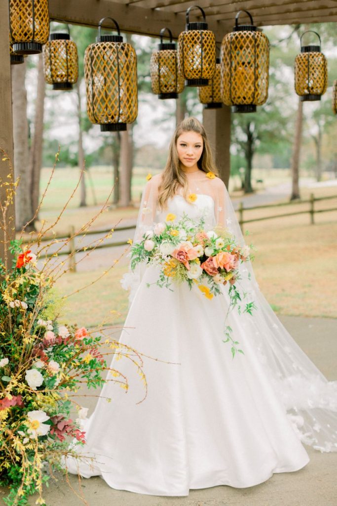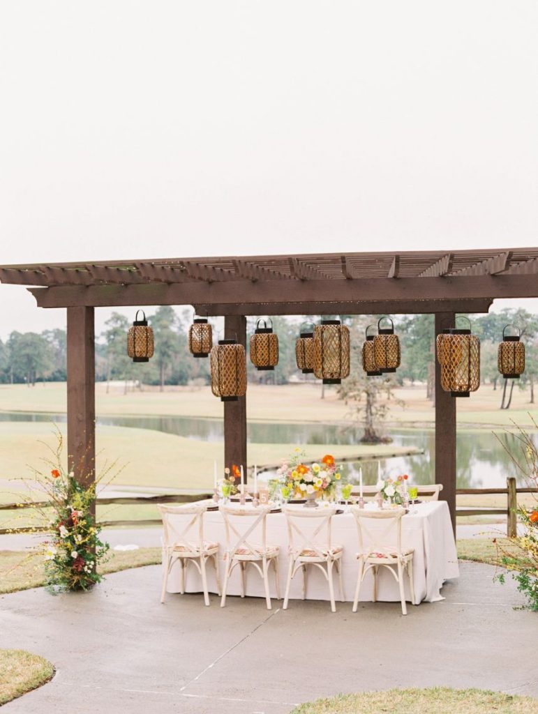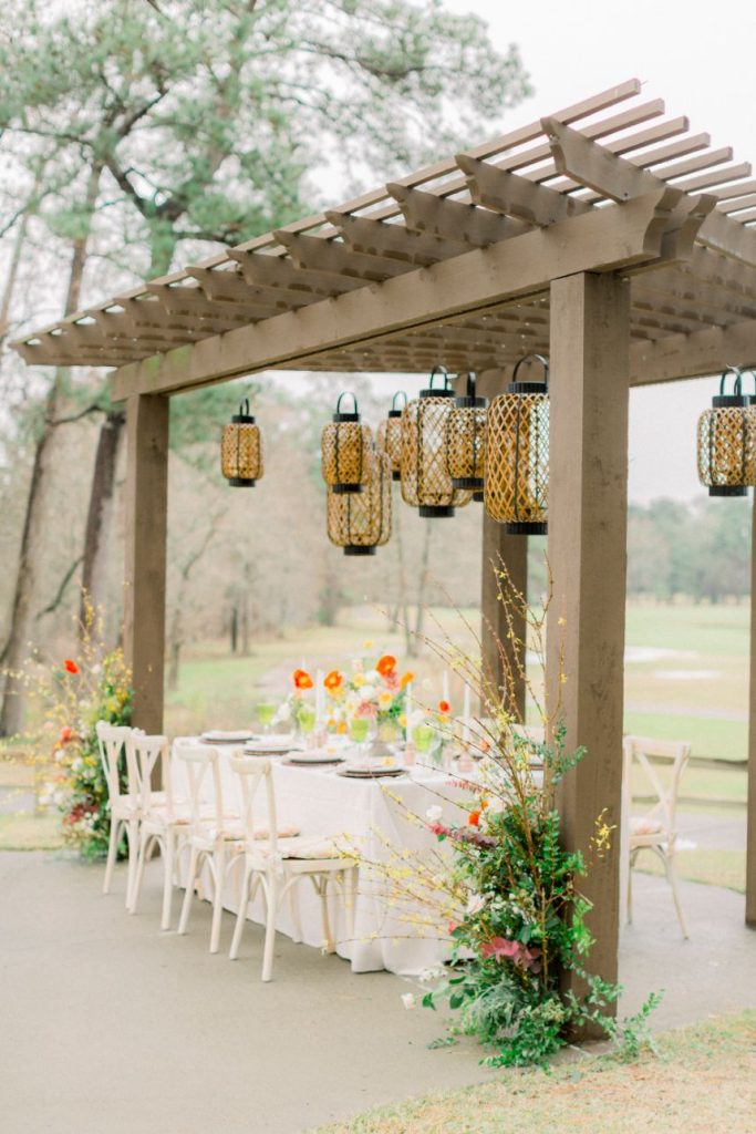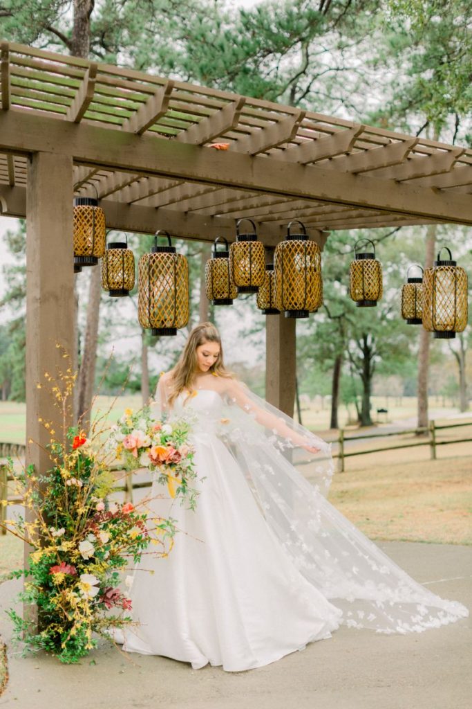 This garden party wedding inspo takes elements of an afternoon picnic and elevates them to a whole new level! Whimsical notes and bold tones such as orange, peach, yellow and green all work together beautifully without becoming too busy, thanks to thoughtful design styling from Alyssa Meeks Events, timeless photography by Fulleylove Photography and beautiful details from a talented Houston vendor team on display at The Clubs of Kingwood! We can’t help but first notice the striking florals: organically arranged, fresh and bright blooms from Bramble & Bee. Two distinct bridal looks from Whittington Bridal also share the stage here, one paired with a striking hat and the other with a long, whimsical appliqué veil and fine jewelry by Uptown Diamond. Adorne Artistry help to complete each bride’s look – one inspired by Meghan Markle and the other, Bridget Bardot. Lavish Linens provided some of the more colorful and textured linens, while EB Inc. and Swift + Company helped to complete the al fresco tablescape with wooden chairs and wicker chargers alongside crisp white dishes and fun colored glassware, respectively. Half Moon Lettering worked her stationery magic with layered, textured paper details in a slew of pretty colors. We love the way this team used the natural surroundings to their advantage, picking colors that really pop and using pieces like the hanging lanterns and plaid linens to bring a different vibe to the space. A simply gorgeous garden party! Cheers!