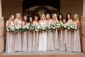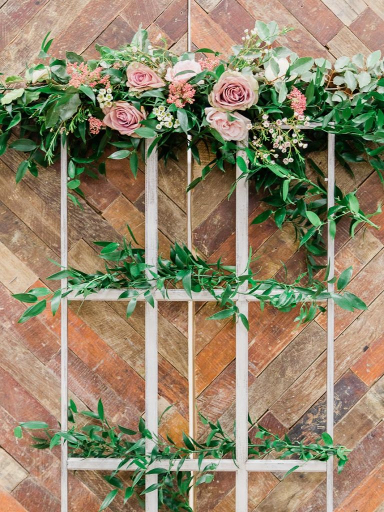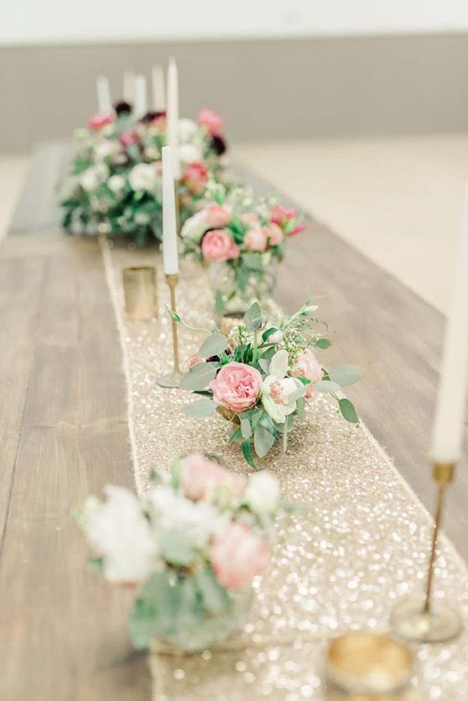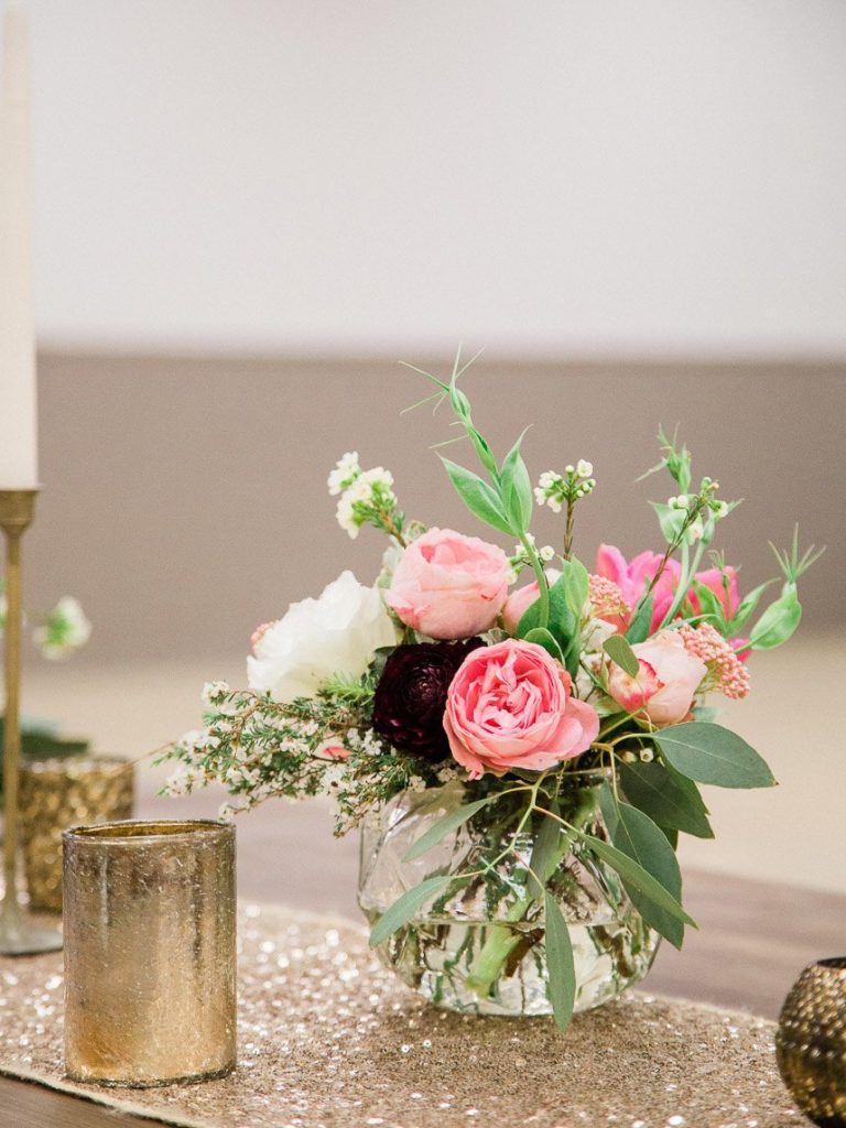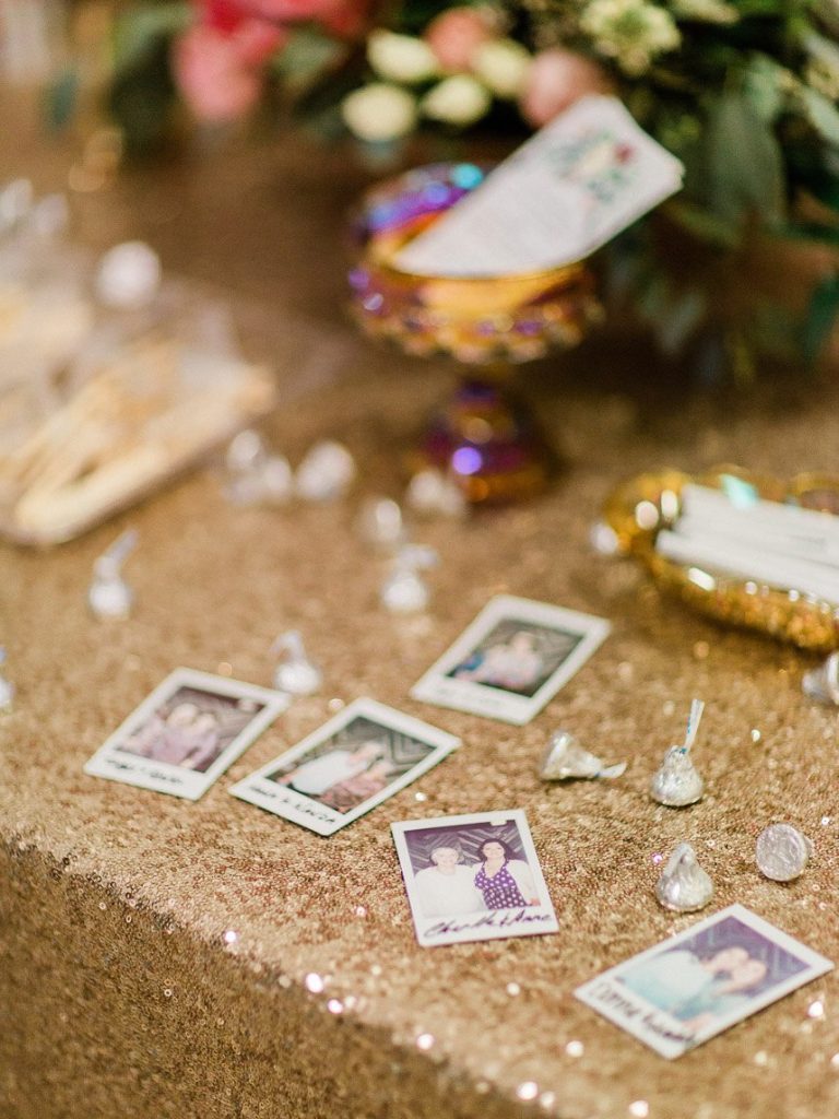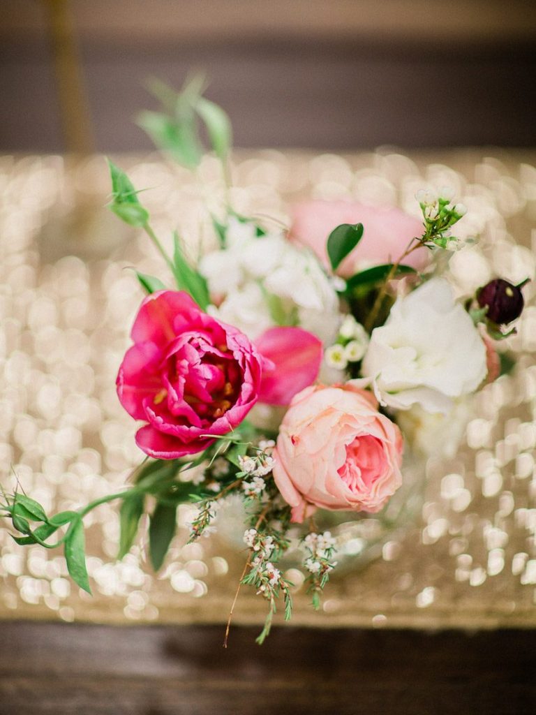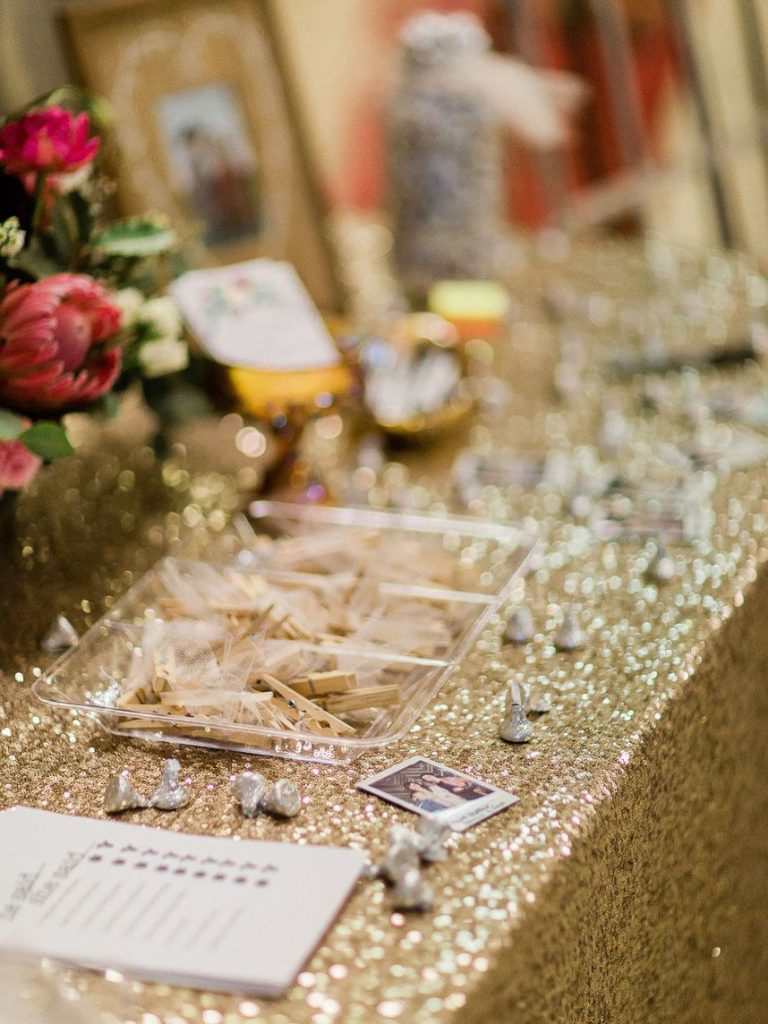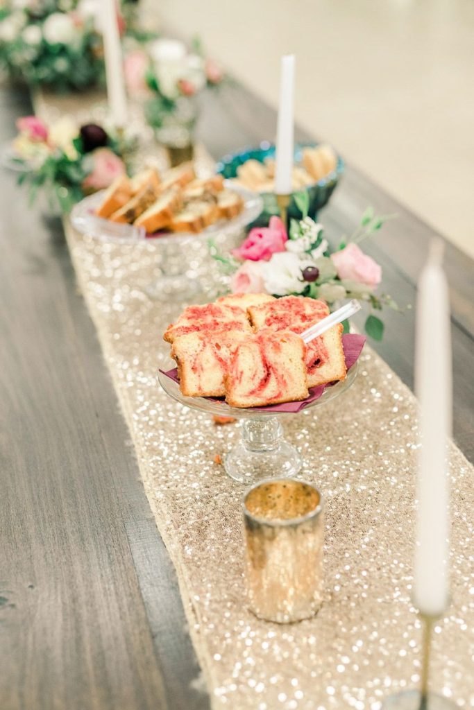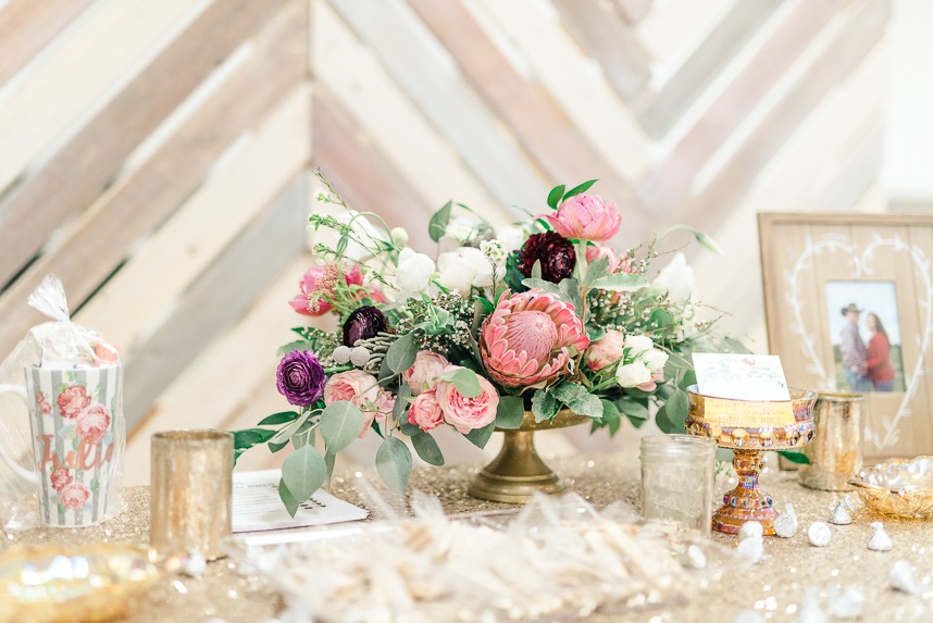 From the planner: “This party was a joy to create for so many special reasons. Not only is the bride a dear friend, but she was also the brilliant florist behind the designs you see pictured. We had a blast pairing the lush arrangements with some glitz and sparkle interspersed. The unique design of the arrangements with Protea and blooming tulips did a great job of relaying the unique feel of the event. Our desire to create a large lounge area for the guests guided our color selection of soft pink with pops of maroon throughout. And we can’t forget about the loose feeling of the greenery that pulled together each design. The sparkly table cloth at the entrance and the matching runners along two farm table from Vestige Event Rentals pulled all the aspects of the room together. Guests were met upon entering with a polaroid camera and a Sharpie to be used as a guest book alternative (totally unique and cute idea provided by sister of the bride)! We also provided a place for guests to start Mary off on her wedding adventure with their favorite tried-and-true recipes she and her hubby-to-be could enjoy cooking together. Gifts were opened and conversation was enjoyed with light snacks, tea, lemonade, and of course, some classic Sunday afternoon mimosas. Guests then enjoyed a few bridal shower-themed games such as “Guess The Age” that had pictures of the bride from ages 1-10, “He Said, She Said” where guests could guess whether the bride or the groom were first to set relationship milestones, and “Say Yes to the Dress” that got all guests involved in creating fun toilet paper wedding gowns. Finally, before saying goodbye, everyone got to take memorable pictures with the bride in front of the herringbone/chevron wall. It was a beautiful day full of laughter and love, and we had a blast transforming the simple venue into glitz and glam fun for all who attended!”