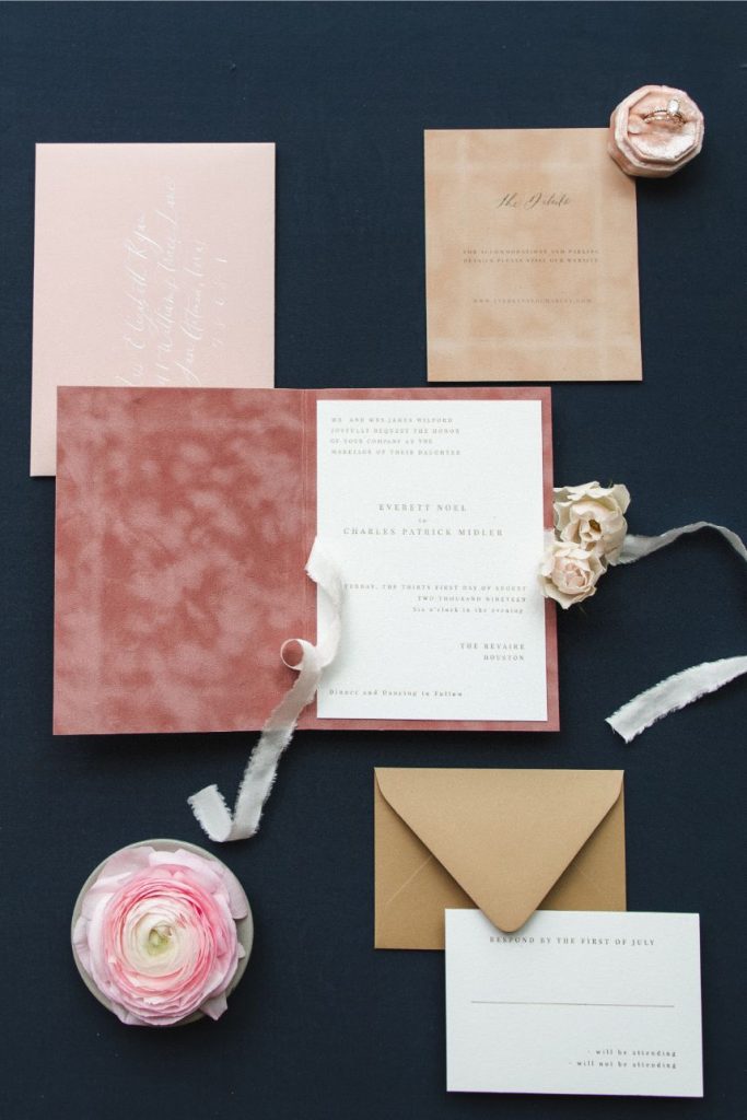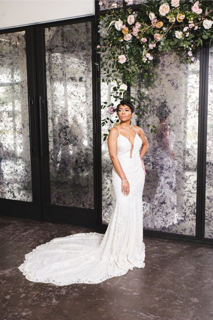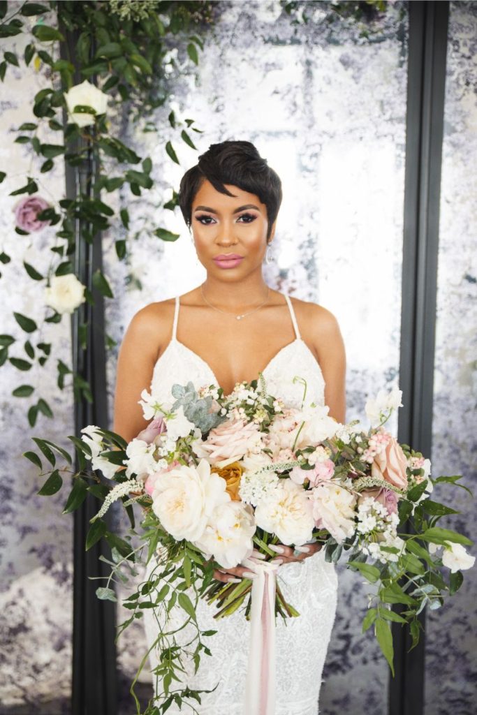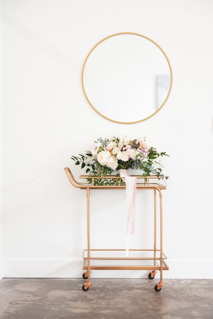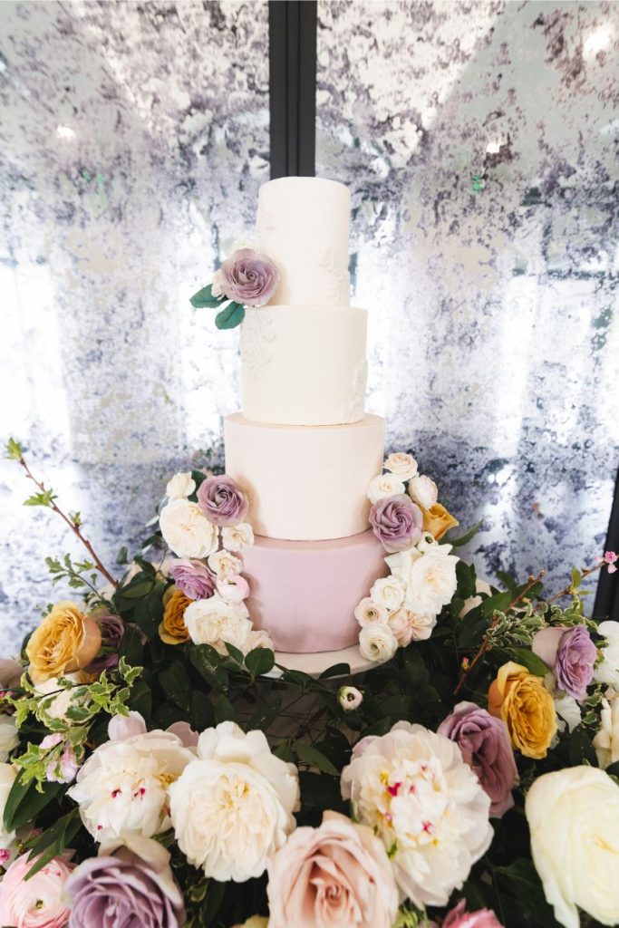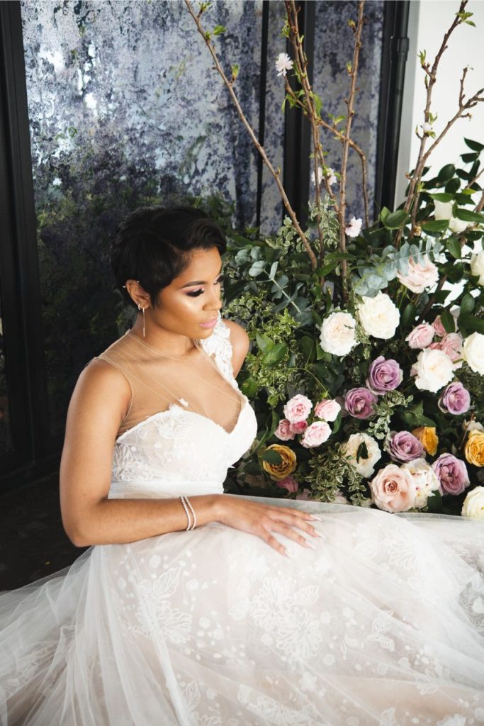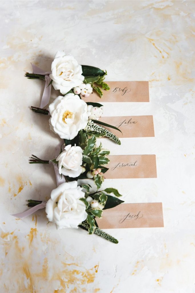 Glam meets ethereal in this stylish scene, and we simply can’t get enough! Contrasting textures and tones are the name of the game here, with mauve, lavender, black and white playing off each other to create tons of visual interest everywhere you turn, from the tiered, floral-adorned cake by Becca Cakes to the amazing blooms and beyond. Brushed gold modern accents and the mercury glass throughout The Revaire’s space help to add to the contemporary glam aesthetic, while the ultra-feminine gowns from Belle Âme Bridal, soft shimmery makeup and bright, organic florals in blush, ivory and mauve bring in the ethereal aspects. Memory Lane Paperie did an incredible job not only planning and hosting this styled shoot, but on the stationery and calligraphy as well – all the little details from the vow book to the name tags and labels add something special to the scene, with styling assistance from the talented Two Be Wed! Sparkling gems from Uptown Diamond are oh-so-sparkly and swoon-worthy, too. Take a scroll through the images below and be inspired by all the bold, beautiful elements of this glam, ethereal scene!