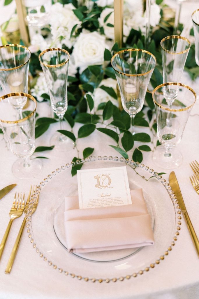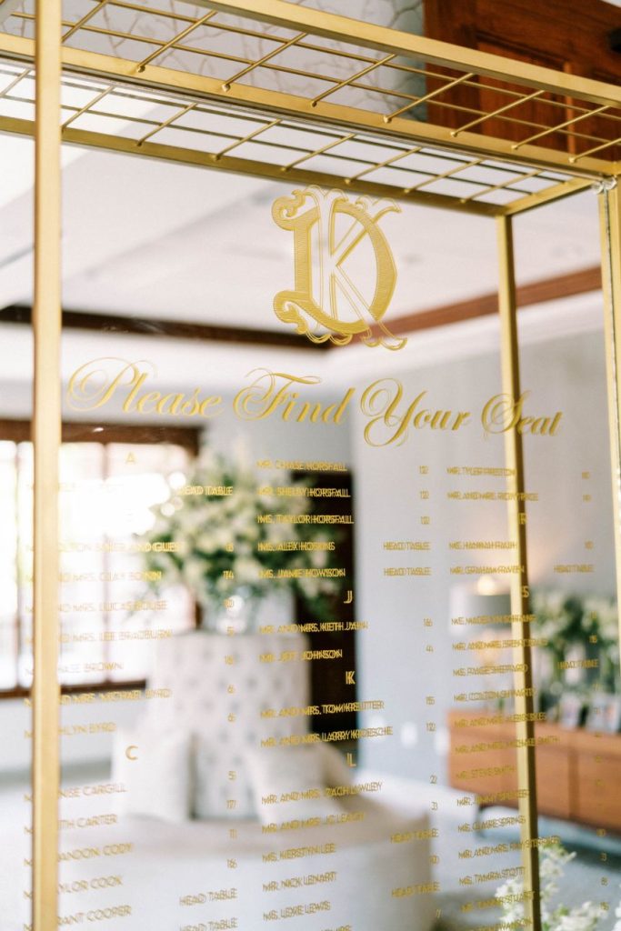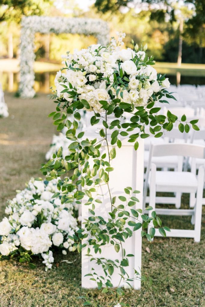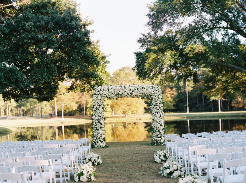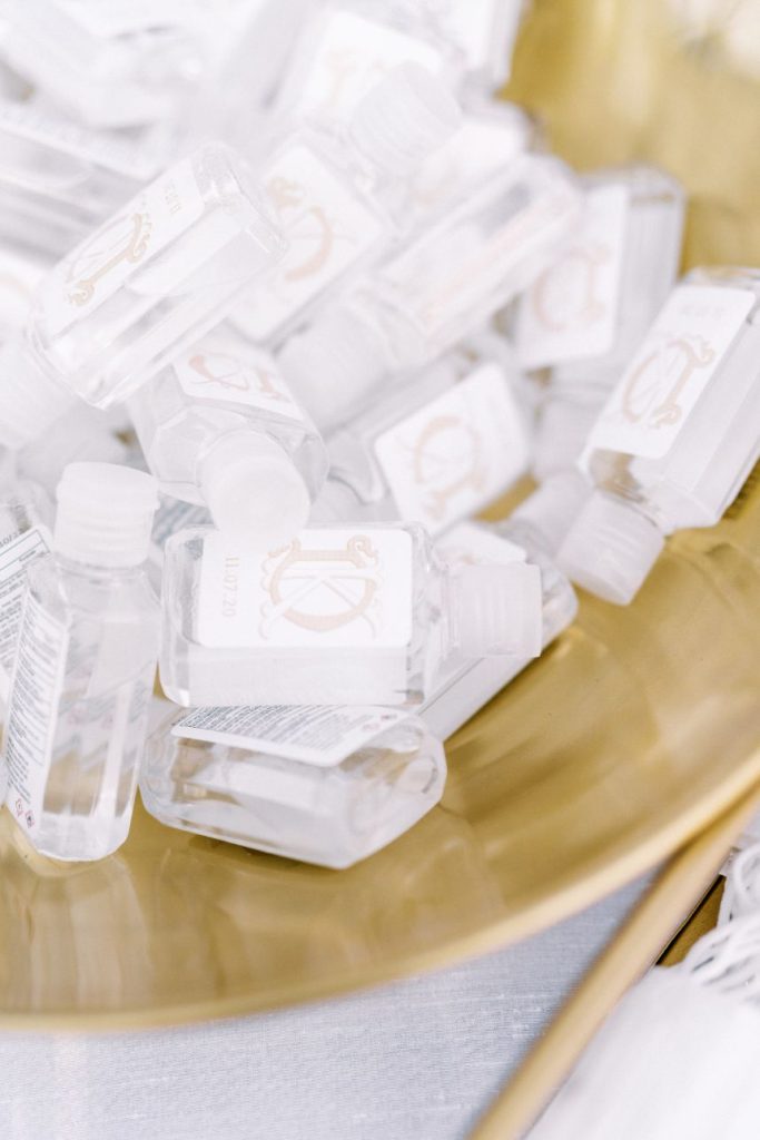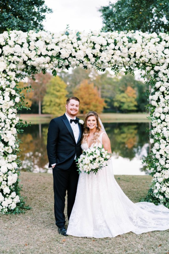 Krystin and Derek’s glamorous white country club wedding at The Woodlands Country Club was decked out in the most stunning crisp white florals and custom monogrammed pieces – we can’t wait for you to see! The outdoor ceremony was picture perfect with the pond directly behind the white rose altar installation, making the most elegant for the couple’s I dos. Bride Krystin wore a luxe lace A-line gown and accessories from Belle Amê Bridal, and to top it off, she also sported a stunning shimmery makeup look with volumized curl by Etoilly Artistry. Upon entering the ceremony, mini-monogrammed hand sanitizers and masks were on hand for guests, and while we despise the impact COVID-19 has had on weddings, we must say this is the cutest safety measure. The floral-lined aisle looks like it must’ve been a scene straight out of Martha Stewart’s wedding manual, and we can’t even imagine how many jaws dropped during this ceremony.