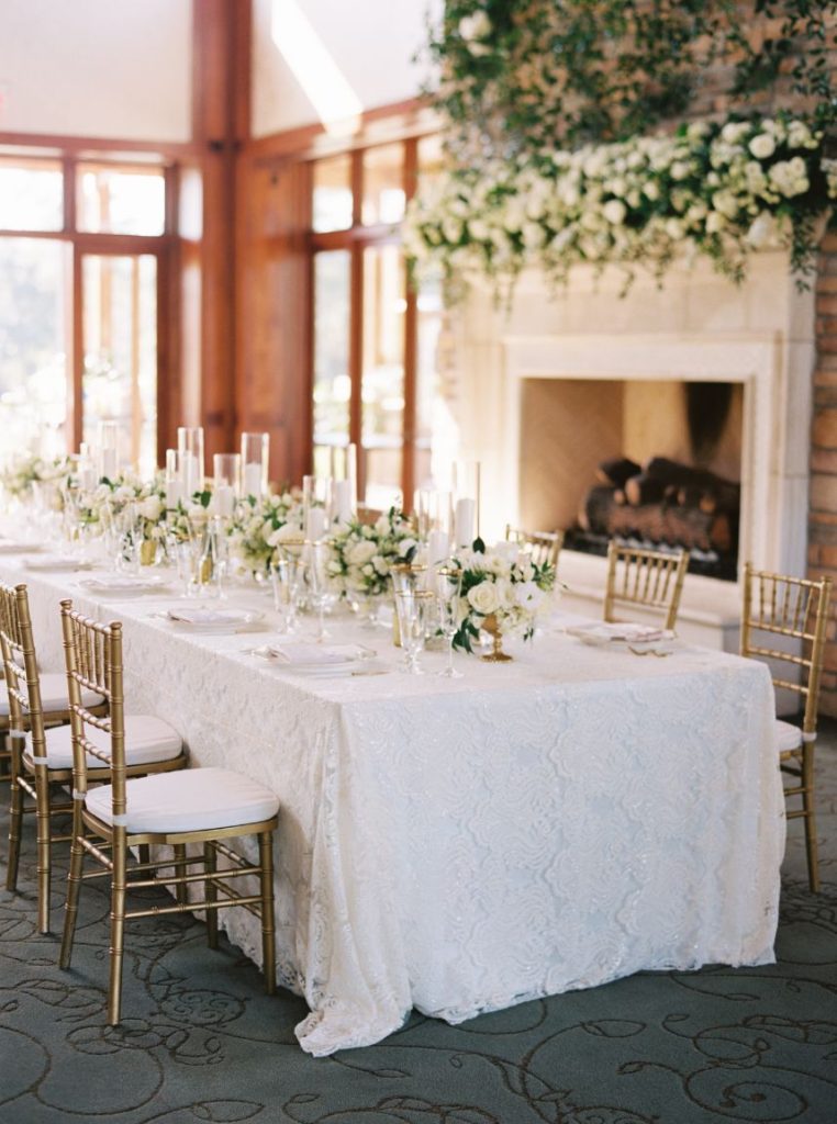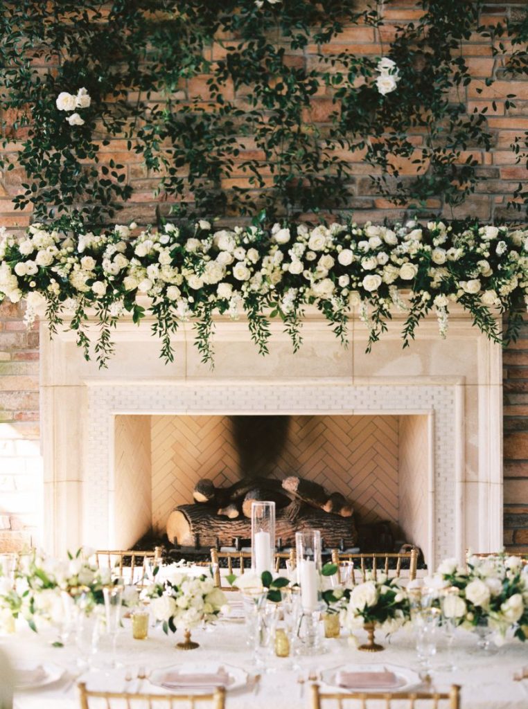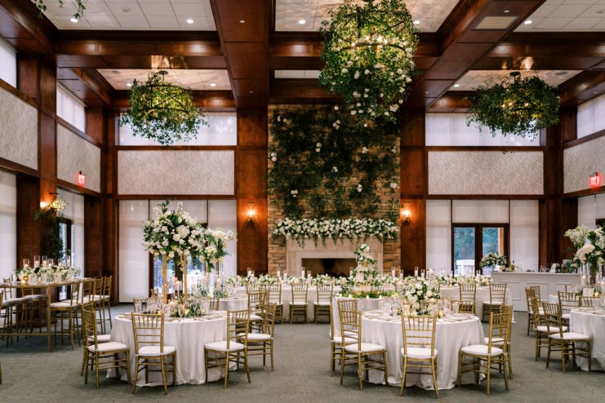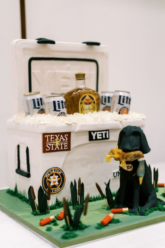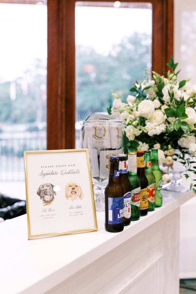 Ivy hung from the fireplace and all around the light fixtures, adding the most romantic touch to the reception’s traditional theme. Large white rose centerpieces stood on each table alongside gold dinnerware, creating a Pinterest-worthy feast. The bar featured a watercolor illustrated print of the couple’s two dogs which their signature cocktails were named after. The personal touches don’t stop there; Cakes by Gina‘s groom’s cake featured a Yeti cooler and the couple’s dog in front. Get your mouse hand ready, because you’ll want to pin all the images from this glamorous white country club wedding!  Cheers to the Johnsons!