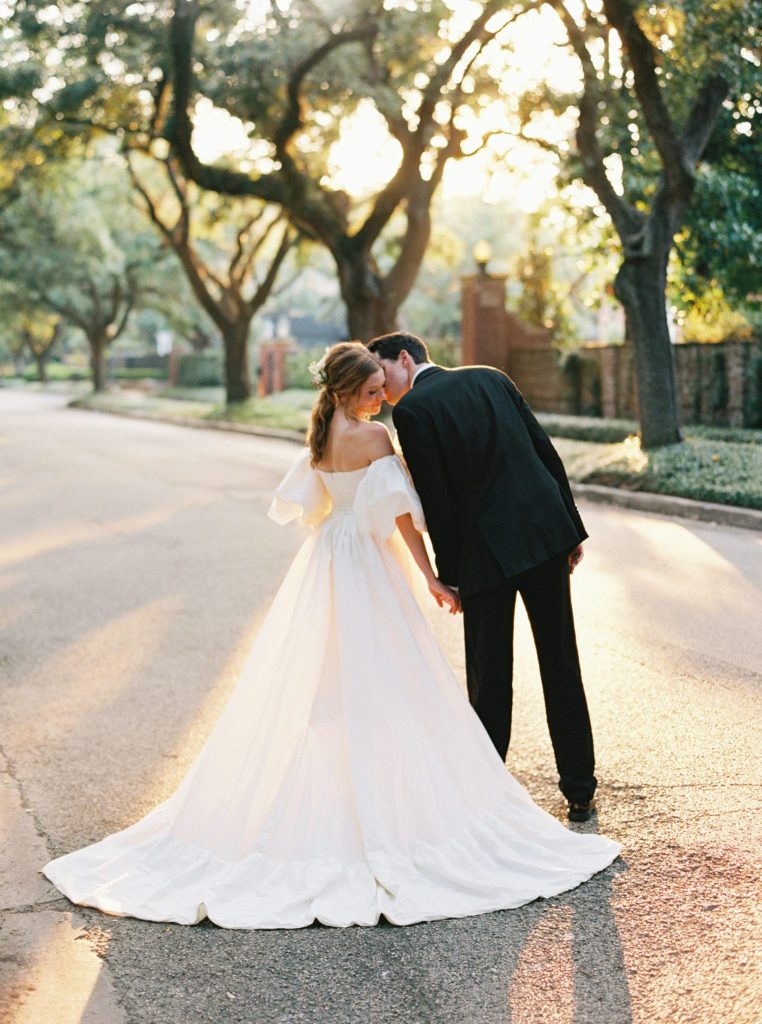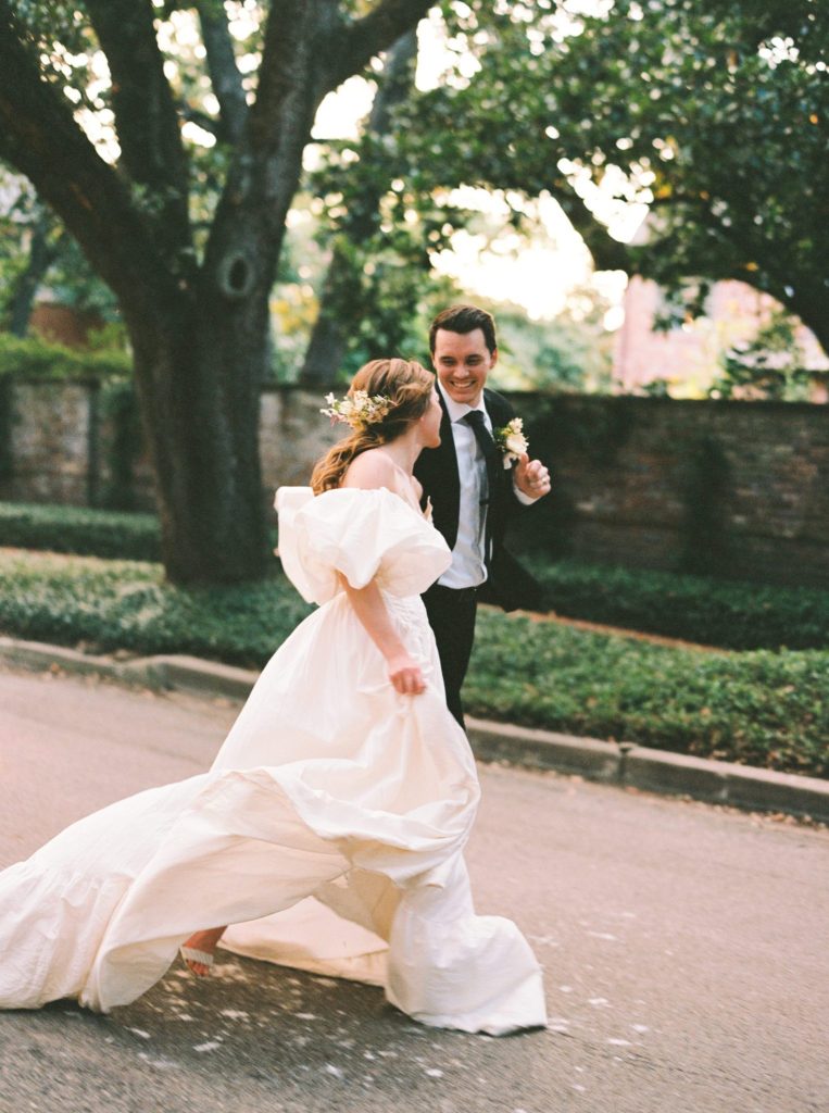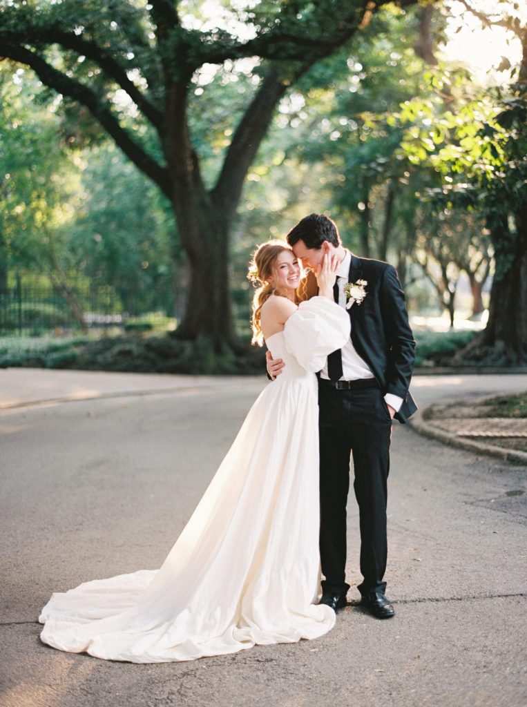 Escaping to Boulevard Oaks, Grace and Cole’s elopement shoot transported everyone to a bygone era of romance. The scene, reminiscent of the Victorian or Regency periods, featured windswept hair, classic brick paths, and wrought iron fences. The tangible love between the couple, married in May 2023, was beautifully complemented by the whimsical, unstructured garden florals. Sage Floral Co‘s cascading bouquet, filled with creamy white blooms and sweet honeysuckle, and the delicate floral hair comb, featuring local berries, jasmine, and delicate blooms, added a heavenly scent to the romantic atmosphere. The flowers perfectly captured the essence of their timeless love story!