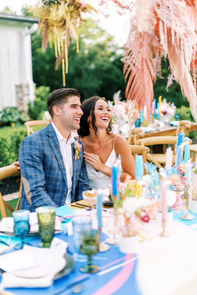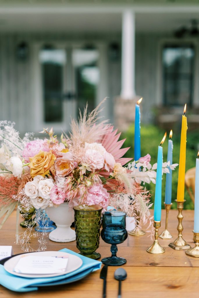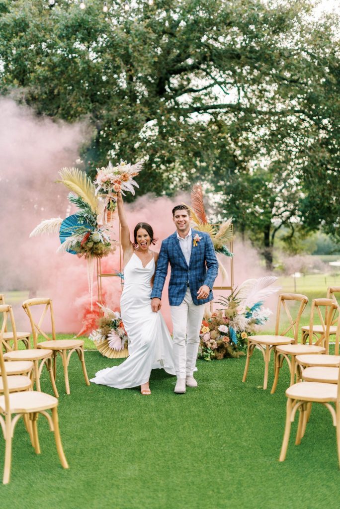 As if straight out of the eclectic, Baroque style streets of Havana, this wedding inspiration is bursting with color and energy! Truly “half of our heart is in Havana,” as this lively scene curated by Epoch Co+ has captured our hearts and taken us to a place absolutely full of tropical, boho feels that embodies all things warm and lovely. Dried palms in shades of coral, turquoise and sunshine from Unforgettable Floral take center stage alongside muted camel accents, all perfectly placed in the lush courtyard of the contemporary Arrowhead Hill. As an undeniable eclectic mix of vintage, organic and whimsical elements, rentals from Party Time Rentals make all the difference when it comes to creating an effortlessly stunning tablescape, complete with wild bouquets of eclectic blooms and bold pops of color in every element. Our gorgeous model bride steals the show in her sleek, minimalist silk gown, as well as a bridal makeup look created by Etoilly Artistry that screams sunkissed with a soft, dewy glow and a striking red lip. The paperie pros of Lyons Paperie created a playful custom invitation suite that perfectly captured the overall feel of this scene! Besides bringing the fun to just the mailbox, place cards with the same playful details added a little spunk to each place setting of deep turquoise linens and white chargers from Party Time Rentals. Absolutely worthy of a smoke bomb send-off, we no longer see any other logical way to exit your ceremony – with all the fun captured on film by the incredible videographers of The Drakes, you don’t want to miss this editorial in film below! We’ve been transported to the streets of Havana with this editorial and it’s easy to say we don’t see ourselves coming back any time soon – can you blame us? Scroll on to see every eclectic detail of this lively wedding inspiration that is just bursting with color and energy. Cheers!